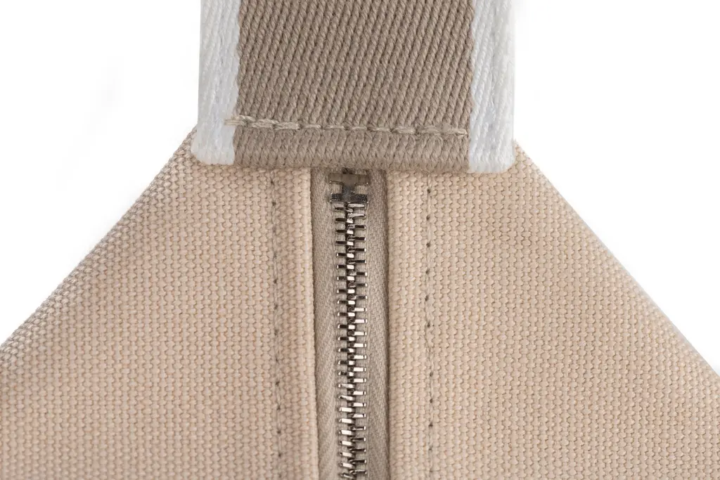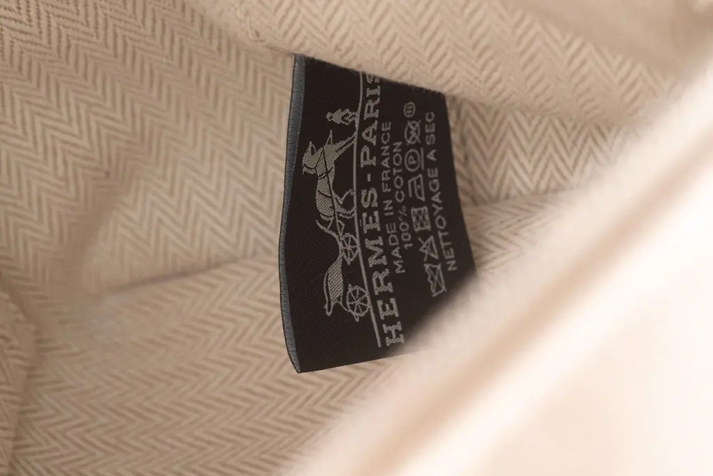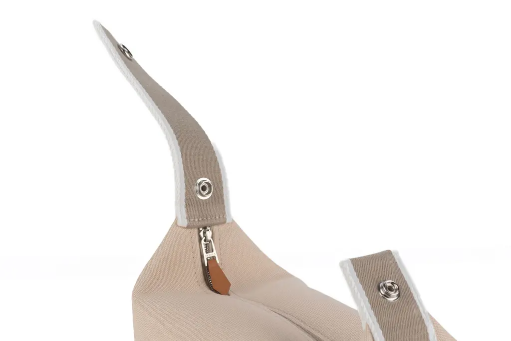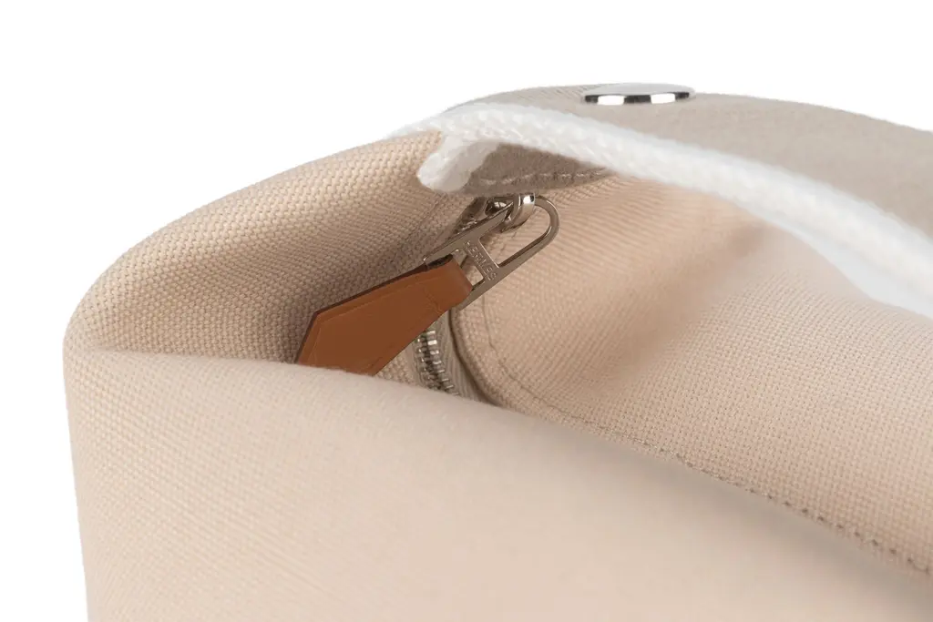 This Hermès Canvas Small Bride-A-Brac Pouch in Natural is crafted of beige canvas. It has a snap closure on the top handle and a grey stripe around the bag. Brand new .