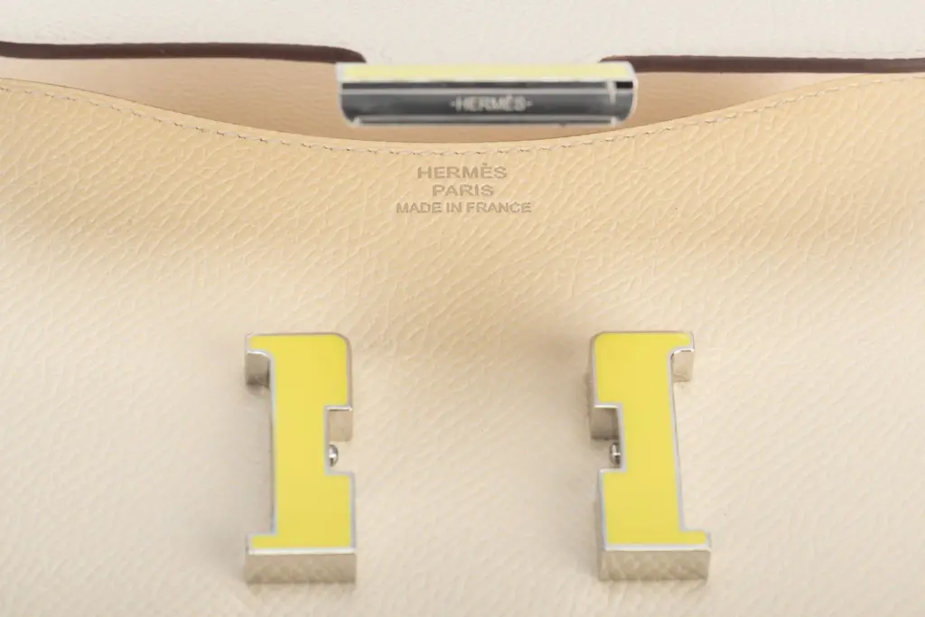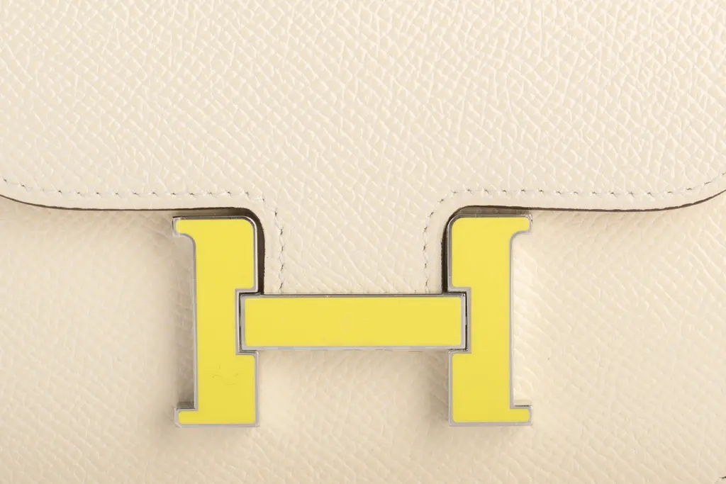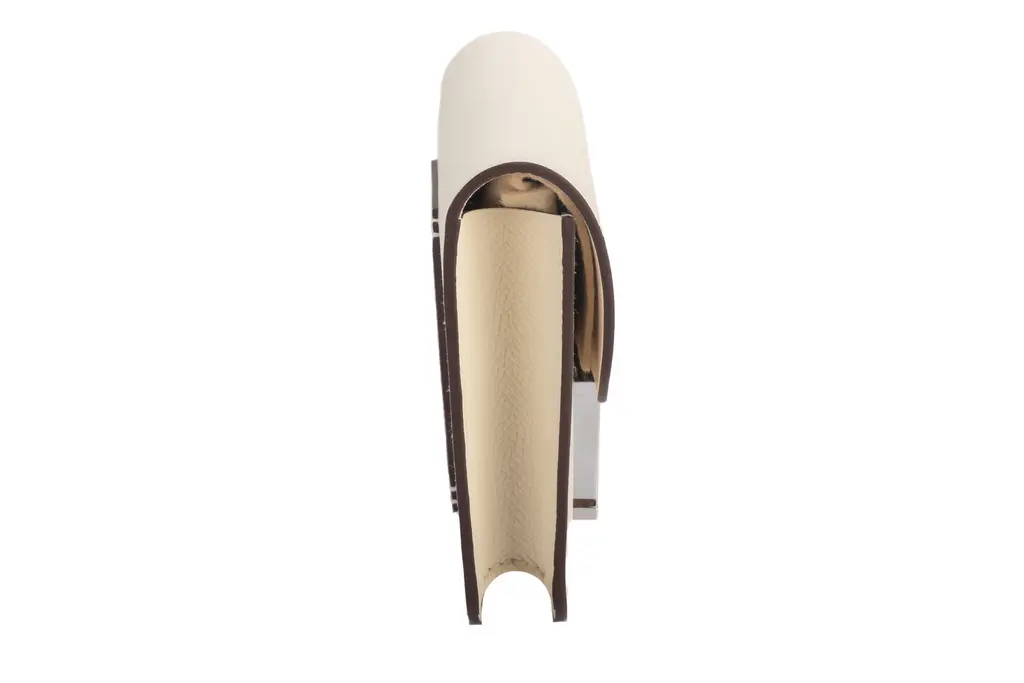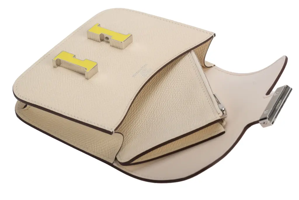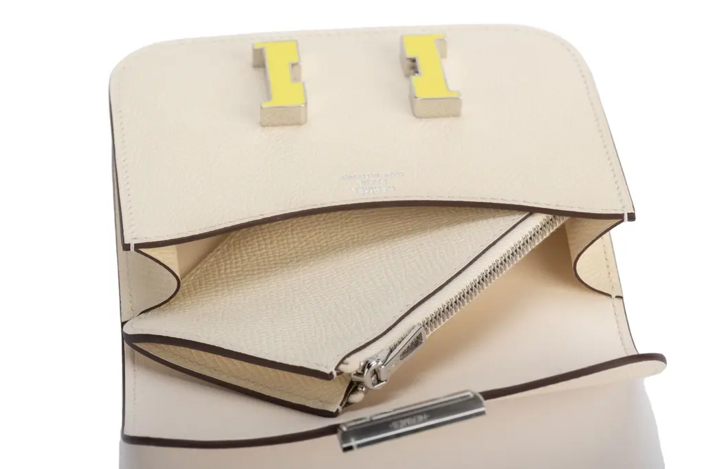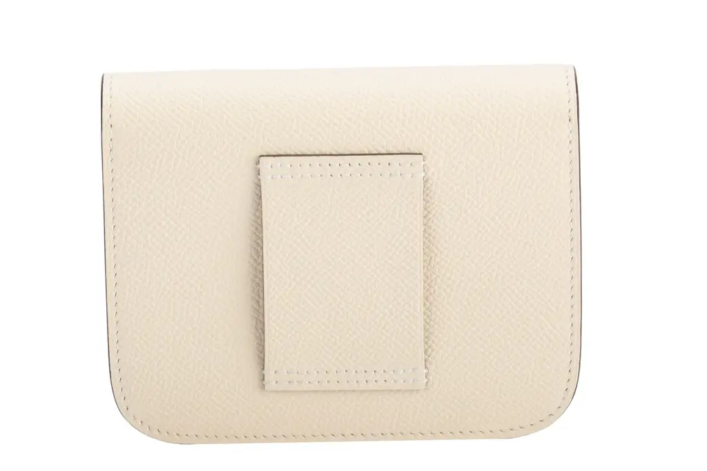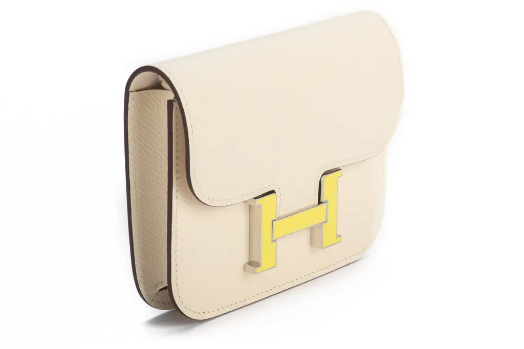 Hermès Slim wallet in craie Epsom calfskin with removable zipped change purse, 2 credit card slots, belt loop and yellow enamel and palladium plated closure. The piece is in the house's color Craie Off White. The item comes with the original dustcover and box.