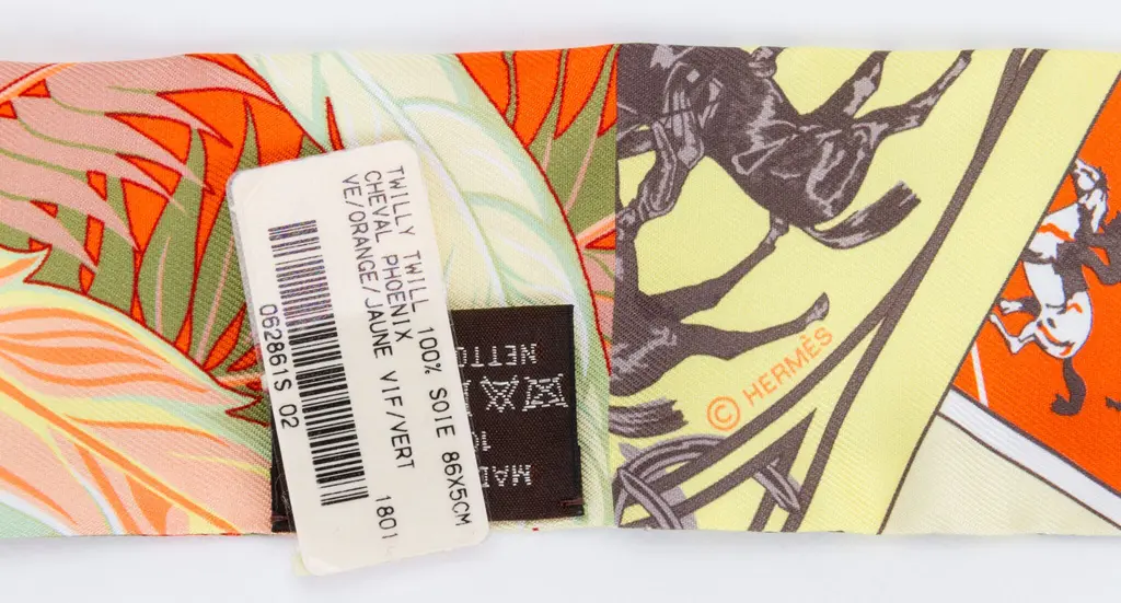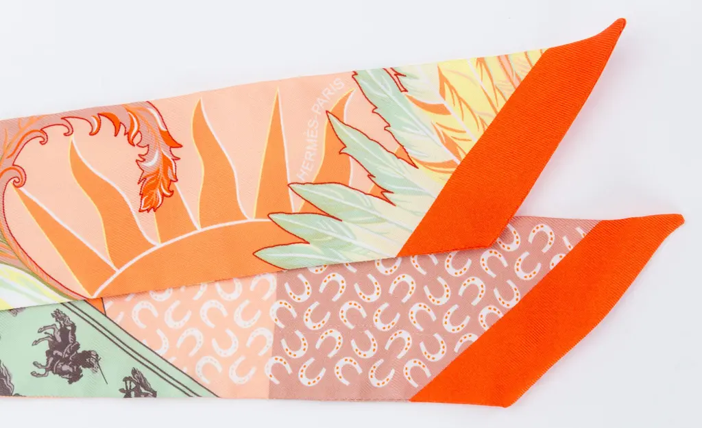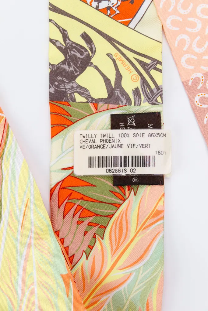 Herm��s 100% silk Twilly with a phoenix design in orange, jaune vif, and green cheval with a palladium Medor metal slide. Can be worn as a bracelet or scarf. New with original box and ribbon.