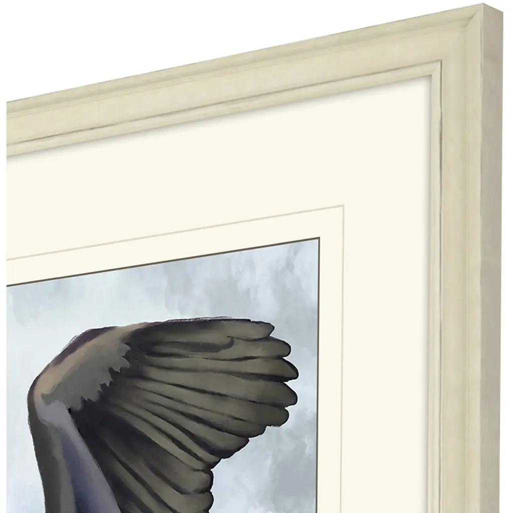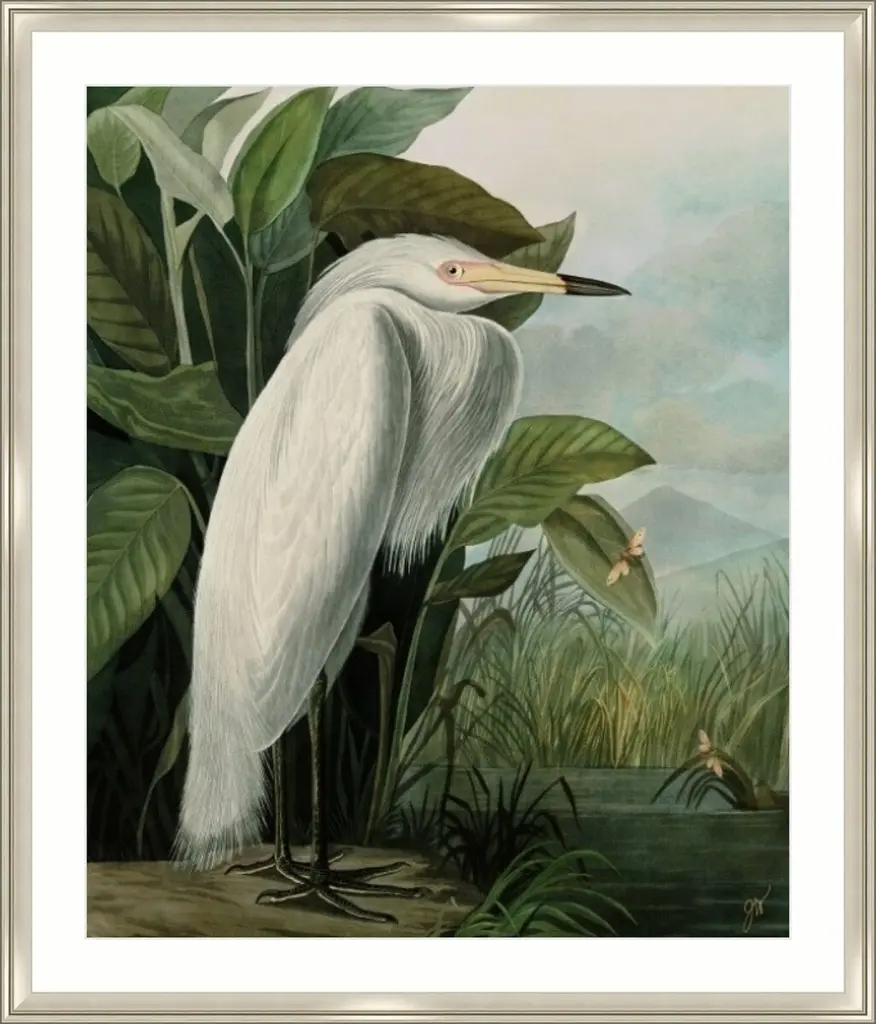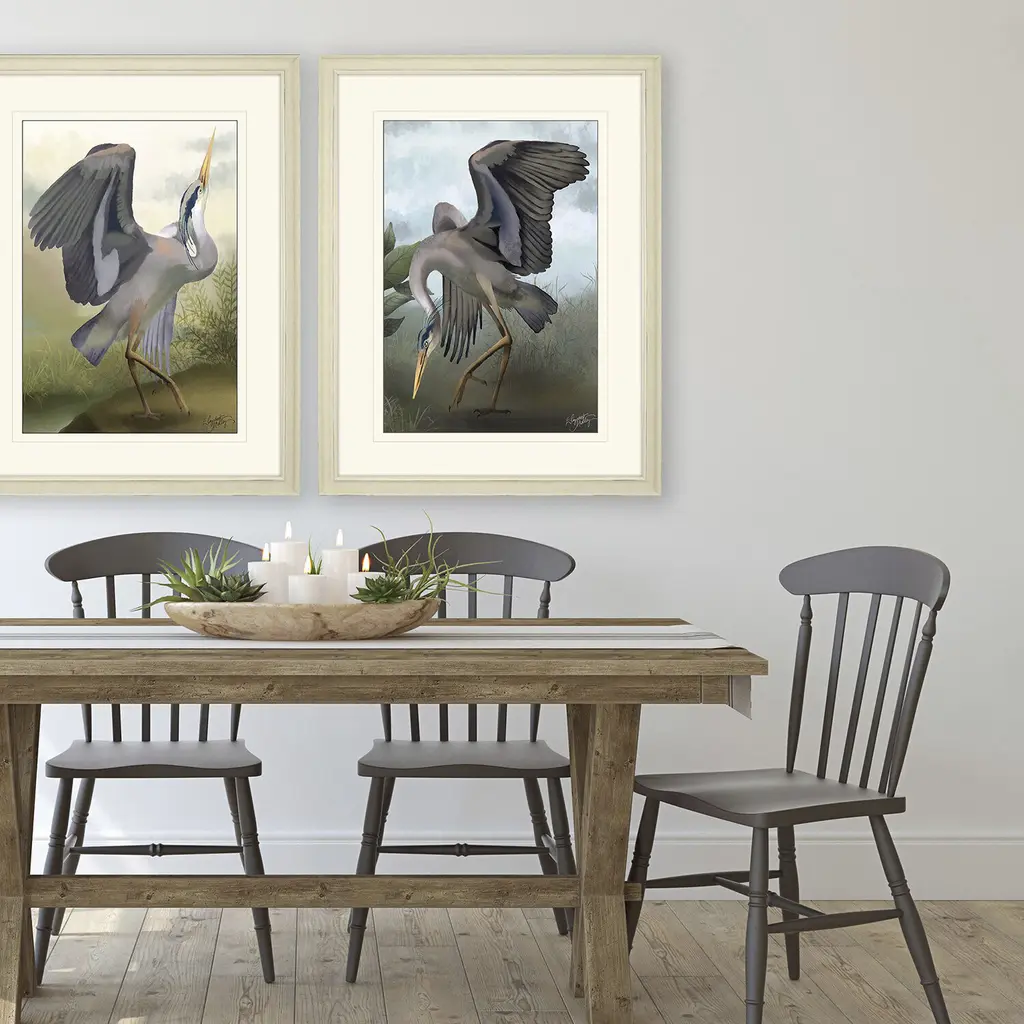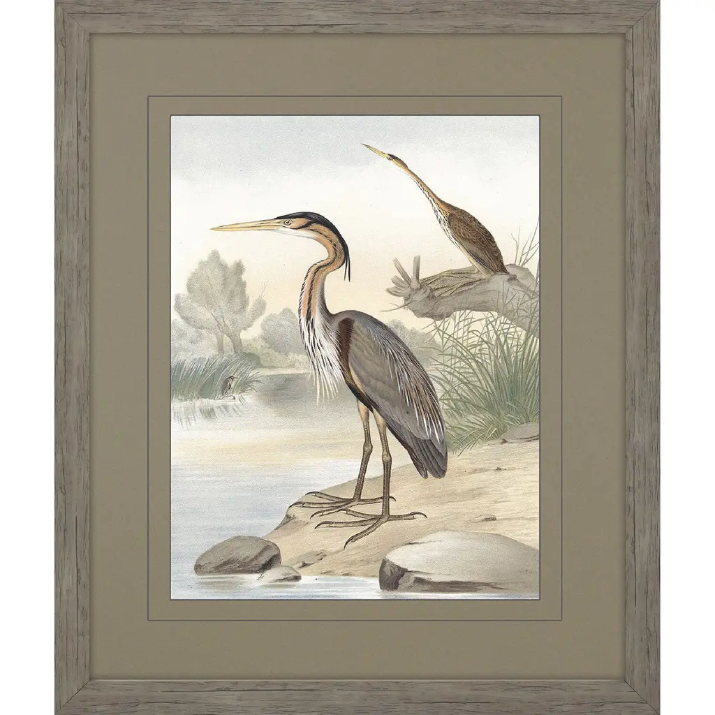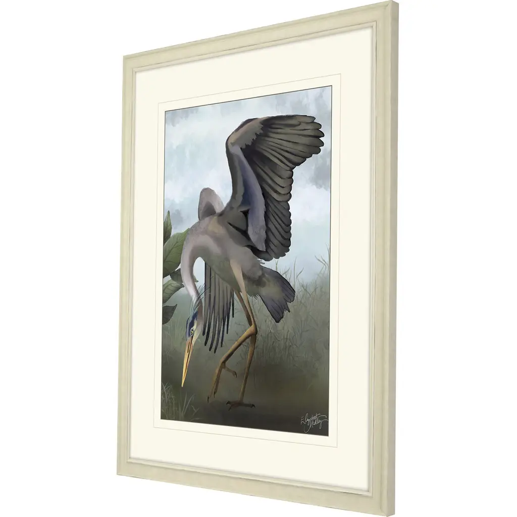 A traditional heron in landscape is double-matted in white with a dark inner mat surrounding the print. Framed in a distressed ivory wood.