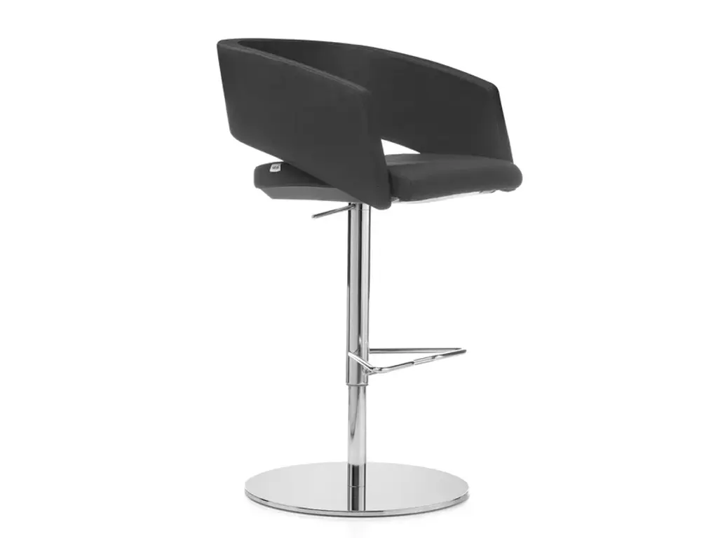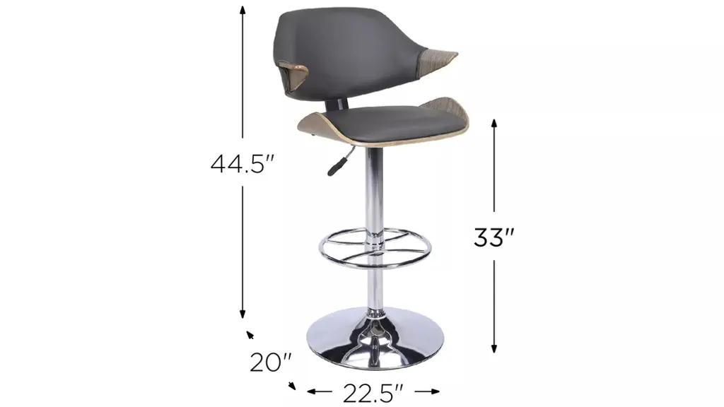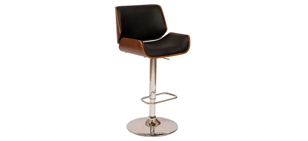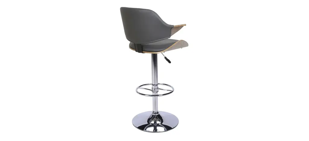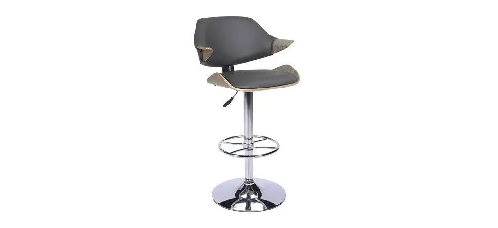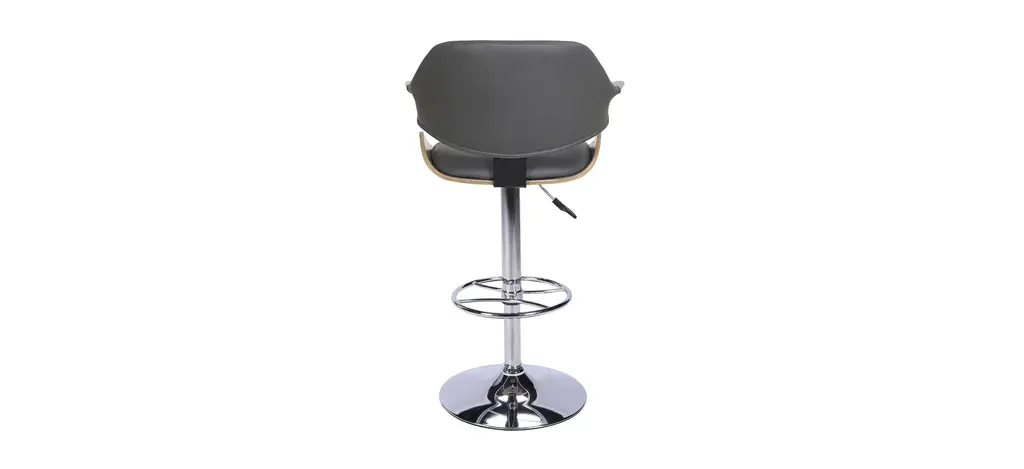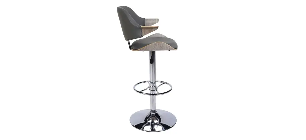 This Herriman bar stool has a curved, silver oak finish backrest and seat with faux leather upholstery, exposed armrests and 360 swivel on a chrome pedestal base with a circle footrest.