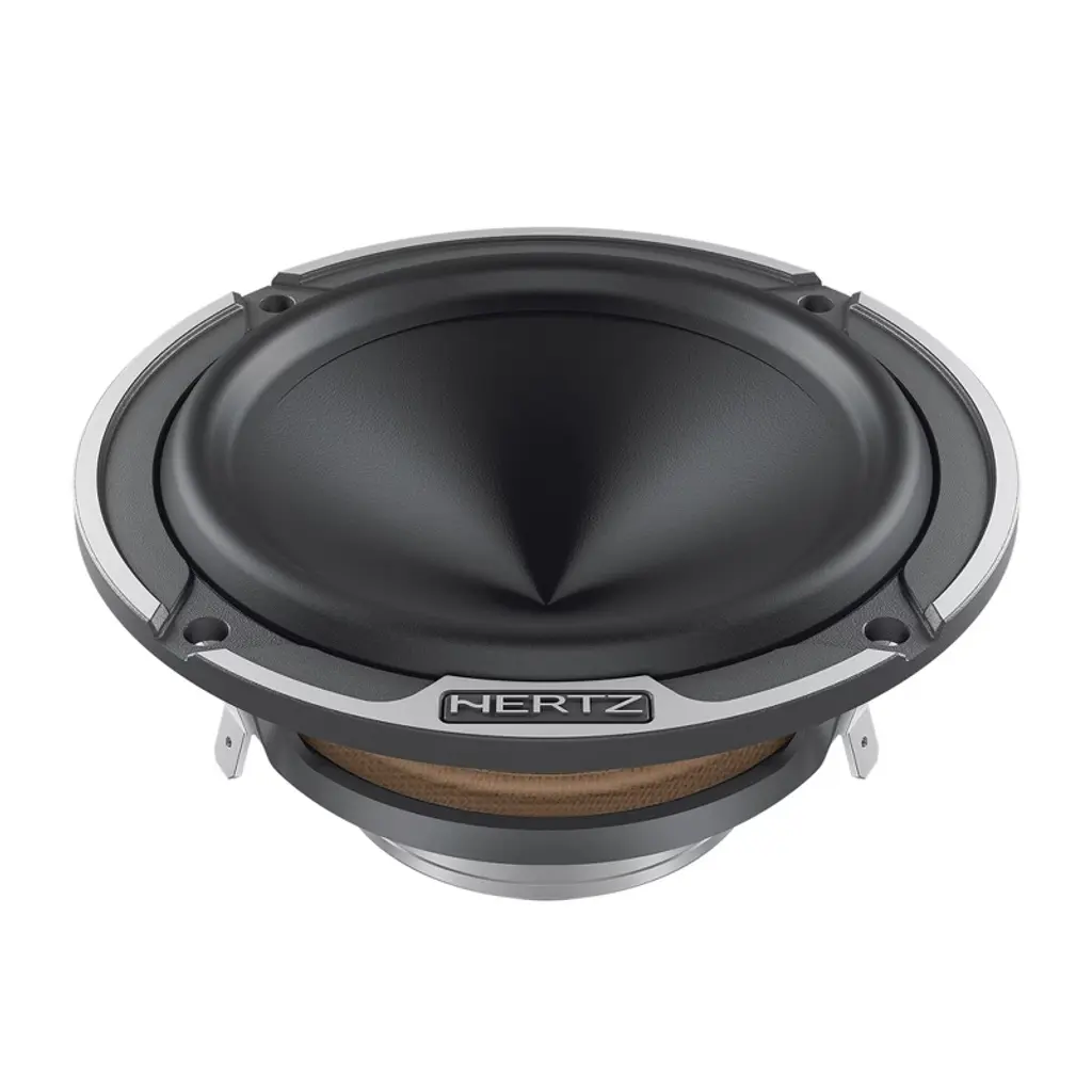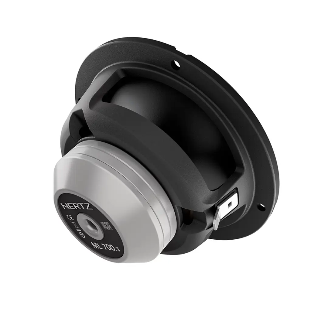 The ML 700.3 Legend car audio midrange features the V-cone geometry upgrade, the Neodymium magnet assembly and the threespoke anti-resonant aluminium alloy basket with vented holes. Thanks to these technologies, as well as the Boundary Free Surround, taking the diameter emission from 60 to 65 mm, the midrange will provide extended, properly damped low frequency response, as the component will be filtered especially at the low frequencies, for excellent combination with the ML 1800.3 Legend, to build an ultra-performing system for competitions. Features - • Pressed-pulp cone with cotton fibres, combining stiffness and lightweight, to achieve wide frequency response and limited break-ups at high frequency. • Junction point between cone and former with geometry optimized with FEA methods, allowing a more integral coupling, thus ensuring wider extension at high frequency. • Three-spoke, very acoustically transparent anti-resonant aluminium alloy basket featuring built-in venting holes. • CNC machined elegant diamond-cut basket edge featuring the Hertz logo. • Die-cast aluminium factory provided grille featuring diamond-cut aluminium Hertz logo. Specifications - • Power Handling: 100W Peak • Impedance: 4 Ohms • Frequency Response: 200 ÷ 20kHz