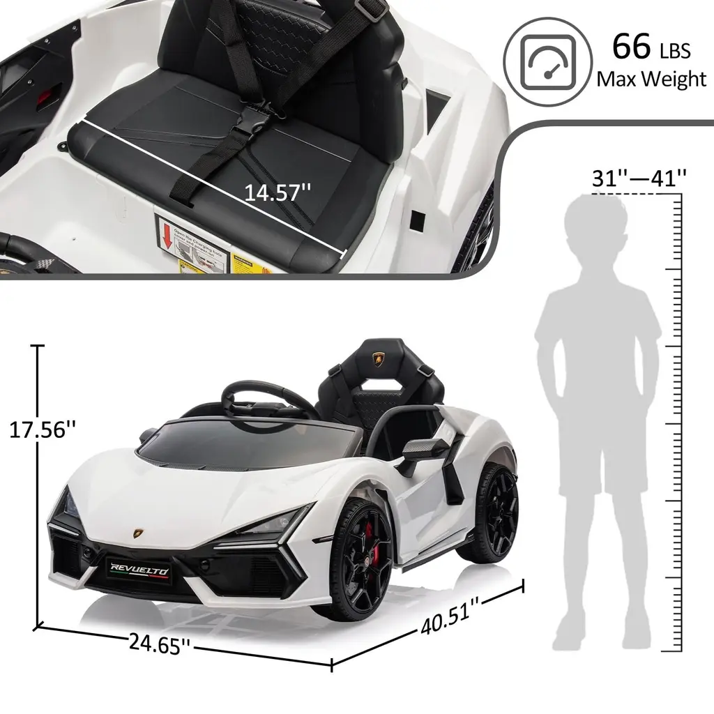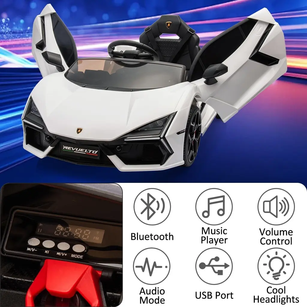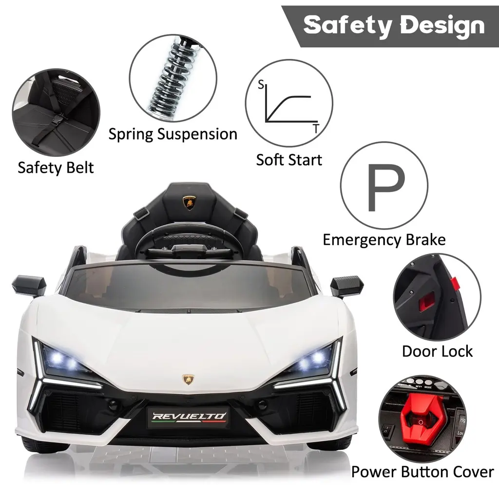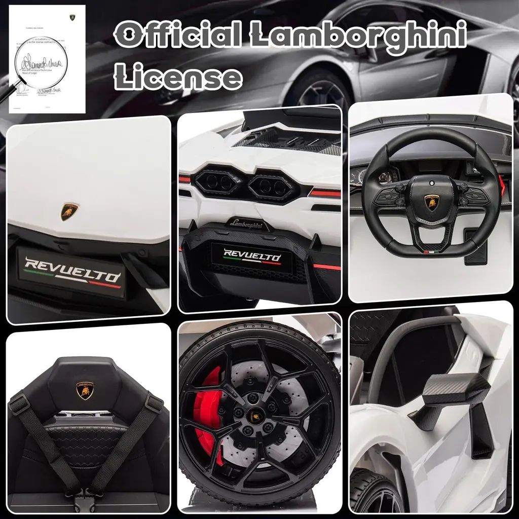 ??【???????????????? ??????????????????????】This toddler electric car boasts an authentic design inspired by the Lamborghini Revuelto, featuring functional multimedia, a responsive steering wheel, and a foot pedal for an immersive driving experience. ??【???????????????? ????????????????】This electric kids car features dual 25-watt motors for an exhilarating driving experience; with speeds ranging from 1 to 2 mph, the robust 12-volt 4.5 AH battery of the kids electric vehicle provides up to 1 to 2 hours of playtime after each charge. ??【????????-?????????????? & ???????????? ??????????????】The Lamborghini toy car allows kids to drive by themselves; parents can also take control via remote, ensuring safe and interactive playtime. It is easy to install and operate. Any questions, feel free to contact us. ??【???????????? ?????? ???????????? ????????】This battery car for kids features a slow start function, spring shock absorbers, and lockable doors, providing a steady ride even on bumpy terrains and ensuring a safe experience for young drivers. ??【?????? ?????? ????????????????????】This kids Lamborghini electric car boasts a clear operational panel, LED headlights, and music, creating a multi-sensory play environment that maximizes entertainment for your little ones.