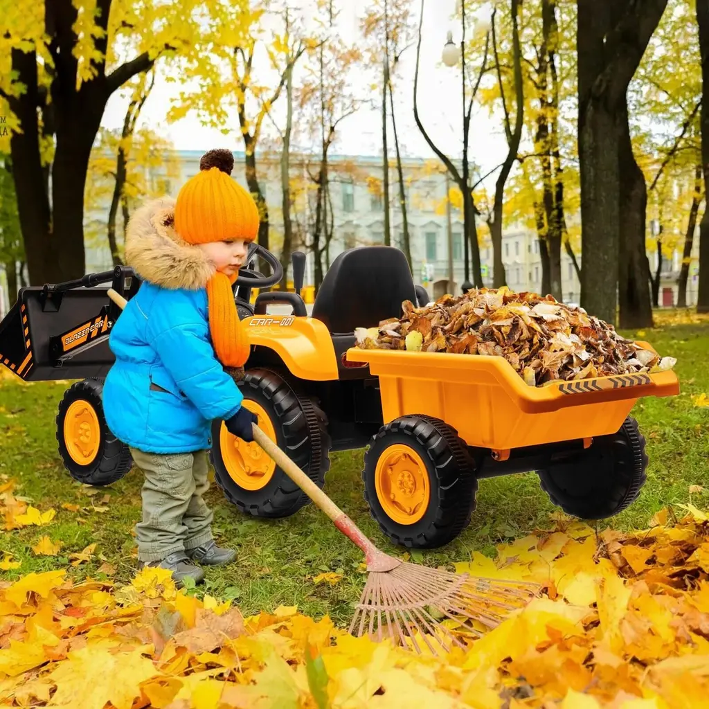 【All-Round 3-in-1 Tractor】Step into adventure with our 12V ride on tractor that doubles as both a and tractor, complete with a versatile shovel bucket and a detachable trailer. It's a customizable playtime masterpiece for little ones 【ACTION-PACKED FRONT LOADER】Experience the real deal with a functioning loader and arm on this ride on bulldozer. Guided by a digging lever, youngsters can dig, lift, and unload just like the pros 【REMIXABLE TRAILER】Our kids electric vehicle boasts a bonus trailer, perfect for hauling toys, snacks, or even helping out in the garden with flowers and supplies. Plus, it's easily removable when not needed 【EASY-PEASY CONTROLS】We've got both kids and parents covered with dual steering modes. Little drivers can take charge with pedals for forward/reverse motion and speed adjustments, while adults can join the fun via a 2.4GHz remote control 【NON-STOP FUN ZONE】Get ready for an immersive play session with built-in tales and tunes. Sync up your smartphone for personalized playlists, enhancing learning and laughter. USB and MP3 compatibility open doors to endless entertainment, complemented by flashy headlights for night rides and a battery gauge that reminds you to juice up