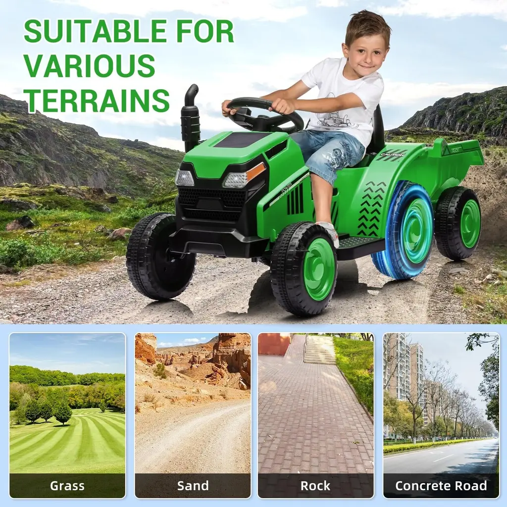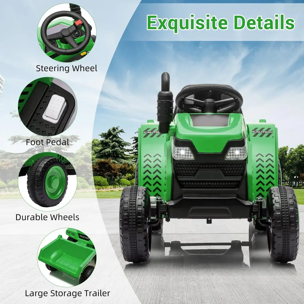 2 IN 1 TRACTOR WITH DETACHABLE TRAILER - This kids ride on car comes with a trailer for storing child's toys, snacks, and can also be used to transport sand, leaves, etc., which brings more convenience and fun to riding. Easy-to-remove bolt allows you to detach the trailer quickly. With this ride-on tractor, parents can participate in their children's play and get more enjoyable parent-child interaction. REALISTIC DRIVING EXPERIENCE - With the realistic look, easy-to-understand center controls, bright lights and steering wheel with horn, our kids electric vehicle is dedicated to providing the most realistic driving experience for your kids. This kids tractor with trailer also has built-in music, and has the ability to connect electronic devices via USB ports and MP3 slots to play music or children's stories and more. EASY TO CONTROL - One button to start. The kids tractor ride on has a simple forward/stop/reverse switch, combined with the foot pedal. Little child can easily control the car for kids, which is perfect for kids to start their riding journey. The battery level display function reminds us when the stroller is going to run out of battery and charge the 6V ride on toys in time. STURDY & DURABLE - This toddler car is equipped with 2*25W motors with strong power. And its maximum weight capacity is 66 lbs. Comfortable single seat with high backrest and 6 sturdy wheels (two of which are removable) ensure a stable ride on any terrain and keep the driver safe. PERFECT PRESENT FOR BOYS GIRLS - This kids car is made of durable PP material and is ASTM certified to ensure its reliability. This kids electric car is a good and trustworthy companion for kids as they grow and play, and this car is a perfect gift for parents to give to their children. Size: 39.37" x 16.53" x 15.75".