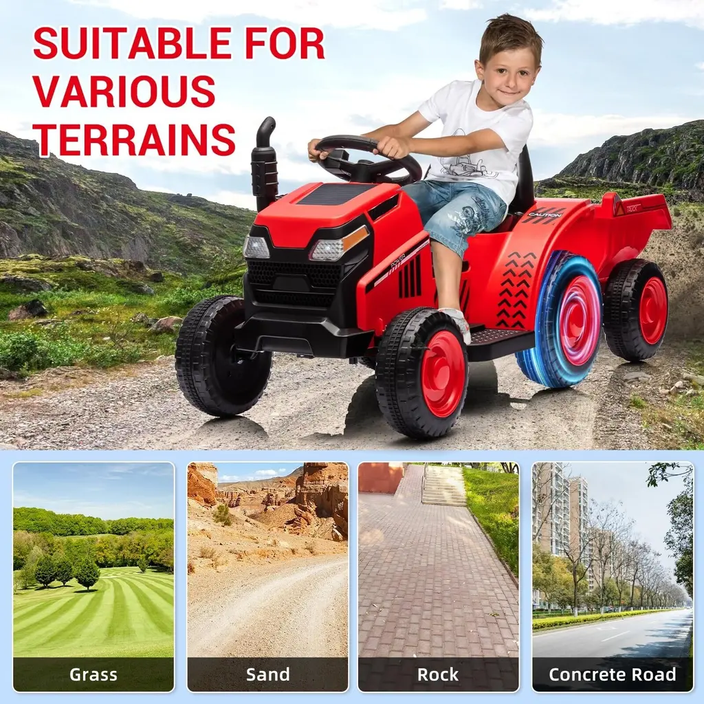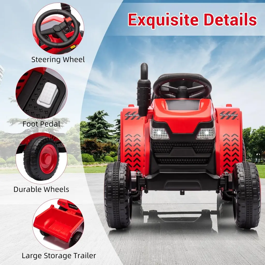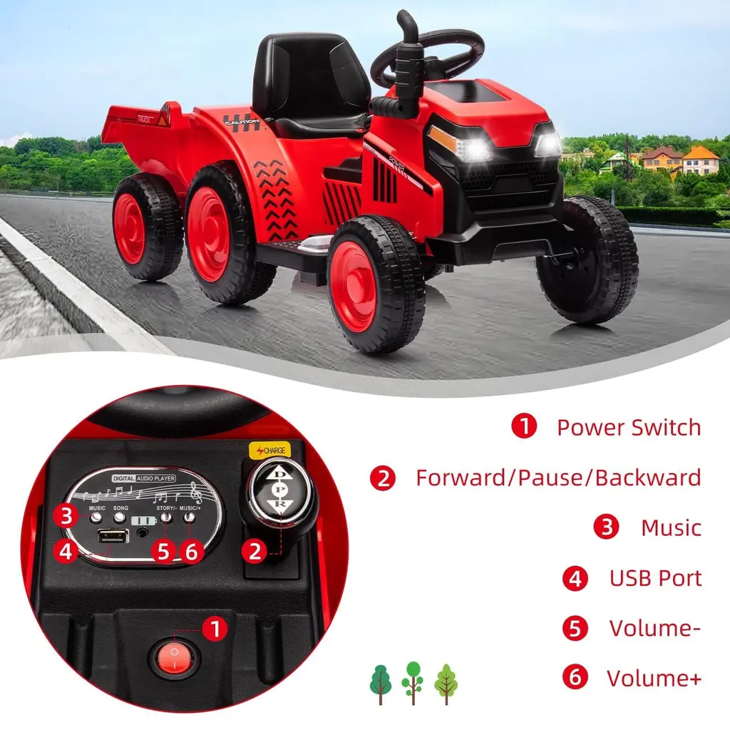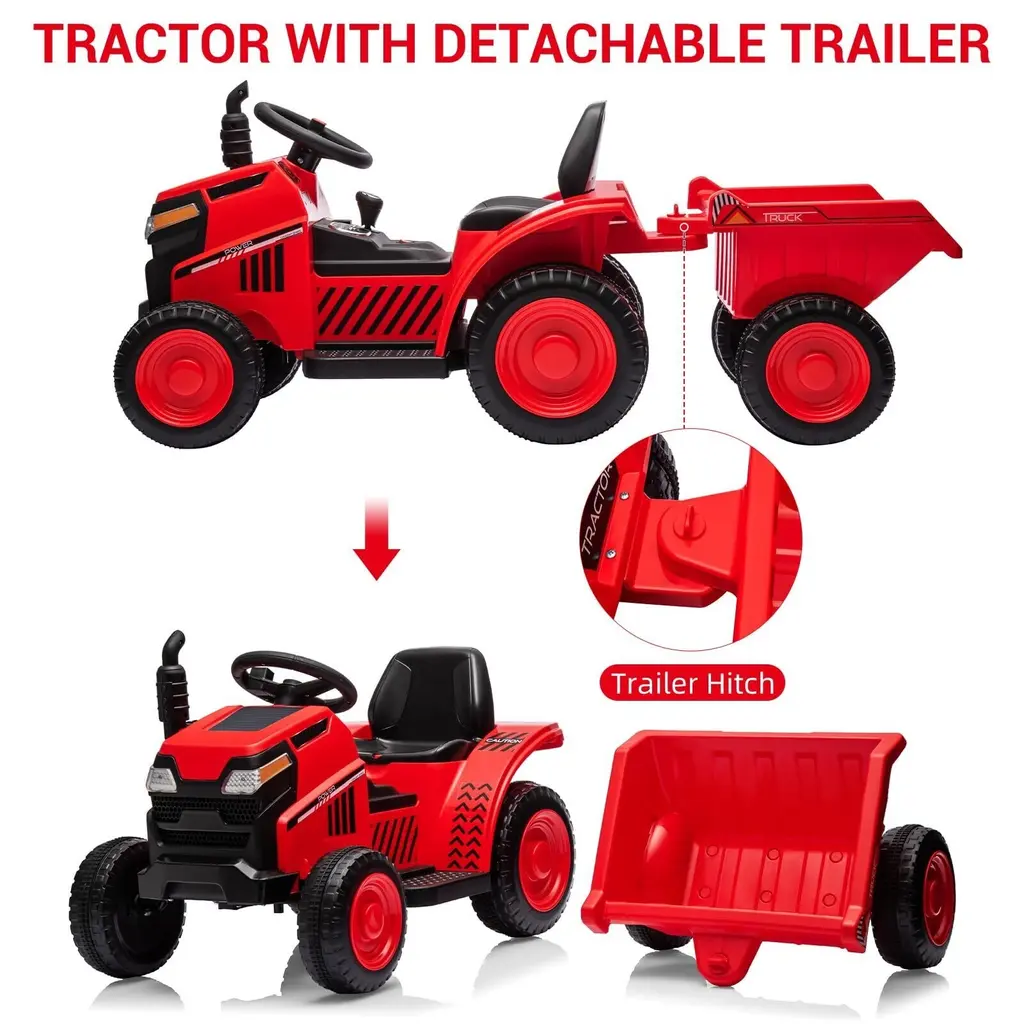2 IN 1 TRACTOR WITH DETACHABLE TRAILER - This kids ride on car comes with a trailer for storing child's toys, snacks, and can also be used to transport sand, leaves, etc., which brings more convenience and fun to riding. Easy-to-remove bolt allows you to detach the trailer quickly. With this ride-on tractor, parents can participate in their children's play and get more enjoyable parent-child interaction. REALISTIC DRIVING EXPERIENCE - With the realistic look, easy-to-understand center controls, bright lights and steering wheel with horn, our kids electric vehicle is dedicated to providing the most realistic driving experience for your kids. This kids tractor with trailer also has built-in music, and has the ability to connect electronic devices via USB ports and MP3 slots to play music or children's stories and more. EASY TO CONTROL - One button to start. The kids tractor ride on has a simple forward/stop/reverse switch, combined with the foot pedal. Little child can easily control the car for kids, which is perfect for kids to start their riding journey. The battery level display function reminds us when the stroller is going to run out of battery and charge the 6V ride on toys in time. STURDY & DURABLE - This toddler car is equipped with 2*25W motors with strong power. And its maximum weight capacity is 66 lbs. Comfortable single seat with high backrest and 6 sturdy wheels (two of which are removable) ensure a stable ride on any terrain and keep the driver safe. PERFECT PRESENT FOR BOYS GIRLS - This kids car is made of durable PP material and is ASTM certified to ensure its reliability. This kids electric car is a good and trustworthy companion for kids as they grow and play, and this car is a perfect gift for parents to give to their children. Size: 39.37" x 16.53" x 15.75".