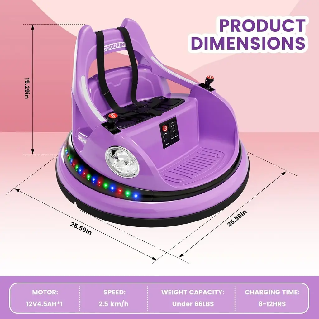 360 DEGREE SPIN - Bumper car with 360-degree spin for more smiles and greater riding fun. Ideal for toddlers and kids aged 4-8 years with a maximum weight capacity of 66 lbs. MANUAL AND REMOTE CONTROL - Let your child drive manually or use the 2.4GHz remote control to guide them when necessary; the remote has forward/reverse and turn controls LIGHTS & SOUNDS - A set of functional lights conveniently located on a seat-mounted control panel adds an extra, realistic touch to playtime! PREMIUM PERFORMANCE - Includes a rechargeable 12V battery that lets your kids enjoy 1-3 hours of riding fun. Battery charging time is about 5 hours, and 12 hrs when charging for the first time. CLASSIC DESIGN - The smooth, curved profile combined with a thick rubber-like bumper and a fun set of vibrant stickers lets your child personalize their ride.