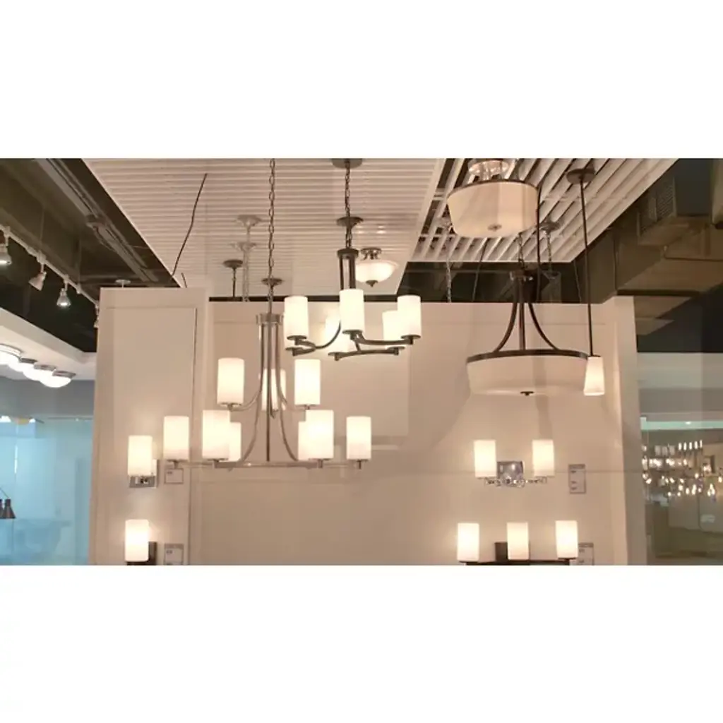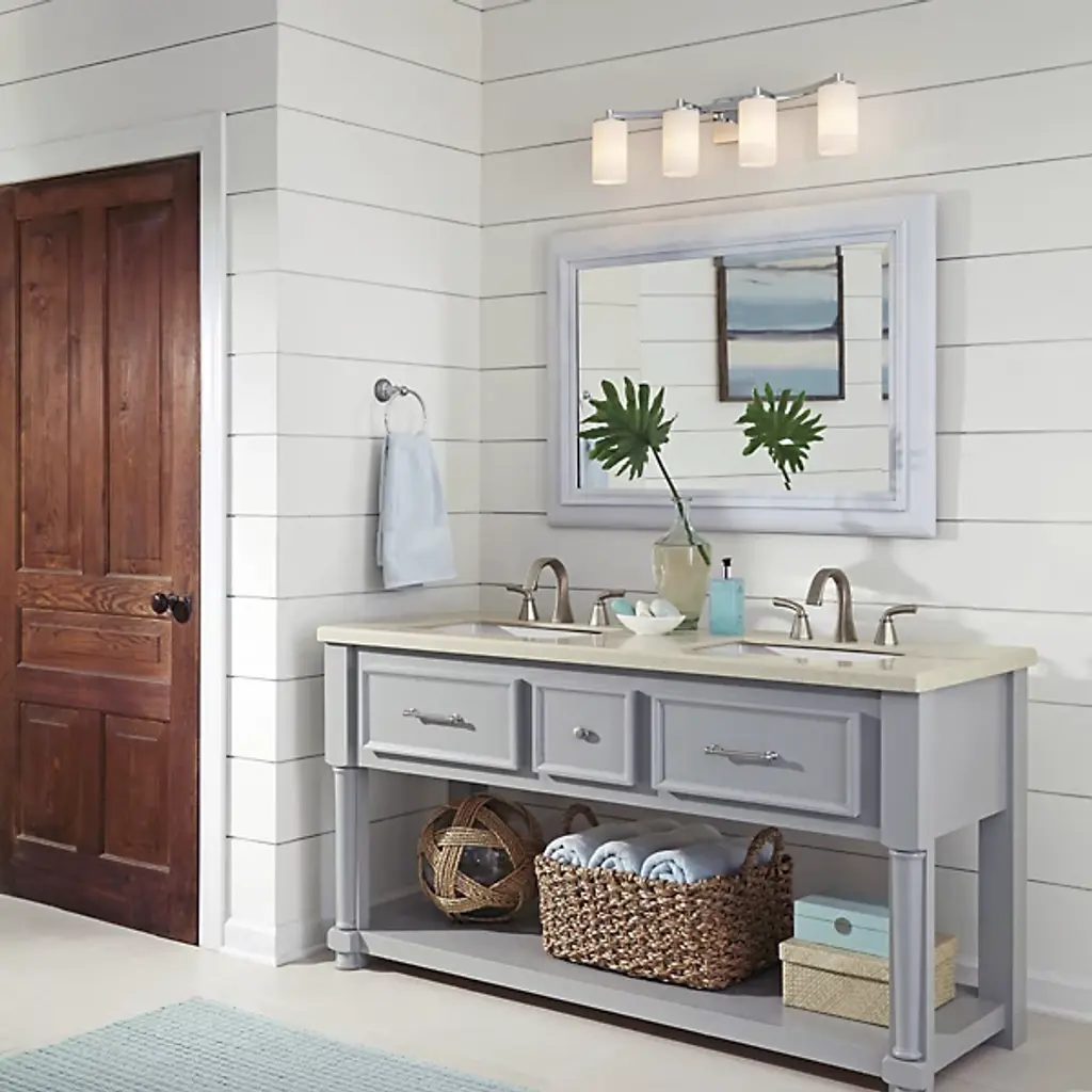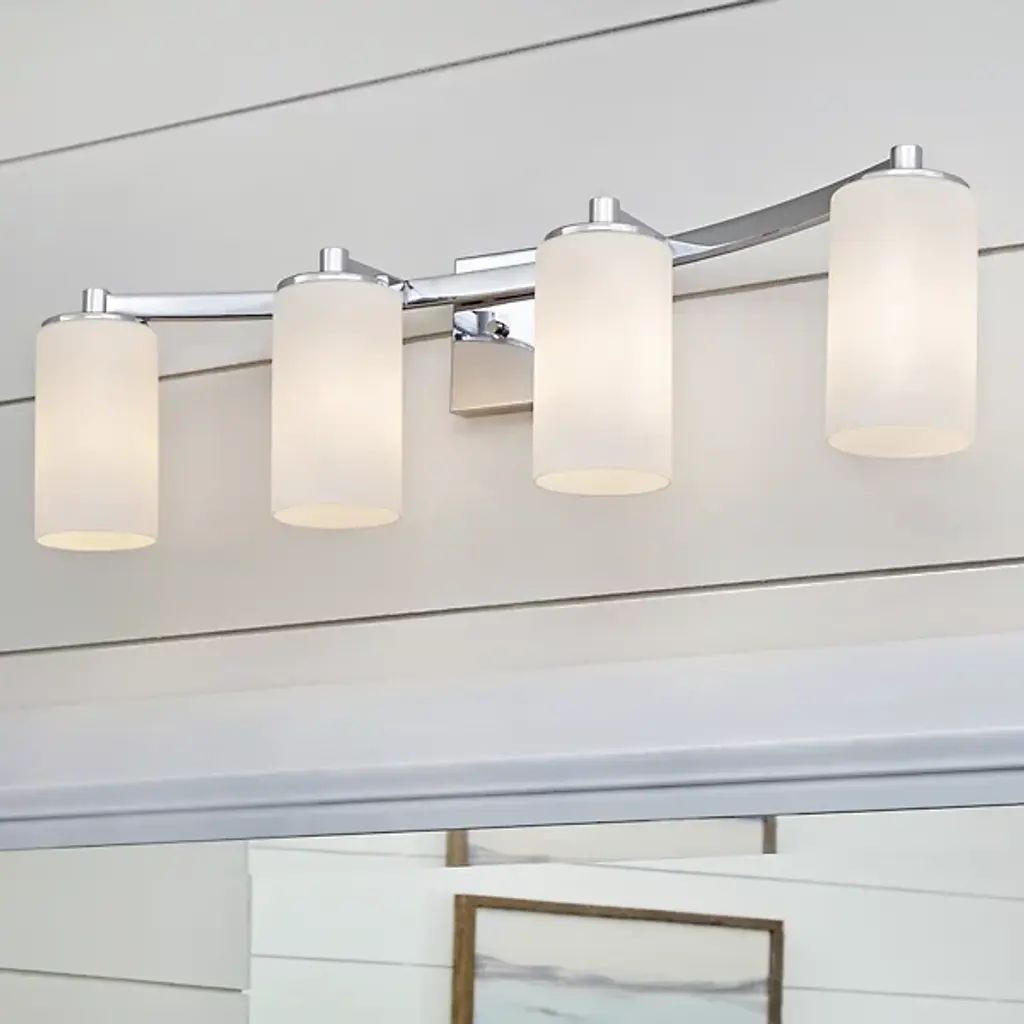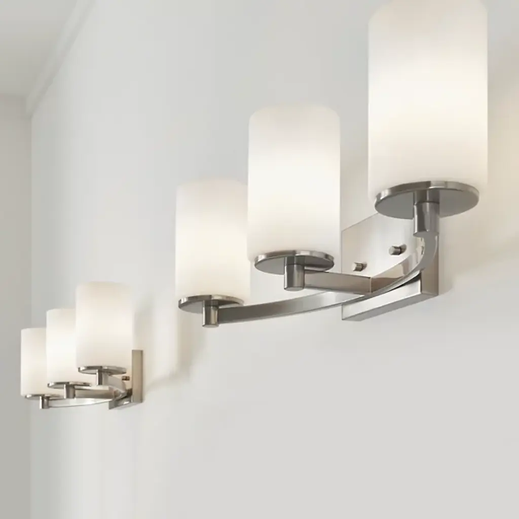 The Generation Lighting, formerly known as Sea Gull Lighting, Hettinger Vanity Light uses subtle, clean lines to infuse style into your vanity or bathroom. Cylinders of Etched / Inside White glass evenly distribute light, enhancing the view of any subject. May be mounted in an up or down position.