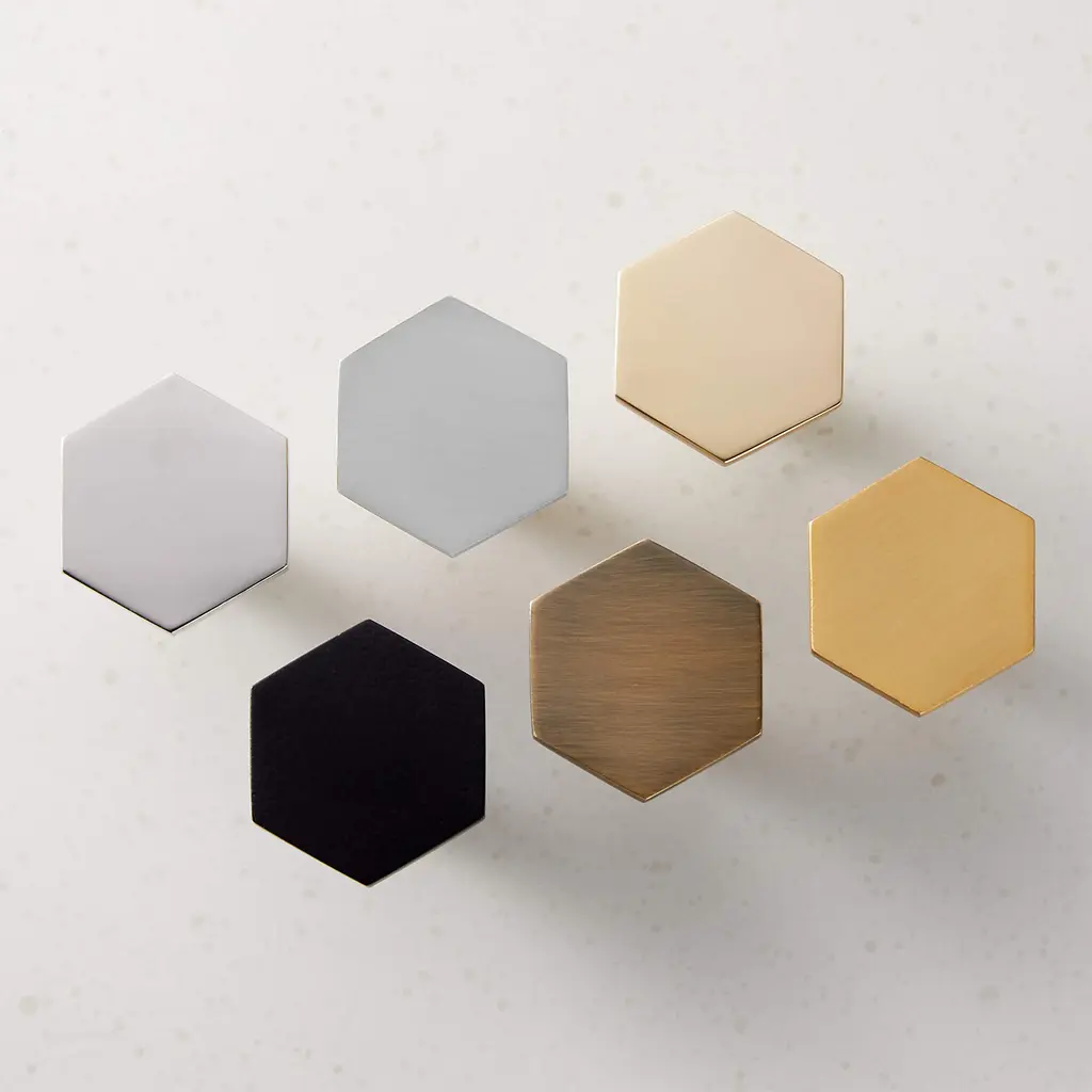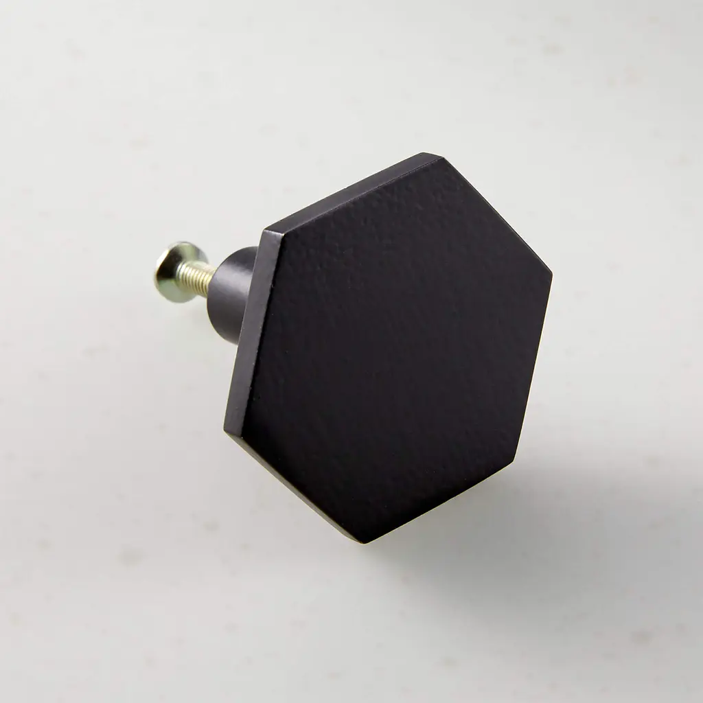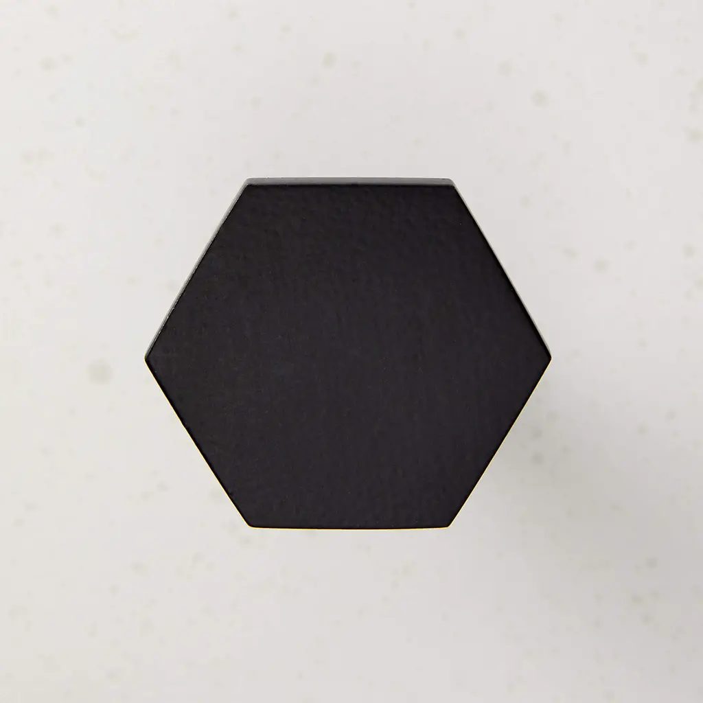 Popular in bathrooms and kitchens, the hexagon adds a sophisticated graphic element to doors and drawers. Handmade of solid brass, black knob ups the design factor of existing cabinets. CB2 exclusive.