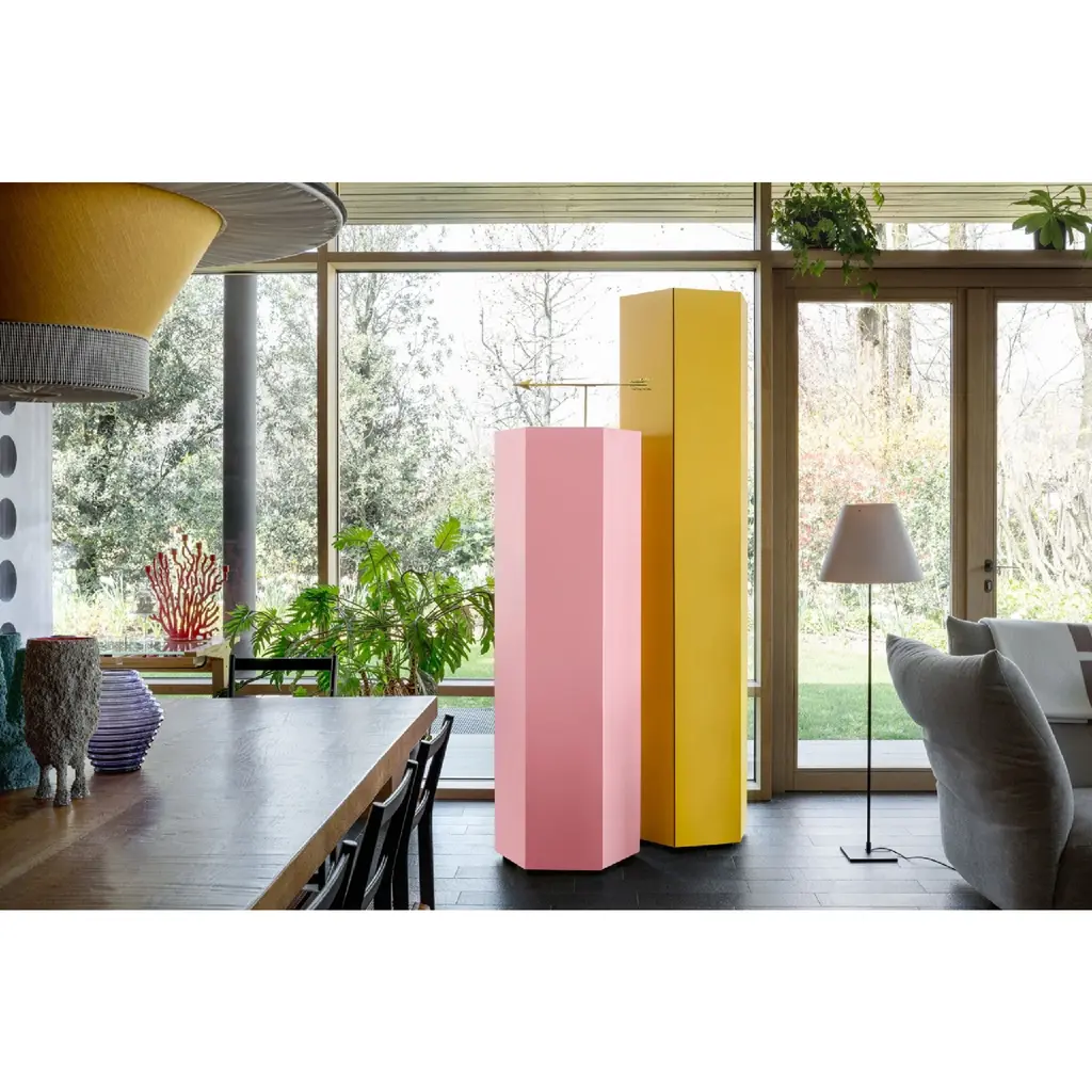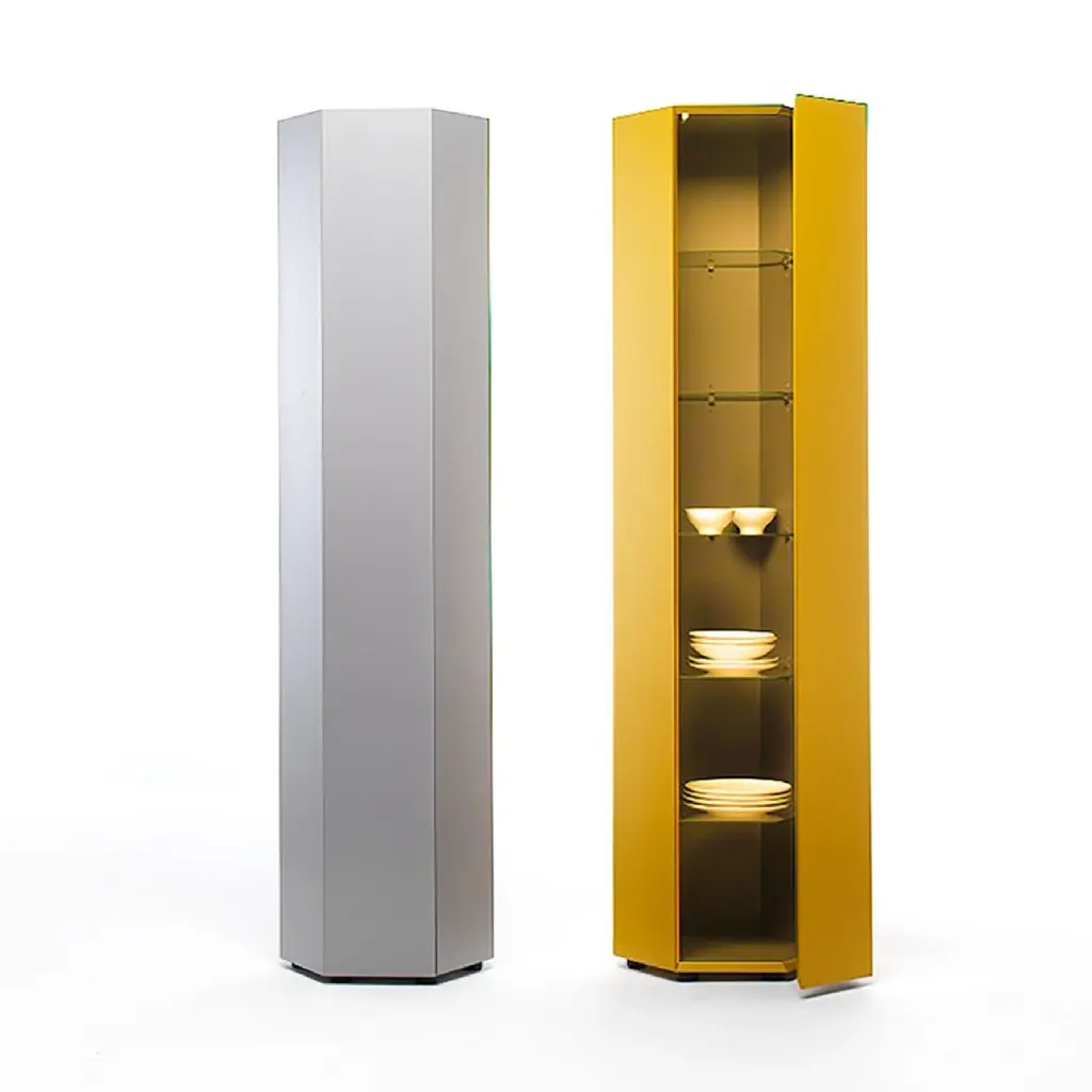 Elevate your living space with the Hexagonal Lacquered Pillar Storage from Mogg Exagon. Featuring a sleek wood design with a single door and internal glass shelves, this column adds a touch of elegance to any room. Available in a variety of lacquered colors, specify left or right door opening upon ordering.