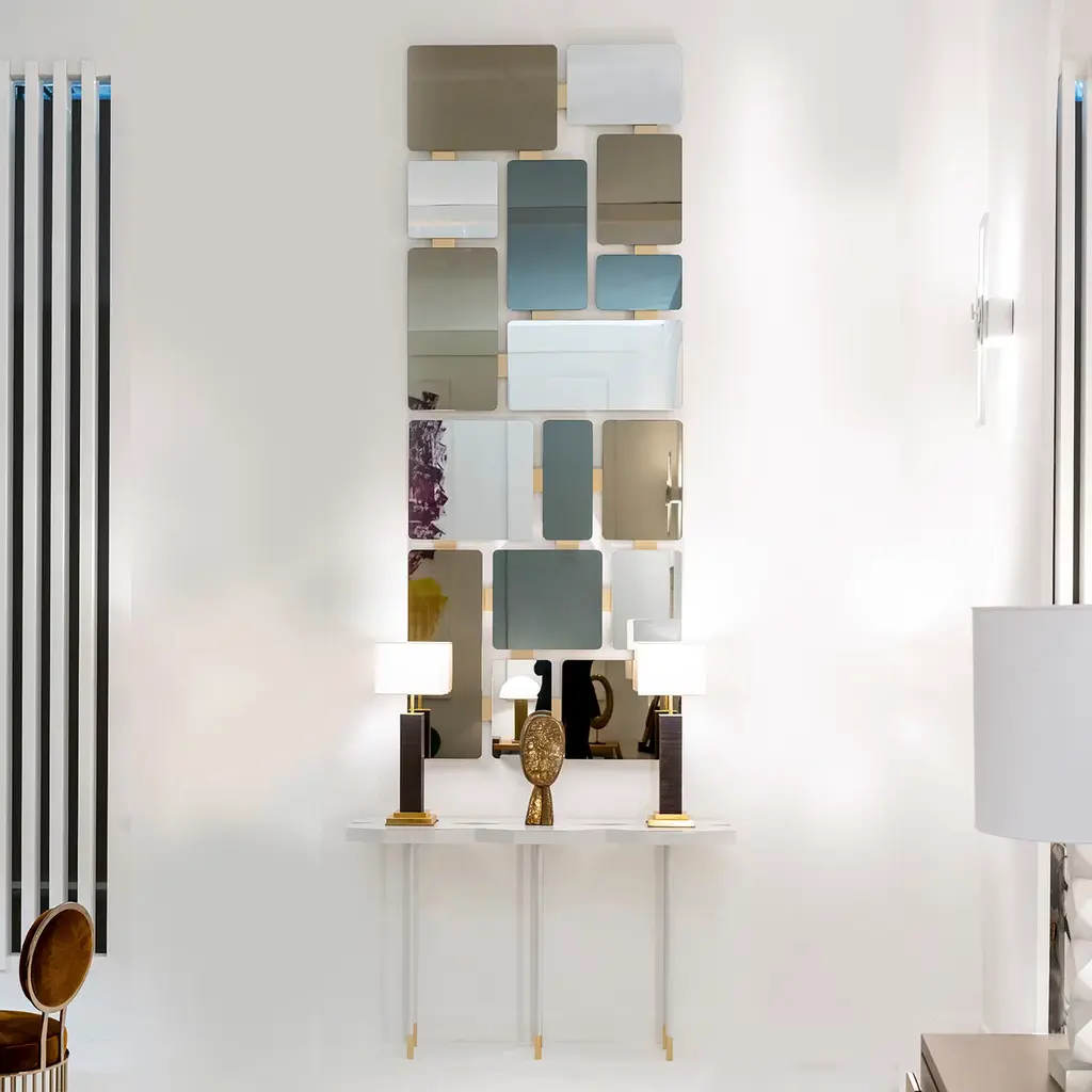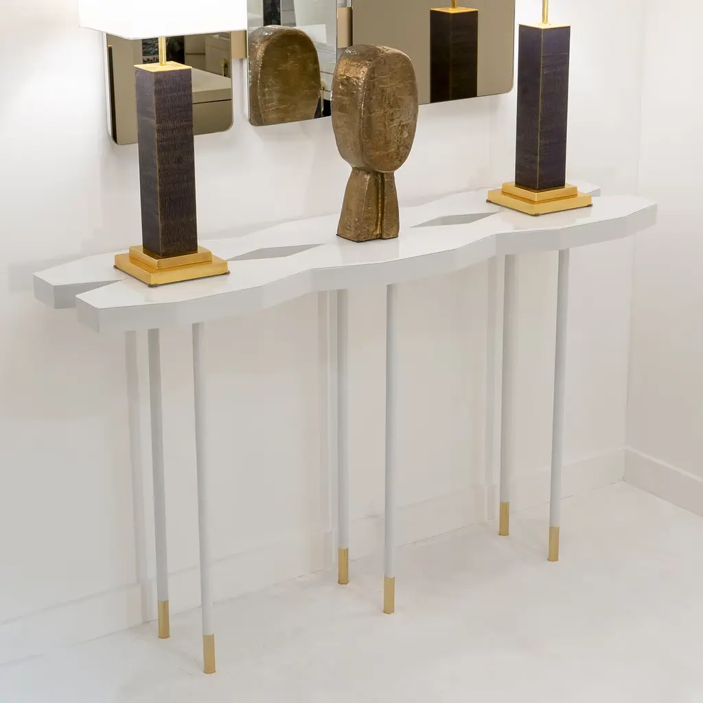 An iconic and sophisticated accent piece for an entryway of a contemporary style interior, this console showcases a refined sculptural design. Resting on six legs made of matte white-lacquered brass enriched with 18K gold-plated tips, it features a distinctive hexagonal polyhedric top displaying two rhomboidal open inserts, fashioned of back-lacquered glass.