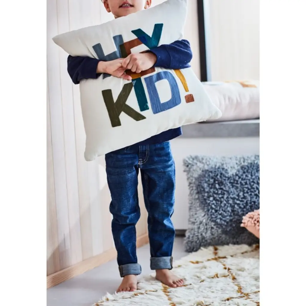 Layer on color and texture with our playful "Hey, Kid!" Throw Pillow. The warm, earthy tones of the embroidery pops on the neutral cream cotton canvas shell. Style it with any of our bedding collections for an elevated space that's truly theirs.