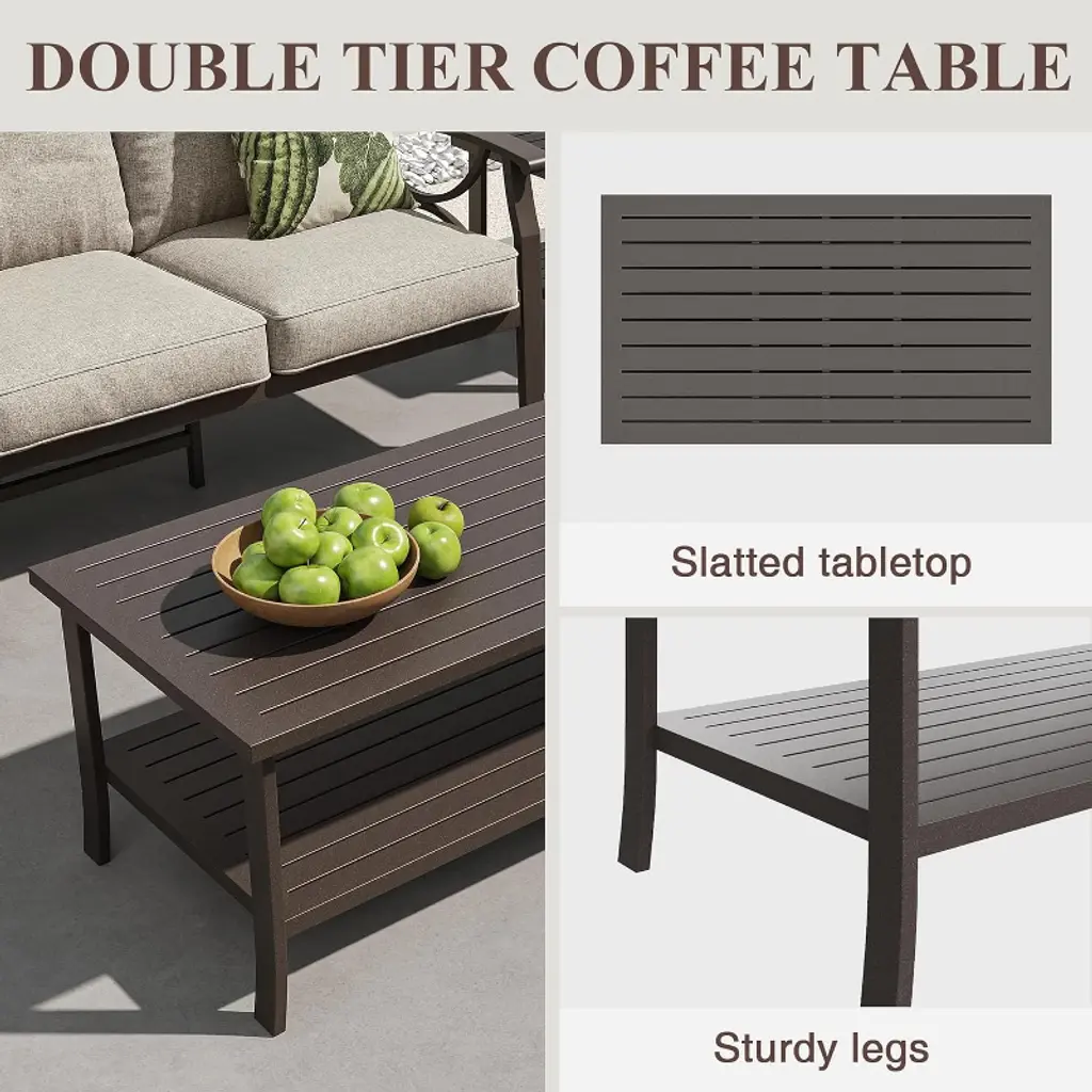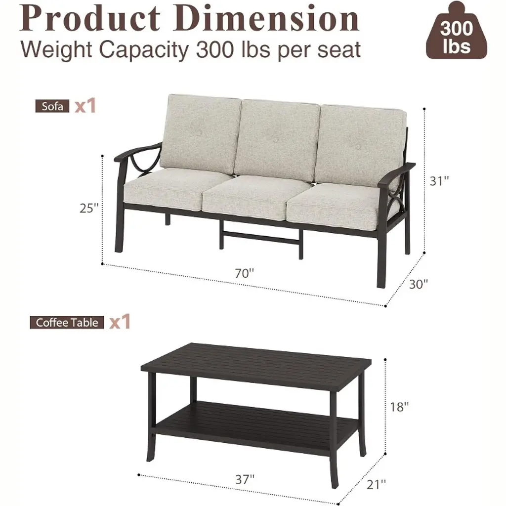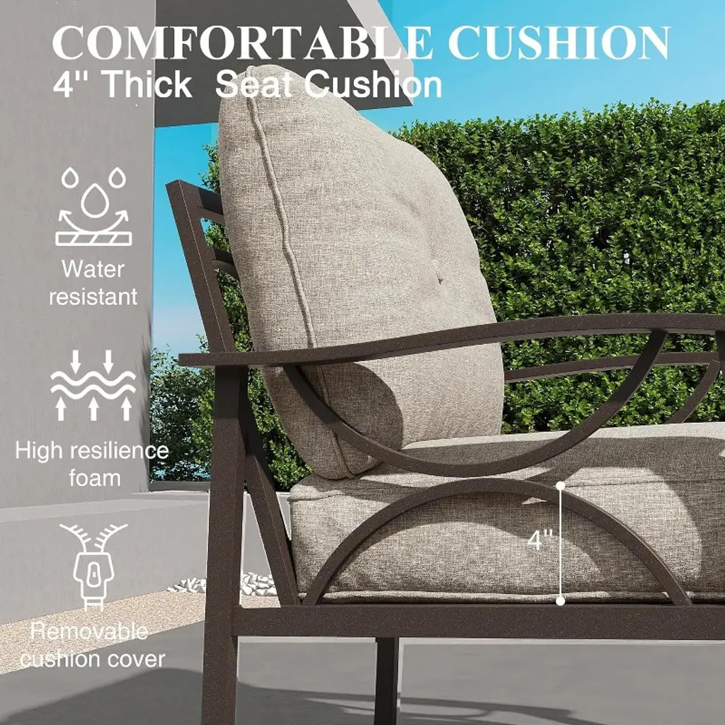 Get ready to relax in style with our outdoor patio furniture set. The elegant and modern armrest design is suitable for any outdoor space. Built to last, this metal furniture set features a sturdy steel frame and a premium powder-coated finish that preventsrusting, providing reliable support. The thick cushions are filled with high-density foam, offering both comfort and resilience. The water-resistant polyester fabric ensures easy maintenance and prevents deformation. This patio conversation set alsoincludes a double-tier coffee table, providing extra storage space for your essentials. Don't miss out on this must-have addition for your next outdoor gathering or leisurely lounging.