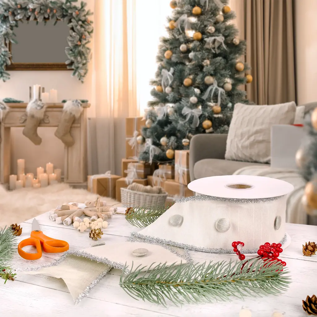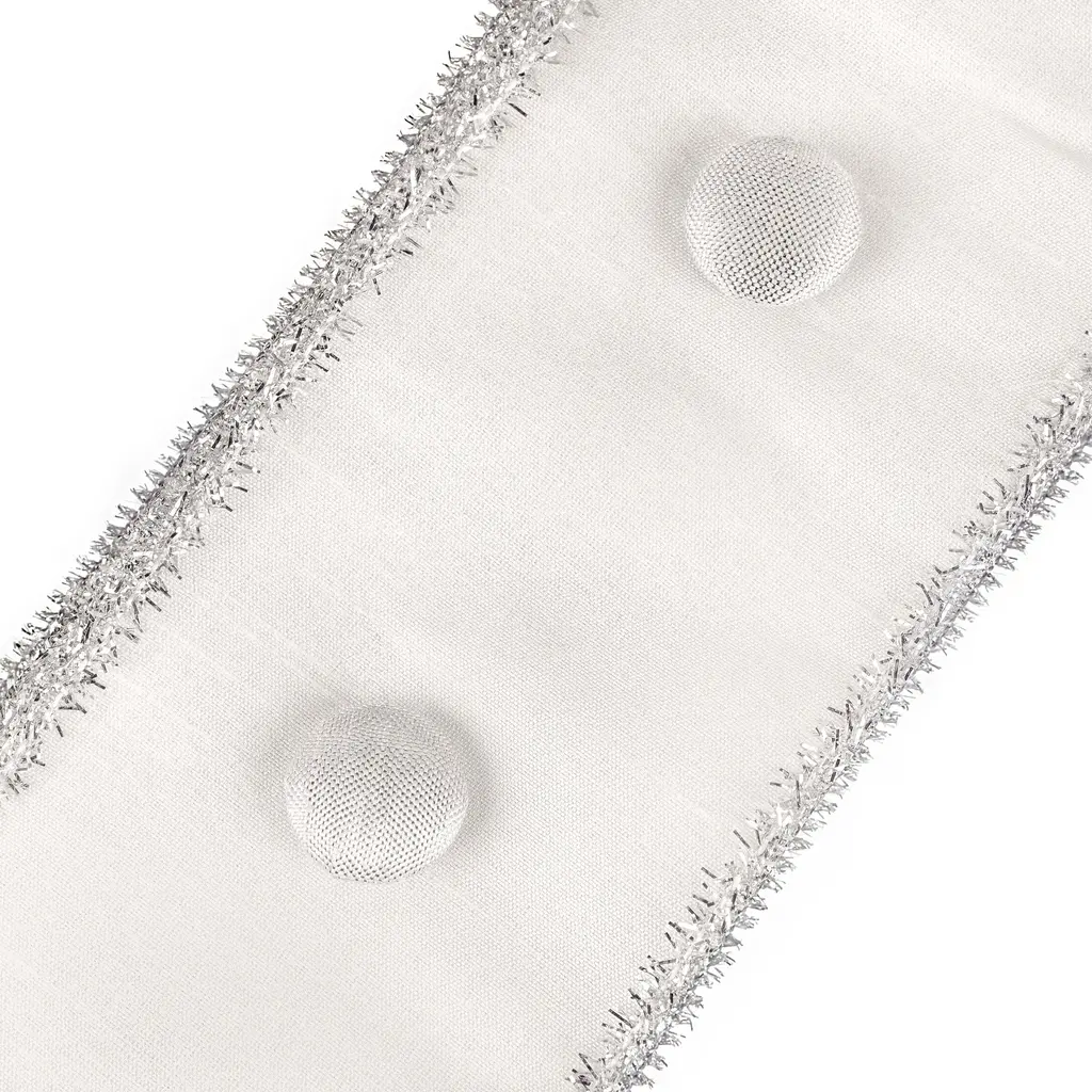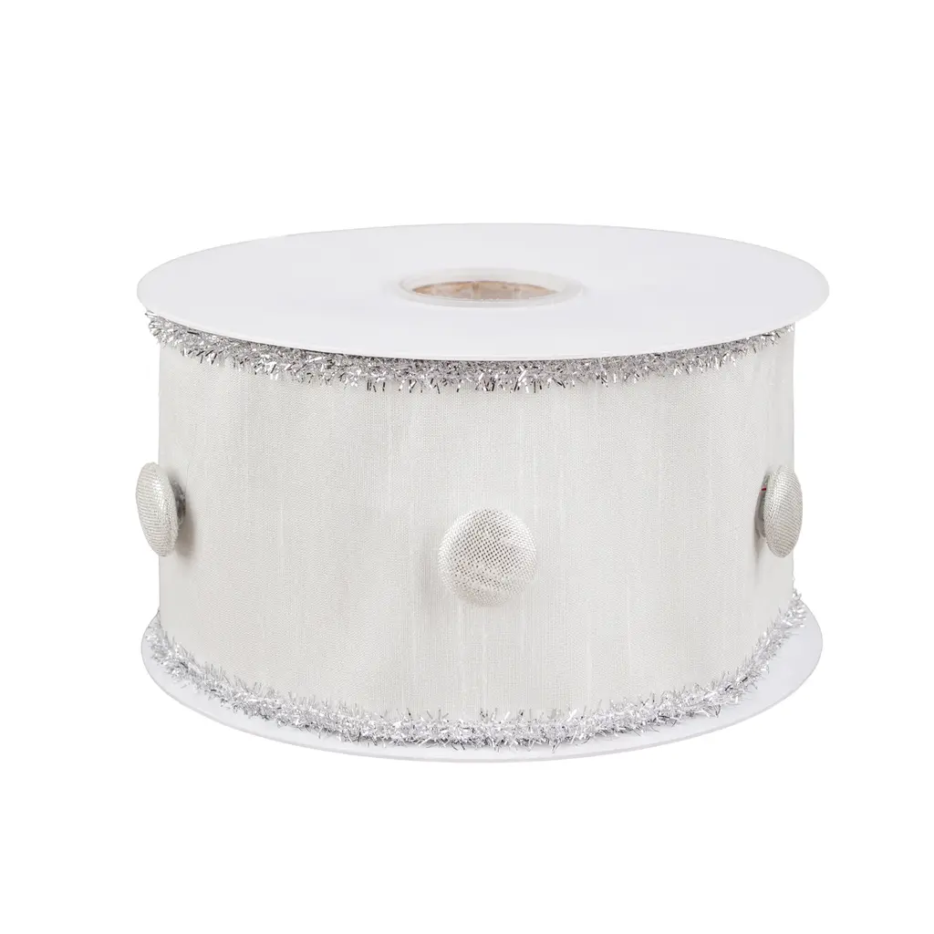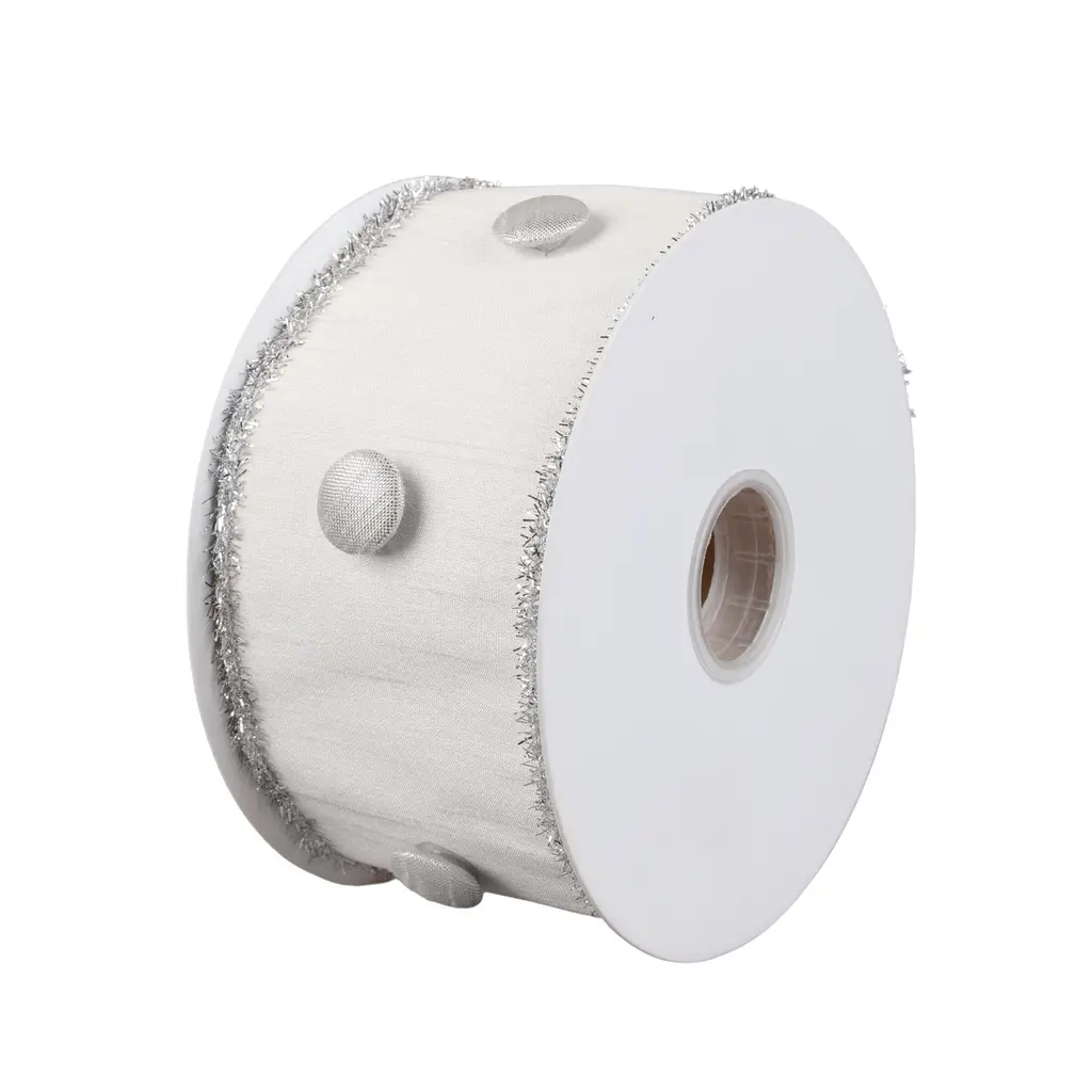 Show some creativity with this double-fused bright white fabric ribbon featuring a repeating button motif with wire and silver tinsel fringe edging. This versatile ribbon is perfect for holiday decorating, tree trimming, gift wrapping and other fun project This fantastically festive ribbon features shiny metallic details. This versatile Christmas themed ribbon is perfect for holiday decorating, tree trimming, gift wrapping and other fun projects - your creativity is the limit!. Crafted with sturdy, high quality materials, this holiday themed ribbon is designed to capture the charm and colors of the winter season year after year. Celebrate the season with the inviting and stylish HGTV Home Collection. Holiday memories are made at home. The HGTV Home Collection will make them beautiful. Includes one roll of ivory colored ribbon with decorative buttons measuring 180" long and 3" wide.
