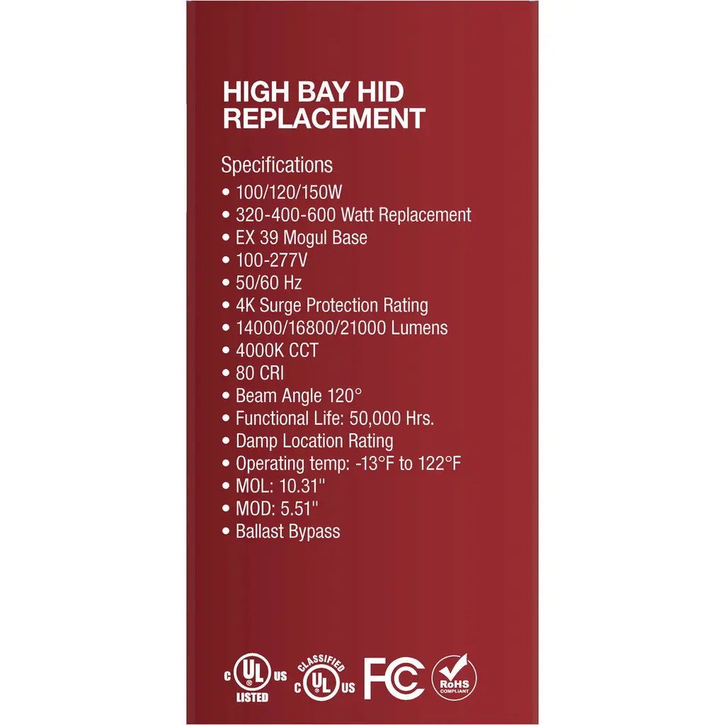 100/120/150 Wattage Selectable - LED - Hi-Bay - Type B - Ballast Bypass - Mogul Extended - 4000K - 100V-277V - 400W-600W MH Replace