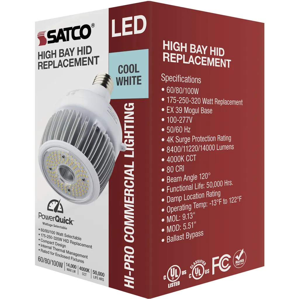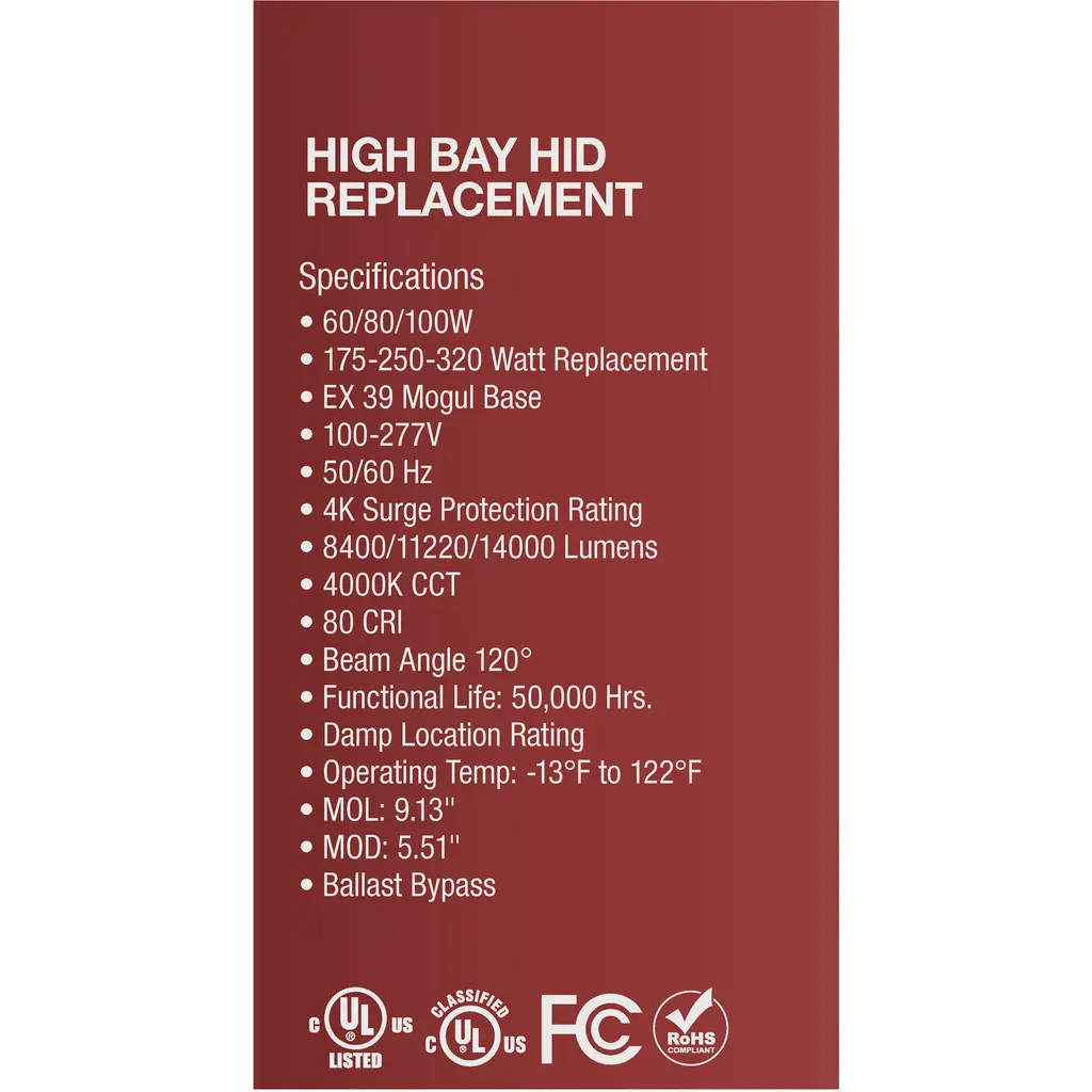 60/80/100 Wattage Selectable - LED - Hi-Bay - Type B - Ballast Bypass - Mogul Extended - 4000K - 100V-277V - 250W-300W MH Replace