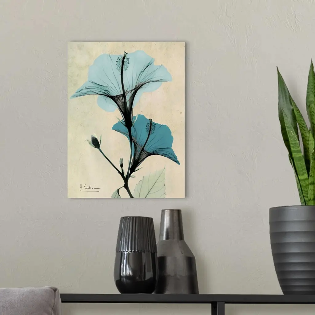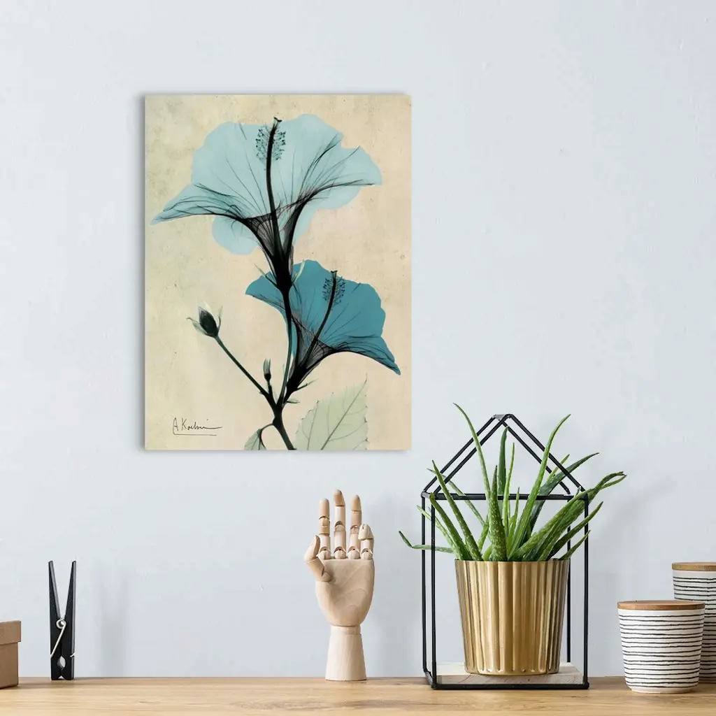 Vertical x-ray photograph of two hibiscus flowers against a faded earth toned background.
