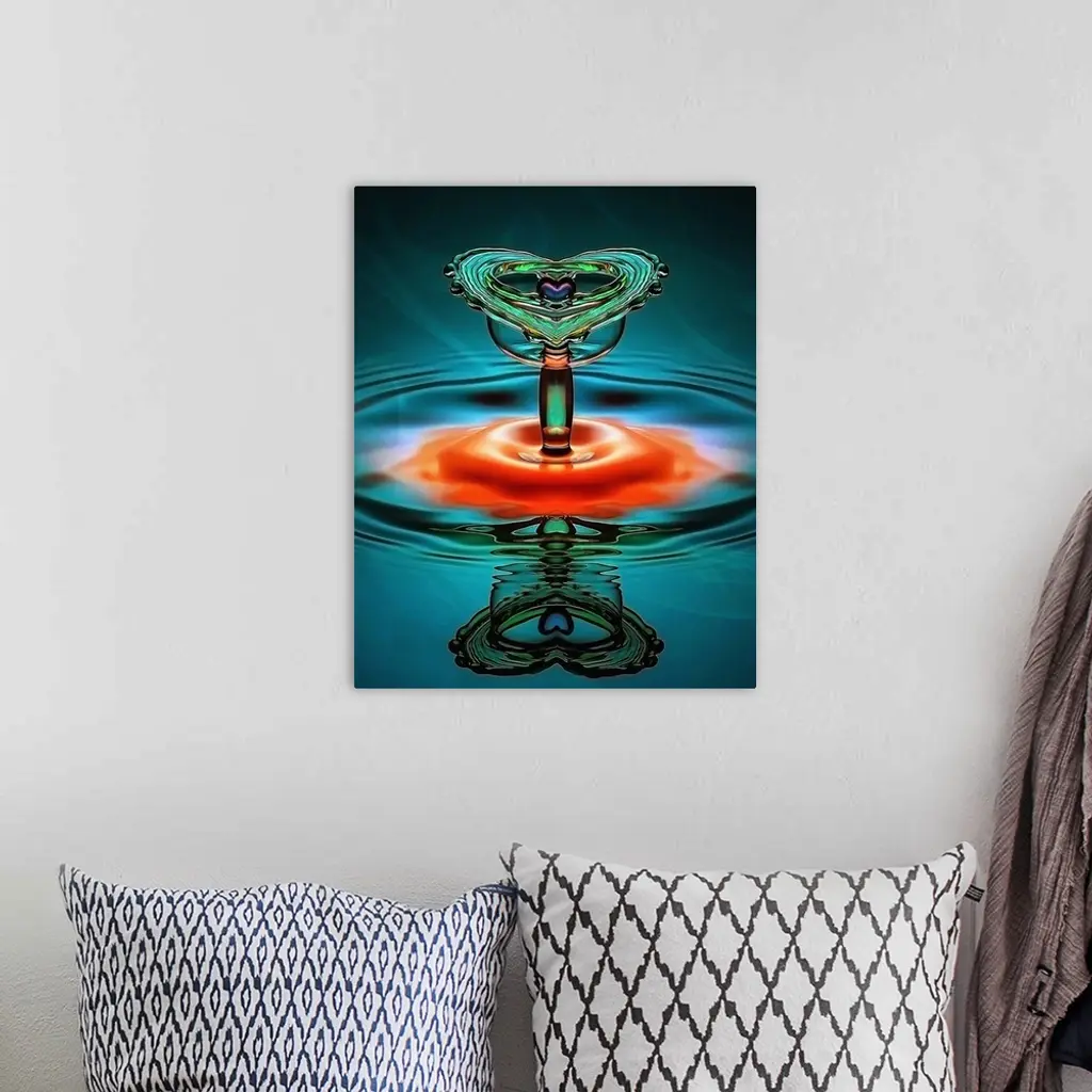 A droplet of liquid forms a heart shape as it splashes into the water.