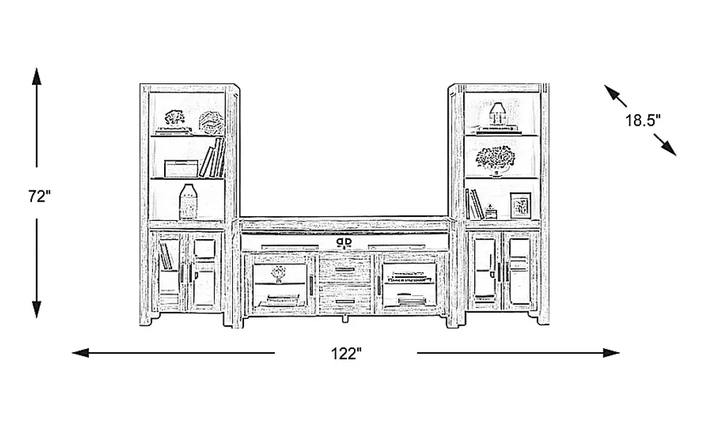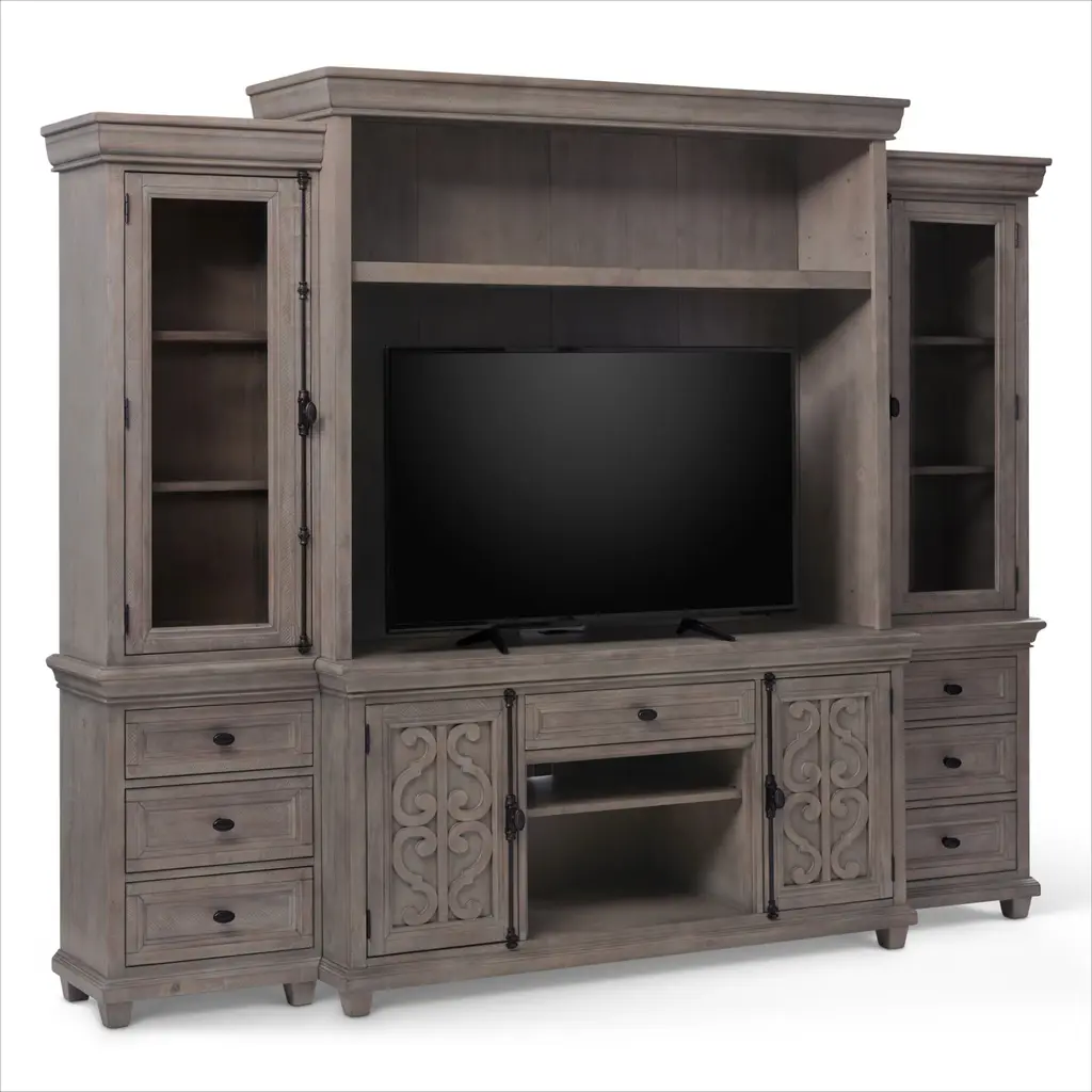 Offering the perfect place for your flat screen TV and more, the Hidden Springs II wall unit is a wonderful addition to your home. Crafted from acacia solids and veneers, the brushed gray finish is complemented with nickel finished hardware. Two doors feature glass fronts, while an open cubby and additional solid door cabinet provide plenty of room for electronic components or gaming systems with adjustable shelving for maximum flexibility. Side piers complete the unit with more shelves for display and storage