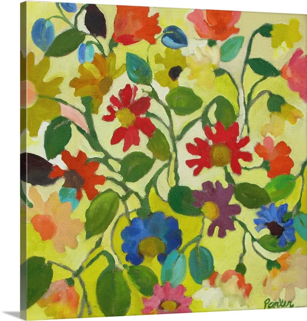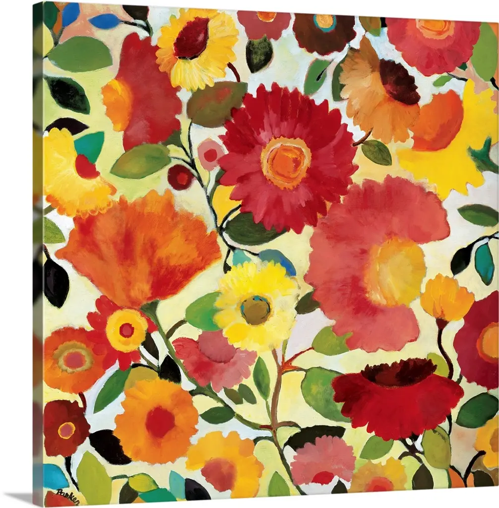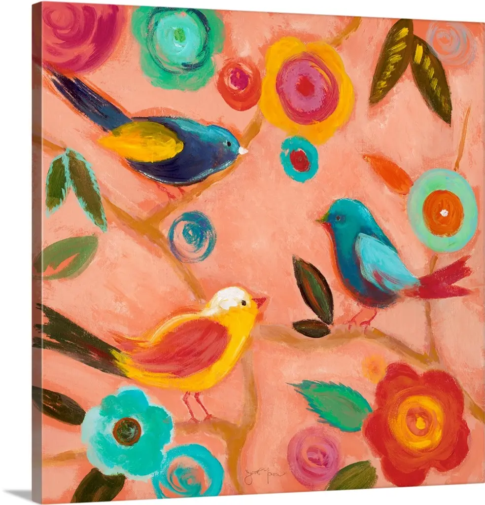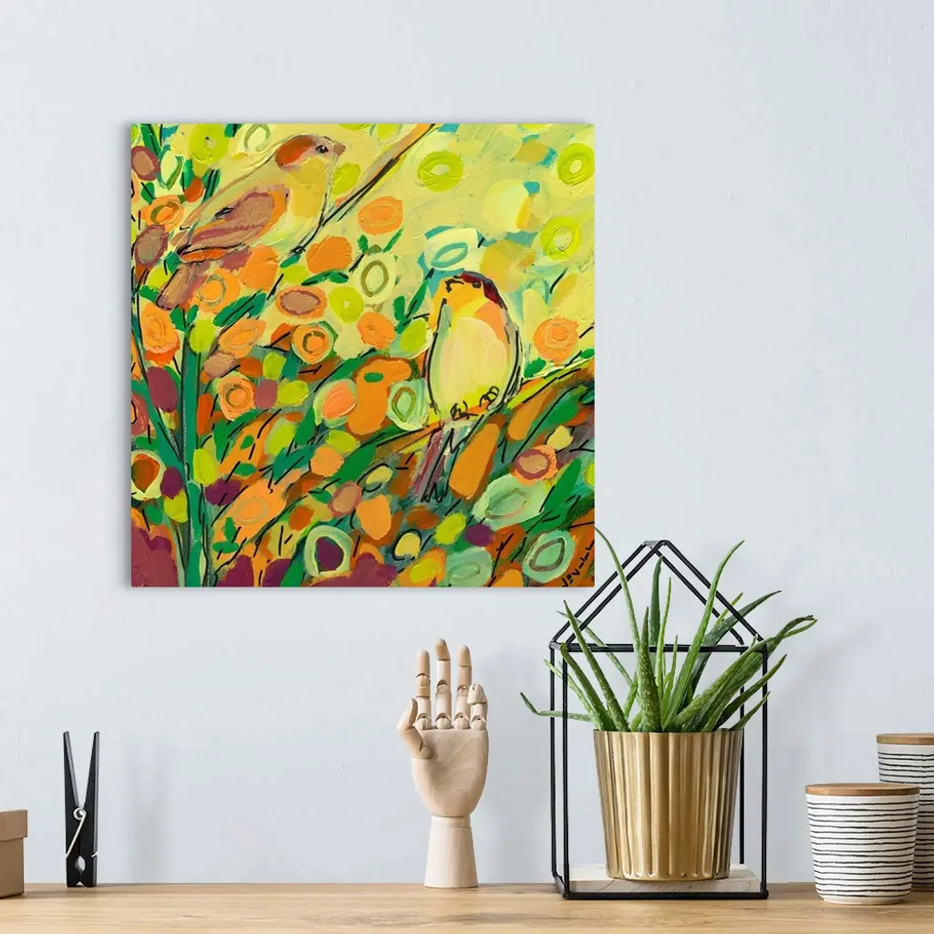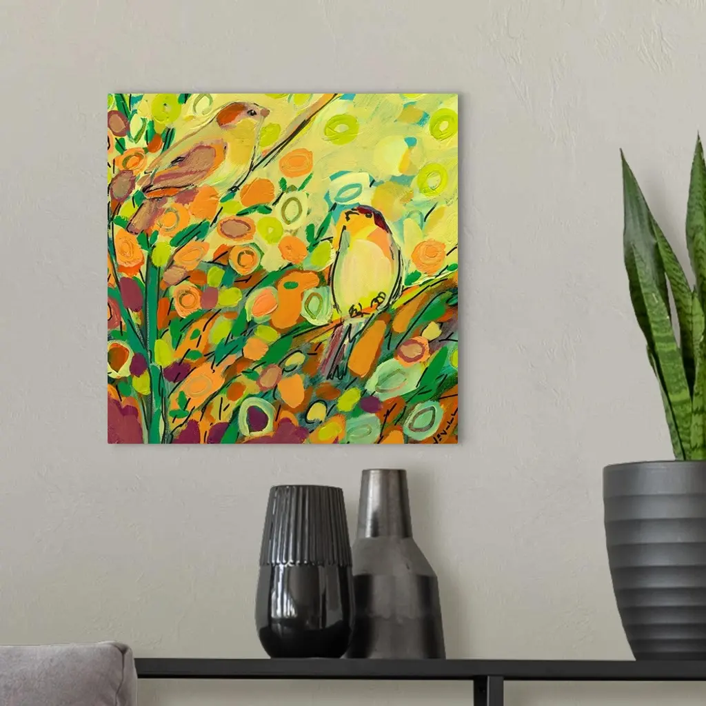 Giant contemporary art showcases a couple birds sitting on a tree branch during a sunny day. Artist heavily uses circles to represent the earth toned leaves on the tree.