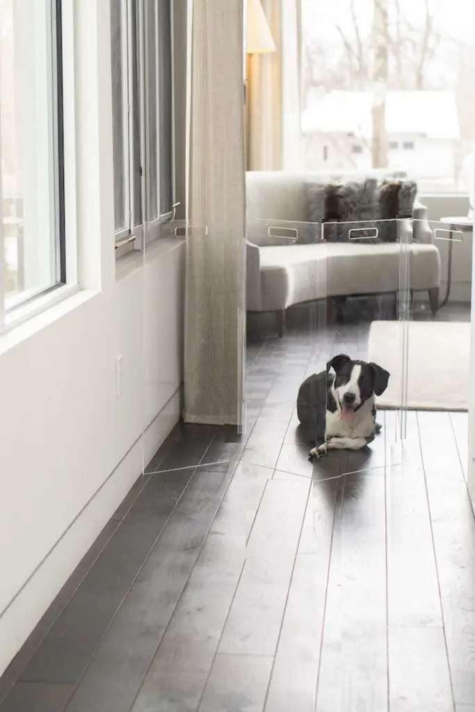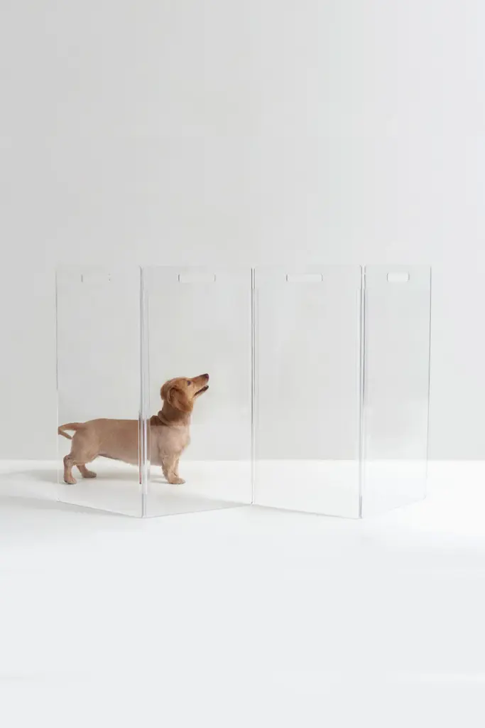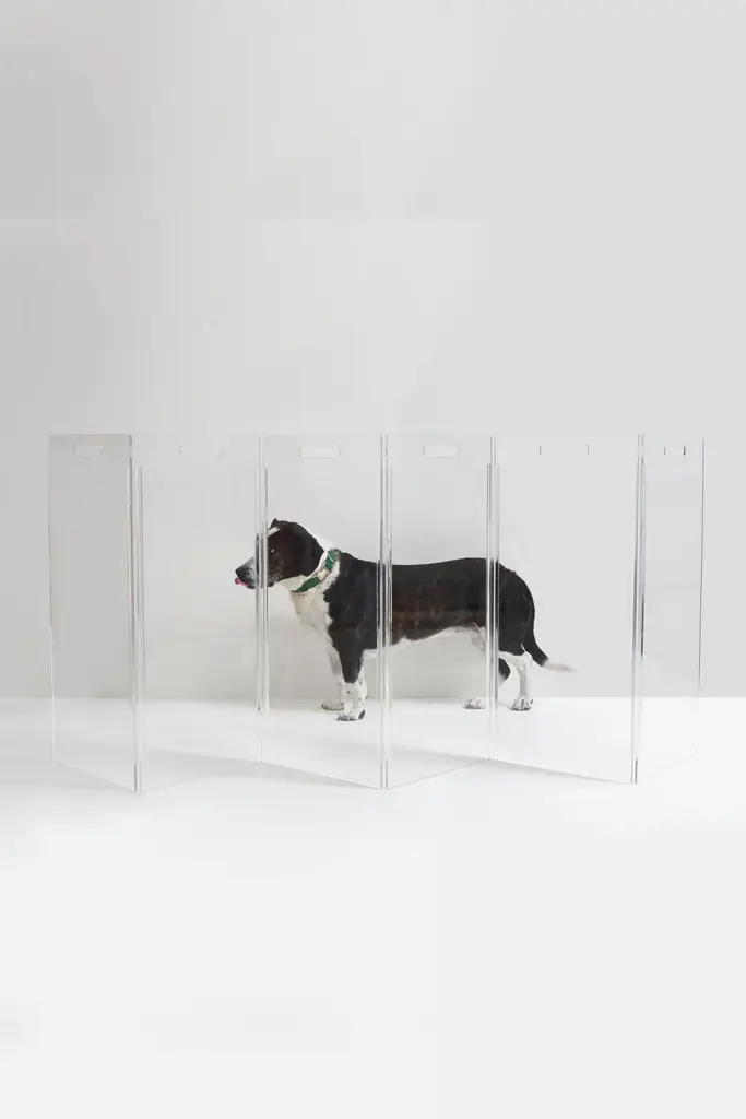 This folding zigzag gate is a stylish, adjustable pet barrier. It's lightweight, sturdy, and clear, ensuring total visibility. Position it in your doorway to withstand your dog's nudge.