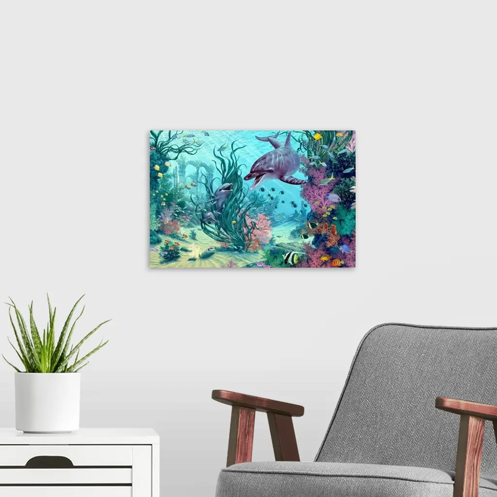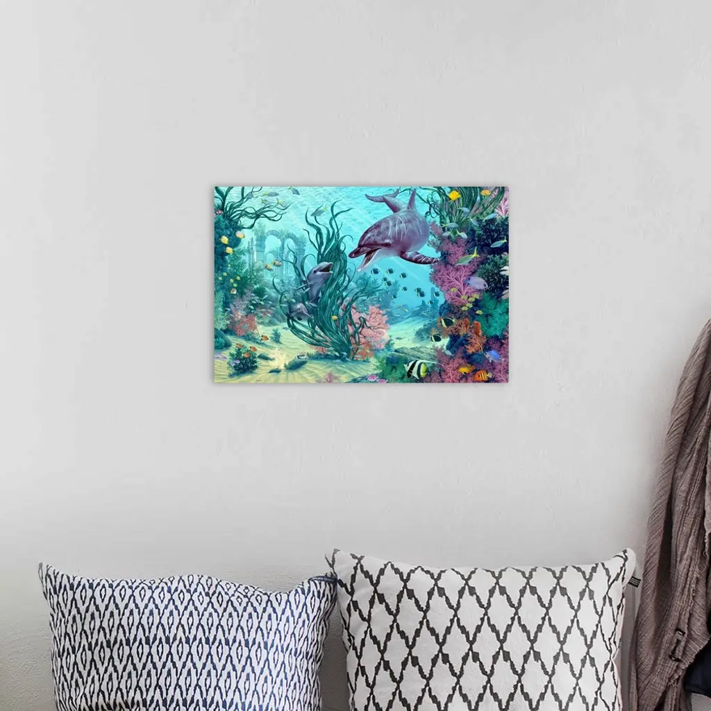 Hide And Seek Dolphins wall art for home and office decor. Discover canvas art prints, photos, mural, big canvas art and framed wall art in GreatBigCanvas.com's varied collections.