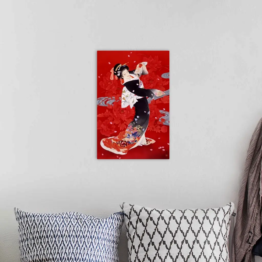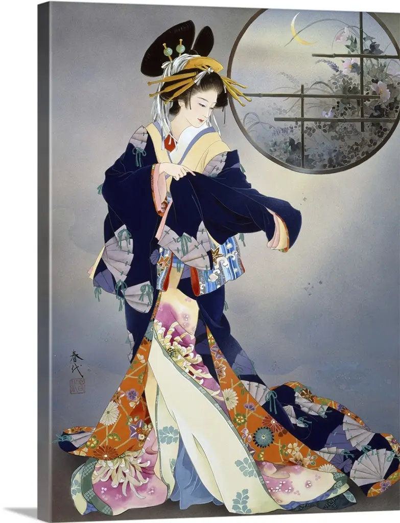Contemporary colorful Asian art of a Geisha in beautiful ornate clothing.