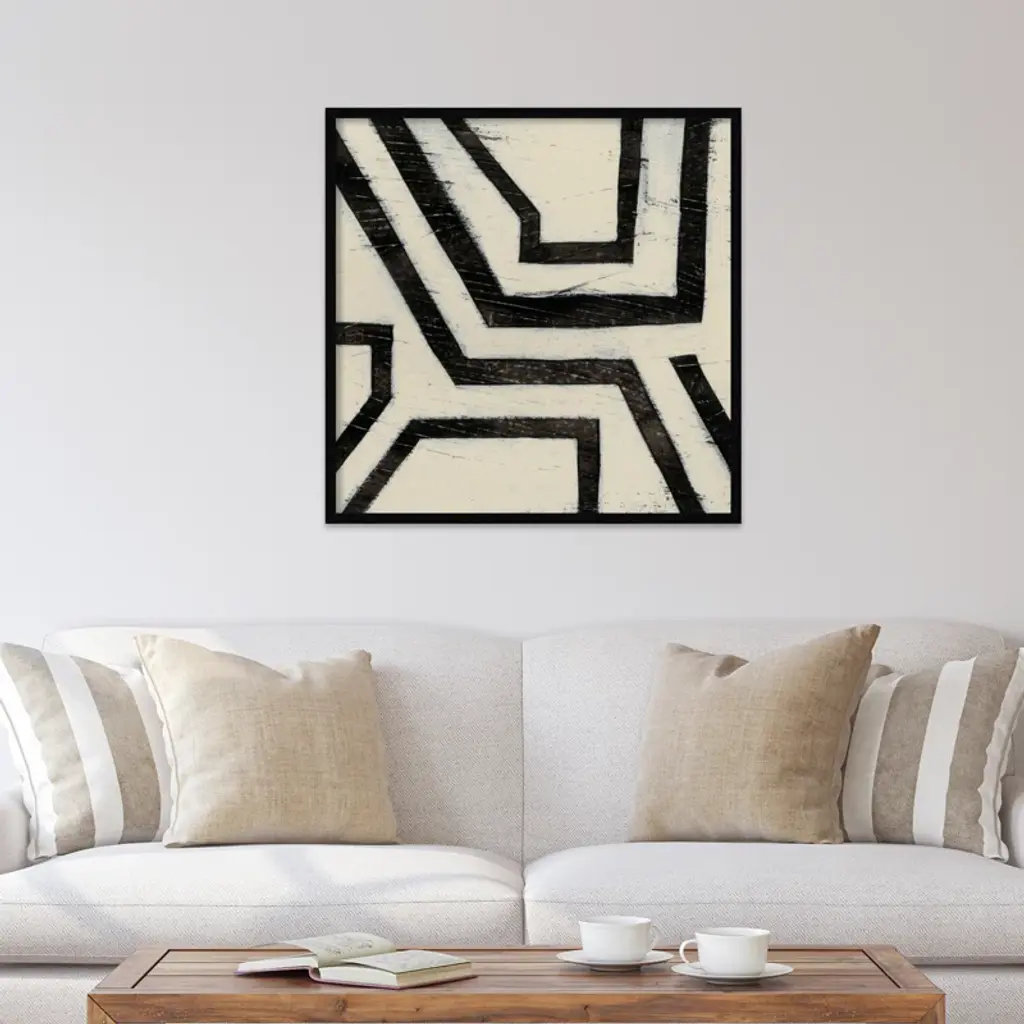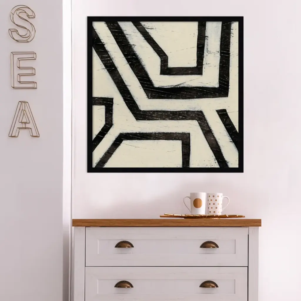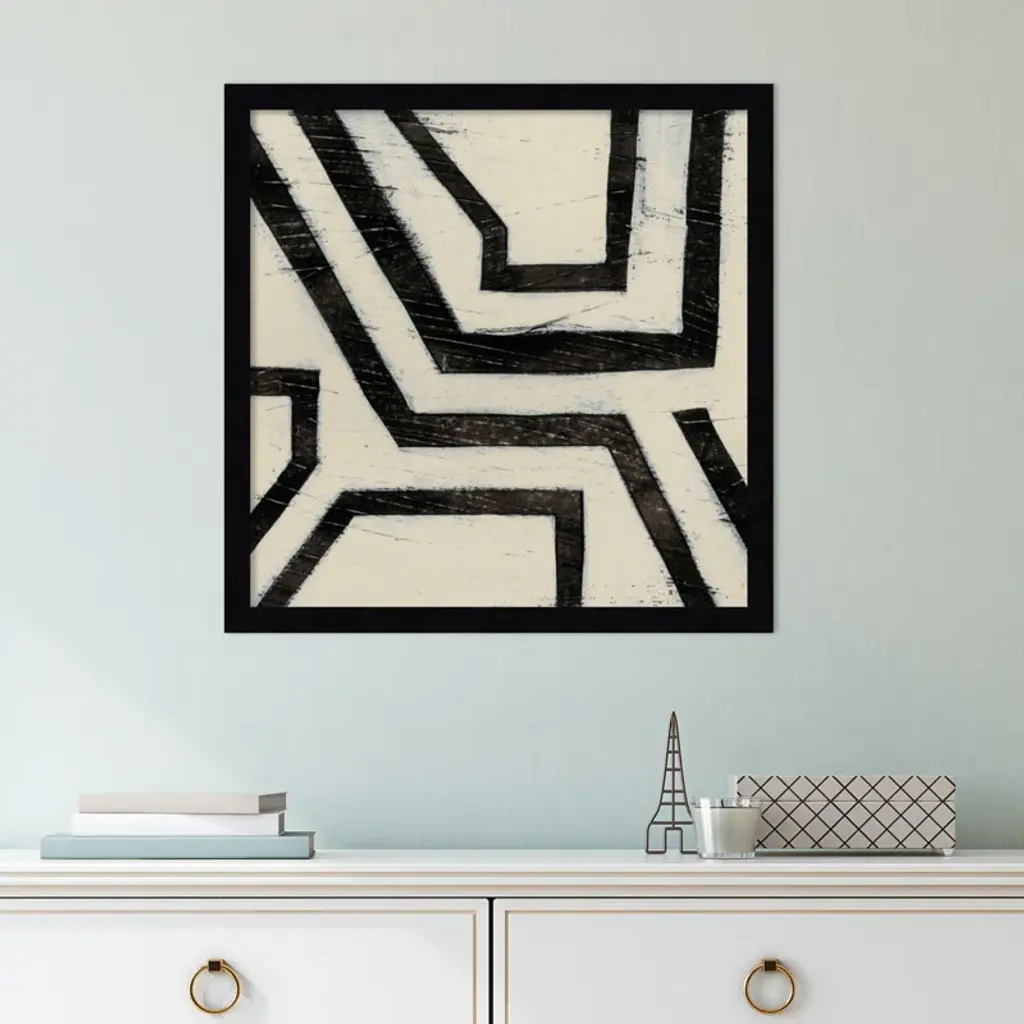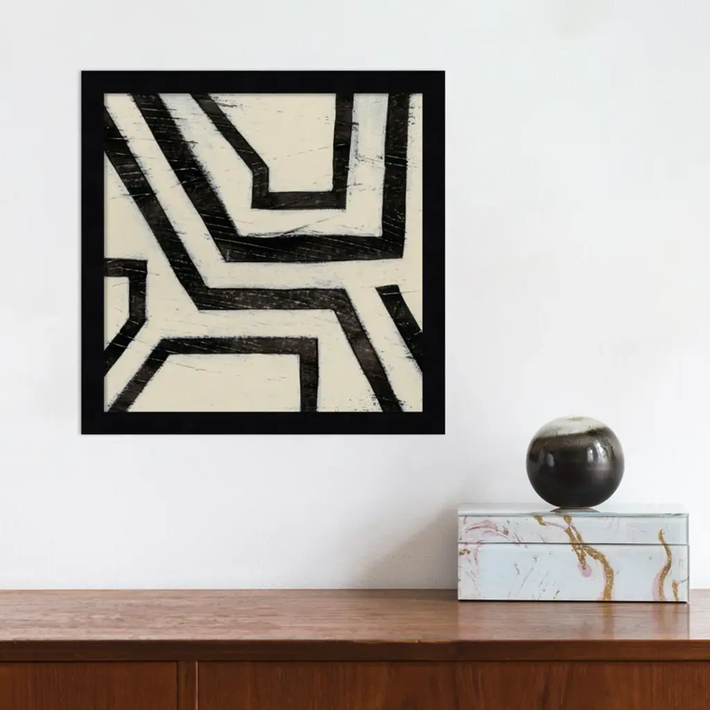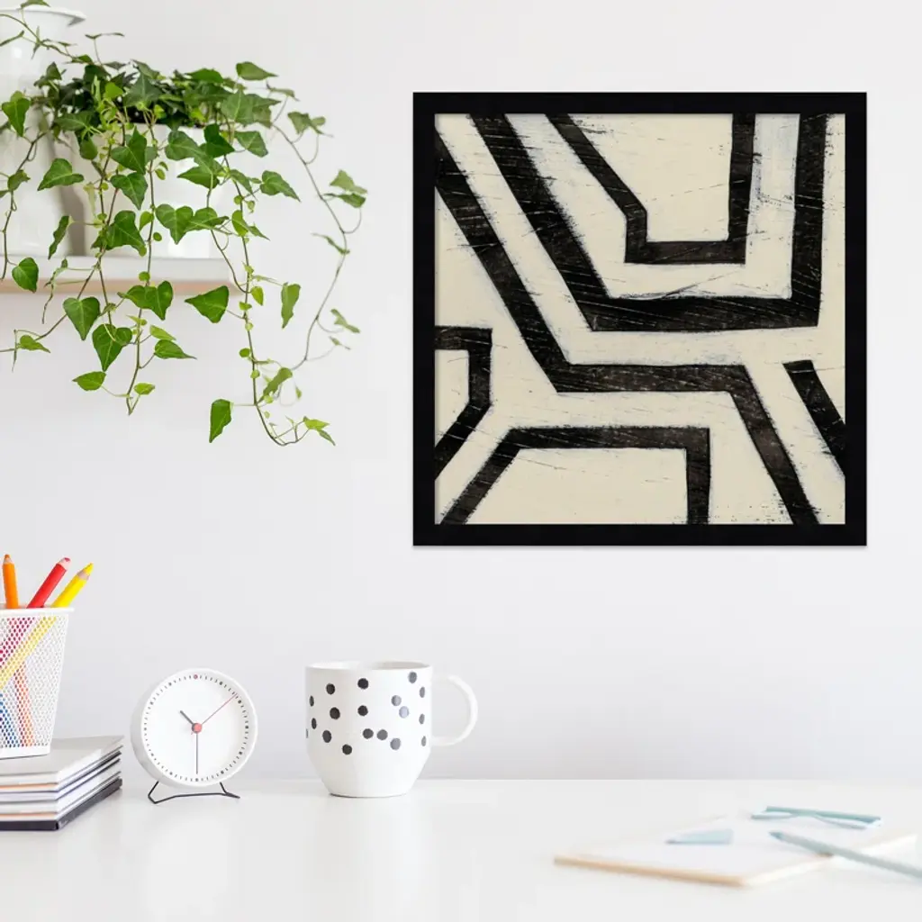 Make a modern impact. This wall print brings a bold touch to your office walls. Crisp black and beige lines show off a geometric abstract design that reminds us of an aerial map, indicating minimalist topographical details from a bird's eye view. A printed reproduction of an original piece by June Erica Vess, this wall art is printed on paper with giclee inks that resist fading, even in sunny rooms. Plus, it comes with a solid wood frame in a finish of your choice. Our favorite? It comes with wall hooks for easy installation.