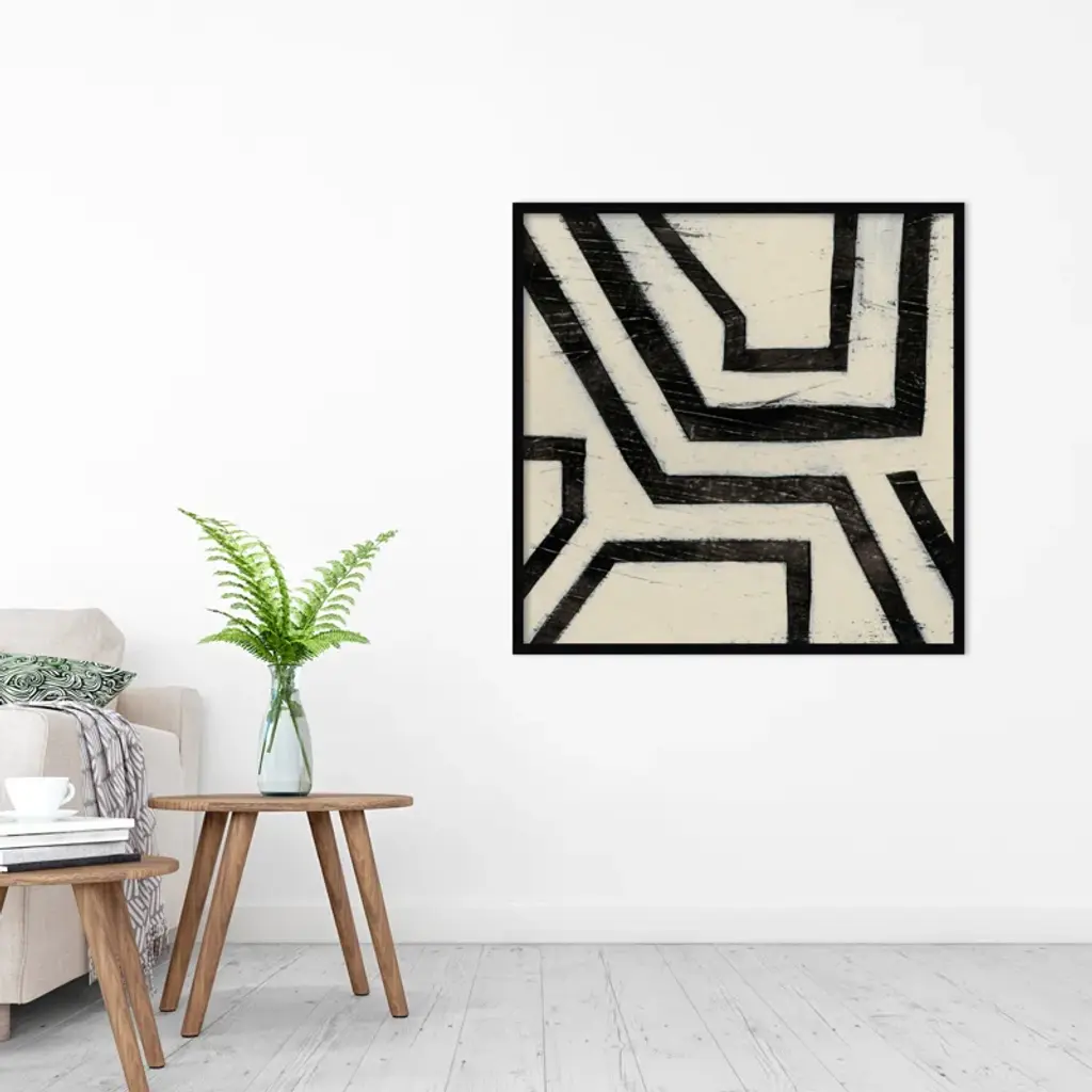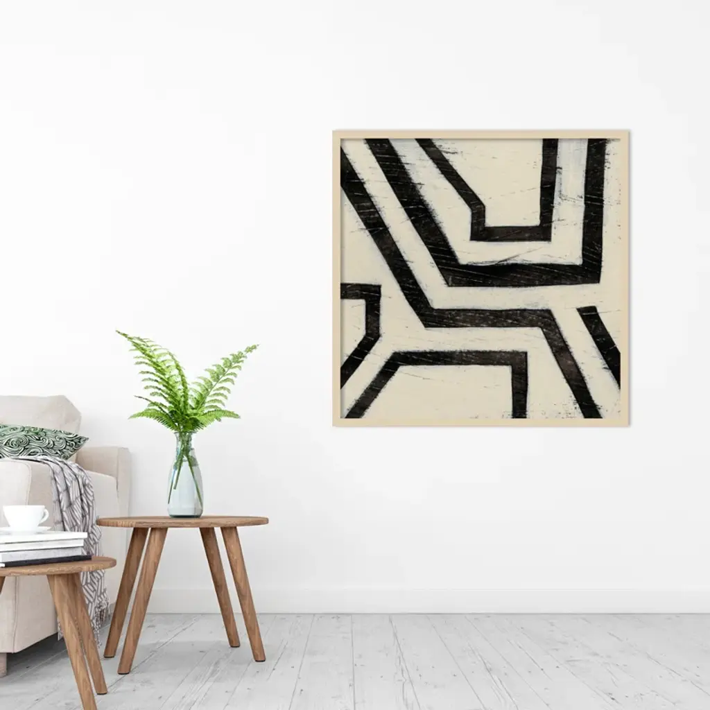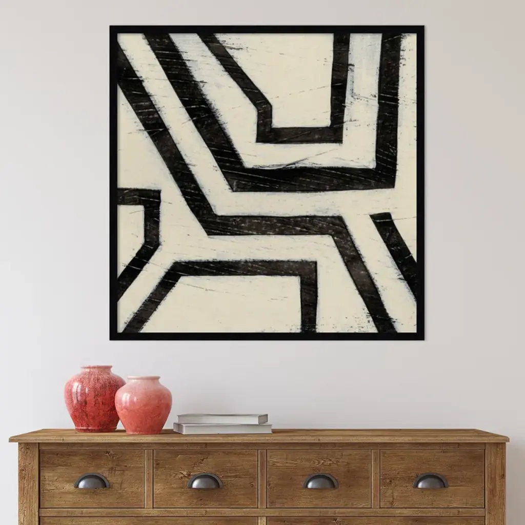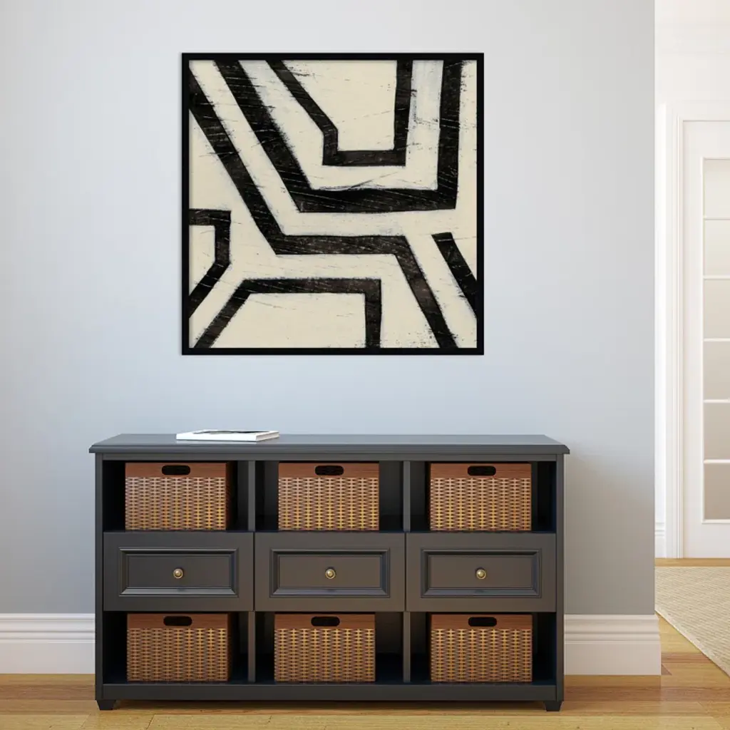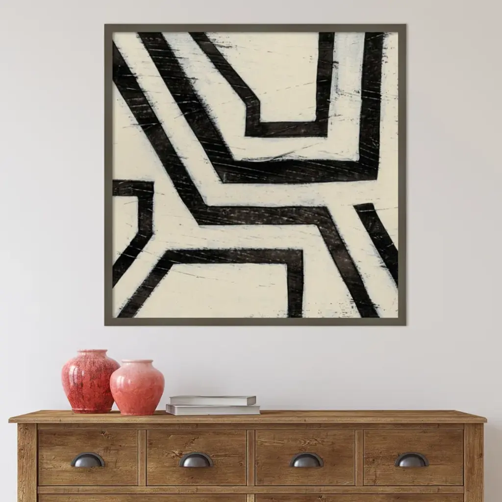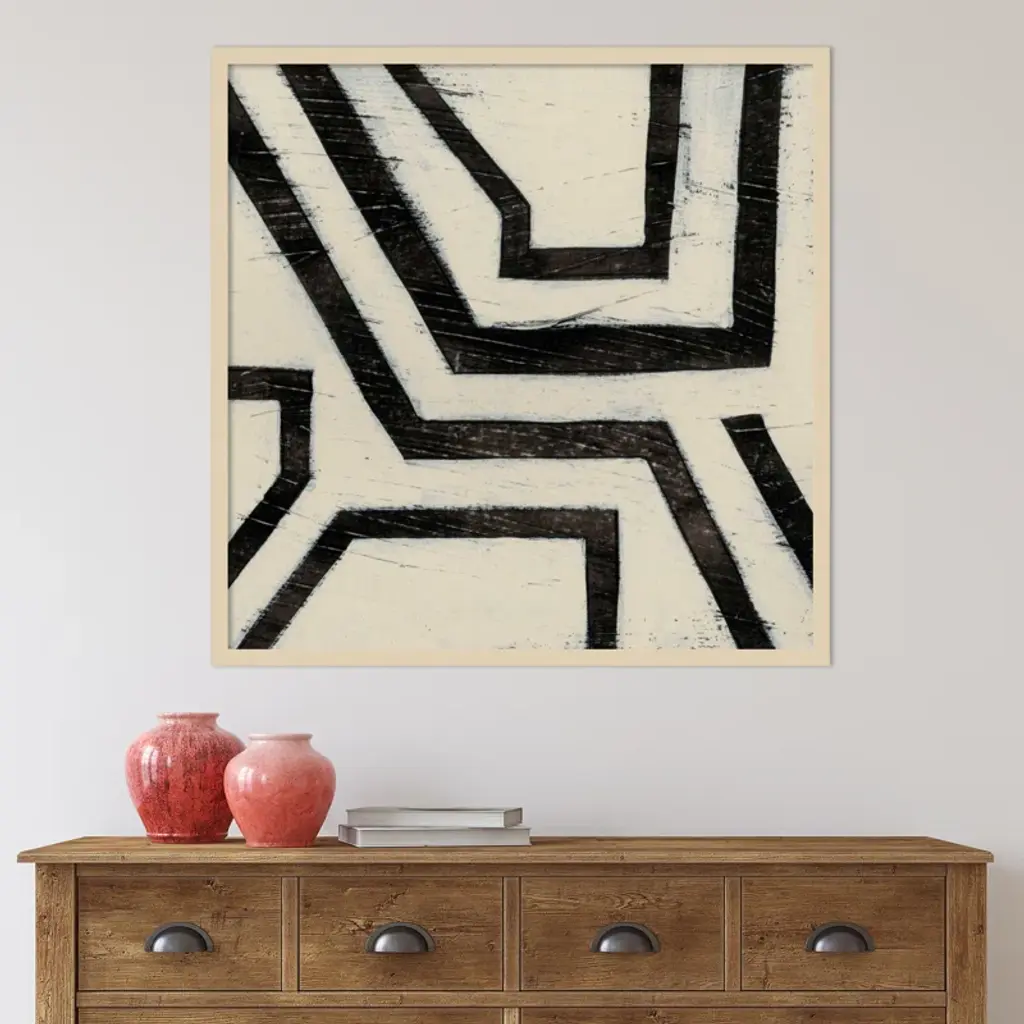 Make a modern impact. This wall print brings a bold touch to your office walls. Crisp black and beige lines show off a geometric abstract design that reminds us of an aerial map, indicating minimalist topographical details from a bird's eye view. A printed reproduction of an original piece by June Erica Vess, this wall art is printed on paper with giclee inks that resist fading, even in sunny rooms. Plus, it comes with a solid wood frame in a finish of your choice. Our favorite? It comes with wall hooks for easy installation.