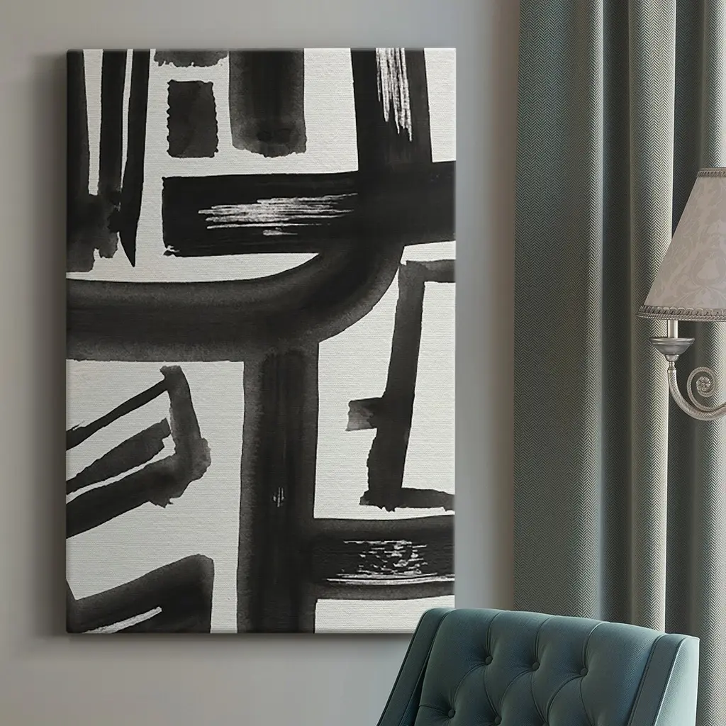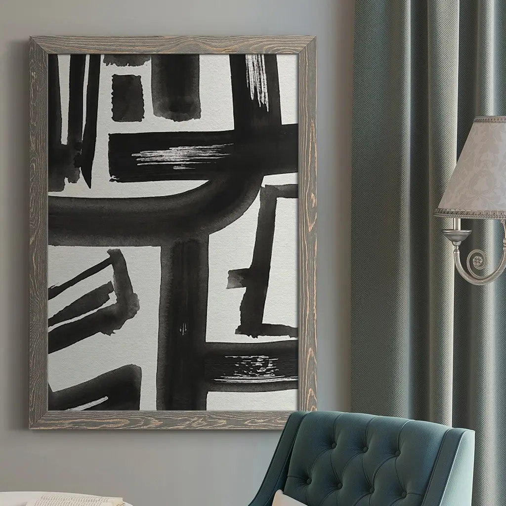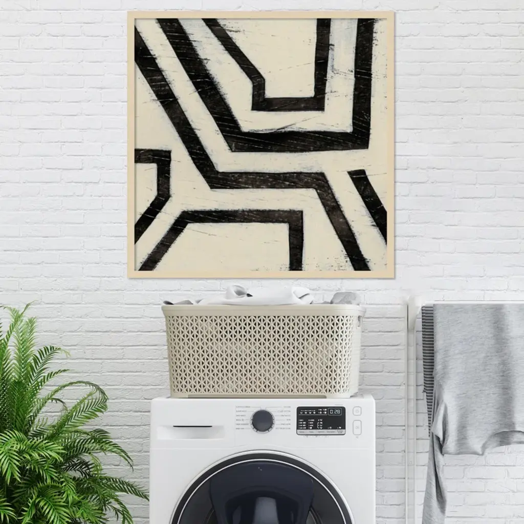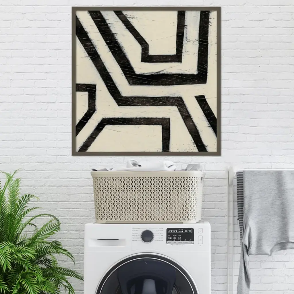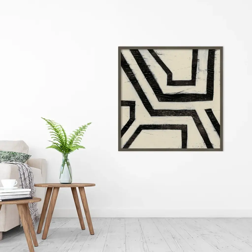 Make a modern impact. This wall print brings a bold touch to your office walls. Crisp black and beige lines show off a geometric abstract design that reminds us of an aerial map, indicating minimalist topographical details from a bird's eye view. A printed reproduction of an original piece by June Erica Vess, this wall art is printed on paper with giclee inks that resist fading, even in sunny rooms. Plus, it comes with a solid wood frame in a finish of your choice. Our favorite? It comes with wall hooks for easy installation.