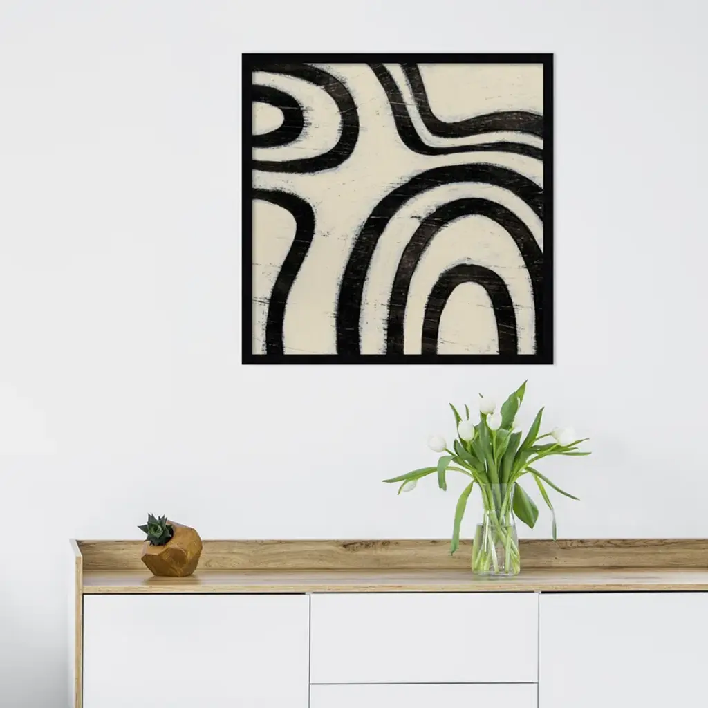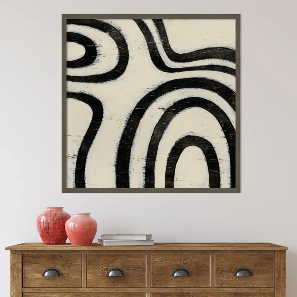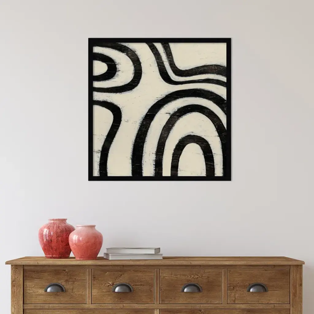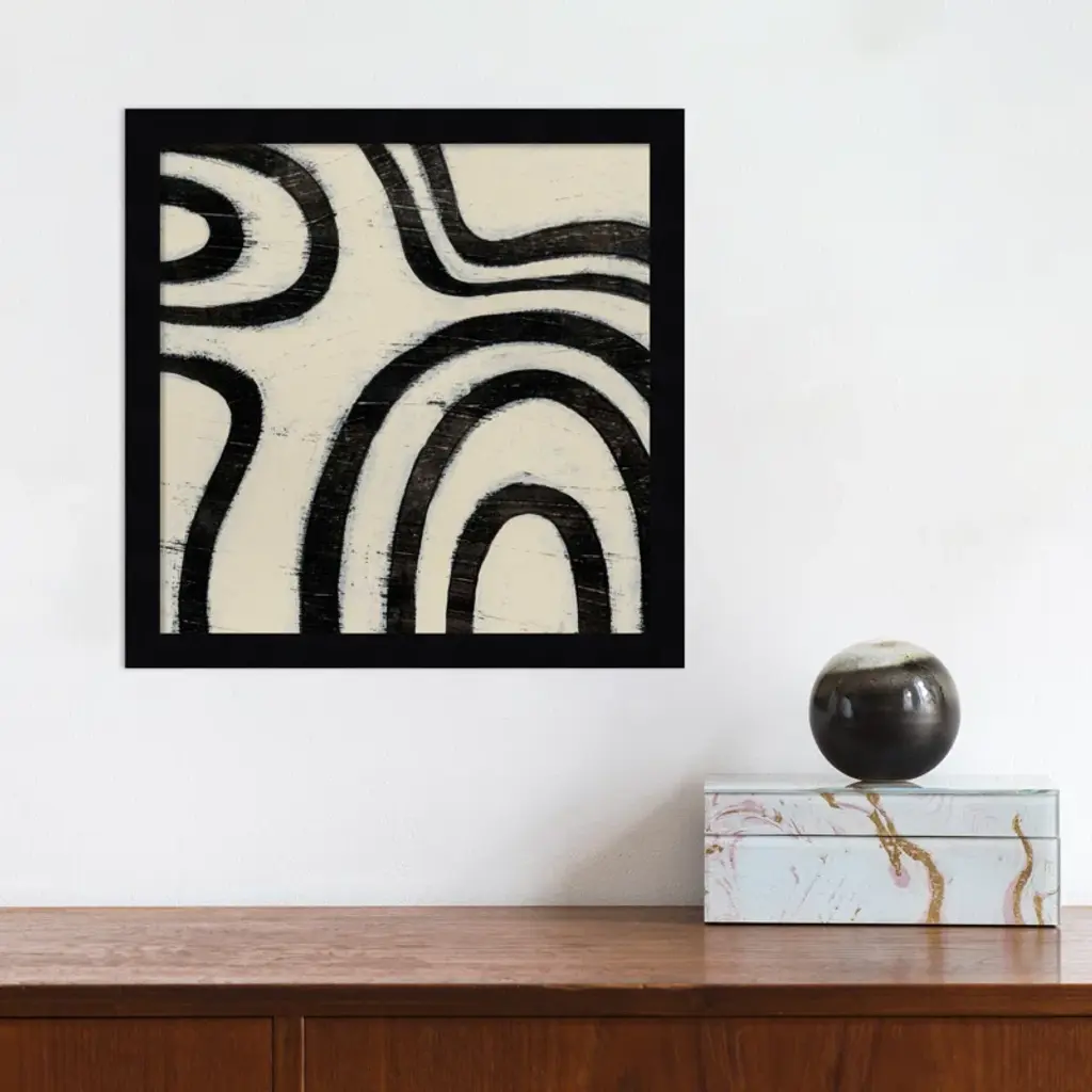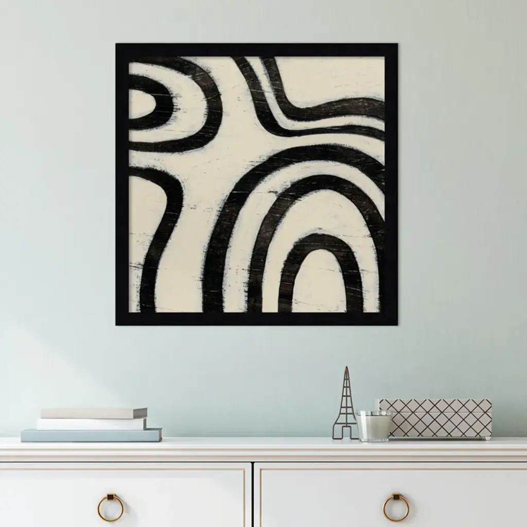 ART DESCRIPTION: Several lines create curved paths on a beige background. Six of them form concentric U shapes; three forming an arch in the lower right and three forming a sideways horseshoe in the upper left. Three more lines border and curve around these concentric U shaped lines.This framed art piece will be the perfect addition to any blank wall, be it in your living room, foyer, kitchen, bedroom bathroom, or other space. Our home decor products are made using traditional custom framing techniques that give you the quality you would expect from your local frame shop. Because our focus is on artistry, our products are used by architects, developers, interior designers, and homeowners alike to create beautiful functional living spaces. Features:ART DETAILS: Hieroglyph X by June Erica Vess. ARTIST BIO: Drawn simultaneously to classic illustration as well as mid-century design, artist June Erica Vess blurs the line between old and new. Whether working in the context of intricate patterns or sparse, gestural abstracts, she finds balance and beauty in the interplay of color, line, and shape.FRAME DETAILS: Framed in a solid wood frame.QUALITY AND AUTHENTICITY: Prints are giclee printed using fade-resistant inks for picture-perfect detail and incredible depth of color. They are protected with a shatterproof sheet of gallery-quality acrylic, which resists UV rays and light damage better than traditional glass. The artwork is authentically licensed.PROTECTIVE BACKING: Premium paper prints are permanently adhered to a rigid backer board to prevent rippling over time.HASSLE-FREE HANGING: Ready to hang for easy installation. All framed prints have a durable hanging wire attached to the back, along with a hanging hook and nail.ASSEMBLED IN THE USA: Finished artwork is professionally custom made by hand in Madison, WI USA.