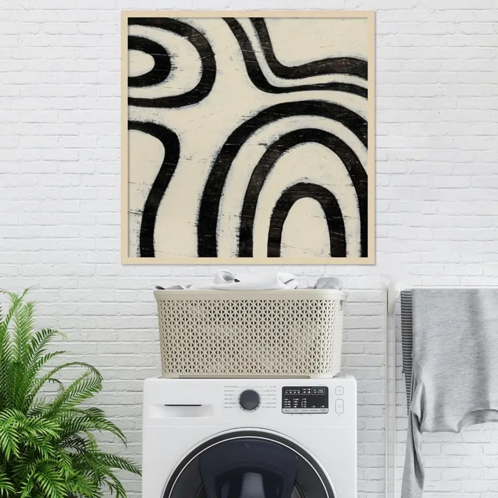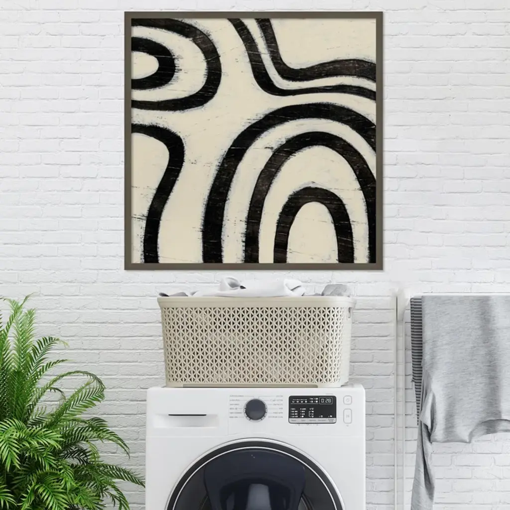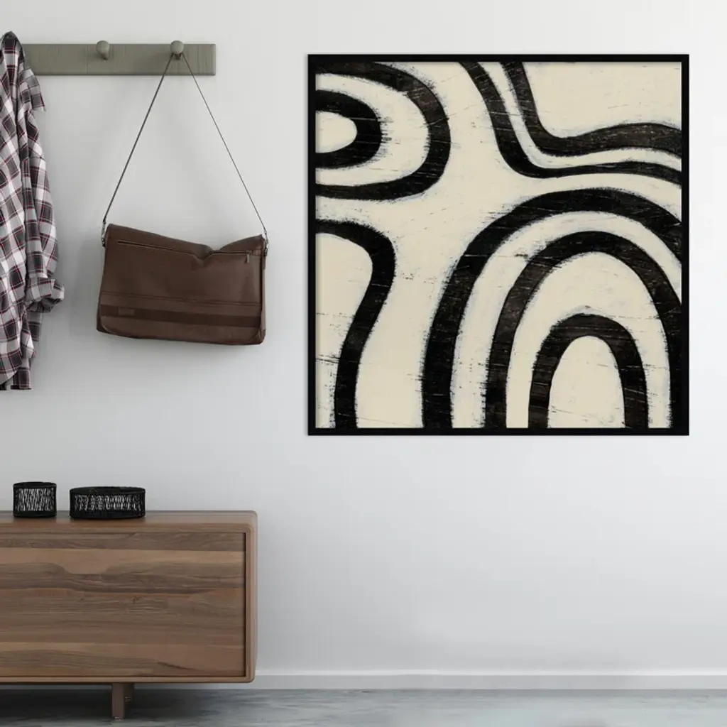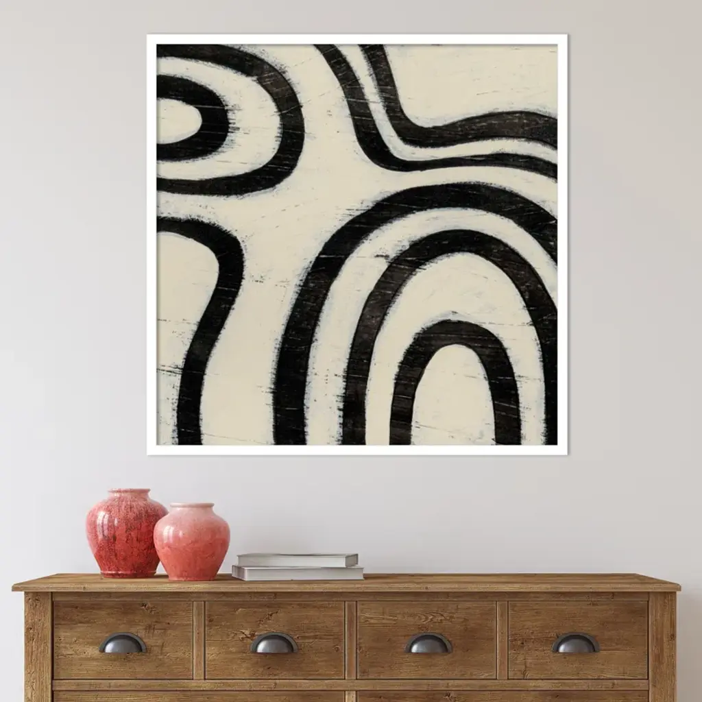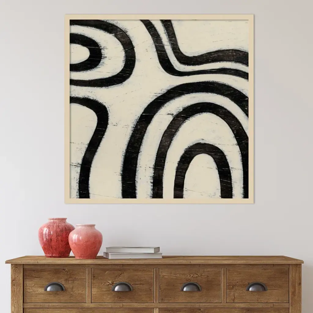 ART DESCRIPTION: Several lines create curved paths on a beige background. Six of them form concentric U shapes; three forming an arch in the lower right and three forming a sideways horseshoe in the upper left. Three more lines border and curve around these concentric U shaped lines.This framed art piece will be the perfect addition to any blank wall, be it in your living room, foyer, kitchen, bedroom bathroom, or other space. Our home decor products are made using traditional custom framing techniques that give you the quality you would expect from your local frame shop. Because our focus is on artistry, our products are used by architects, developers, interior designers, and homeowners alike to create beautiful functional living spaces. Features:ART DETAILS: Hieroglyph X by June Erica Vess. ARTIST BIO: Drawn simultaneously to classic illustration as well as mid-century design, artist June Erica Vess blurs the line between old and new. Whether working in the context of intricate patterns or sparse, gestural abstracts, she finds balance and beauty in the interplay of color, line, and shape.FRAME DETAILS: Framed in a solid wood frame.QUALITY AND AUTHENTICITY: Prints are giclee printed using fade-resistant inks for picture-perfect detail and incredible depth of color. They are protected with a shatterproof sheet of gallery-quality acrylic, which resists UV rays and light damage better than traditional glass. The artwork is authentically licensed.PROTECTIVE BACKING: Premium paper prints are permanently adhered to a rigid backer board to prevent rippling over time.HASSLE-FREE HANGING: Ready to hang for easy installation. All framed prints have a durable hanging wire attached to the back, along with a hanging hook and nail.ASSEMBLED IN THE USA: Finished artwork is professionally custom made by hand in Madison, WI USA.