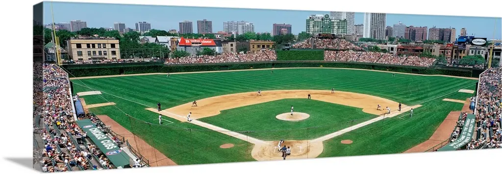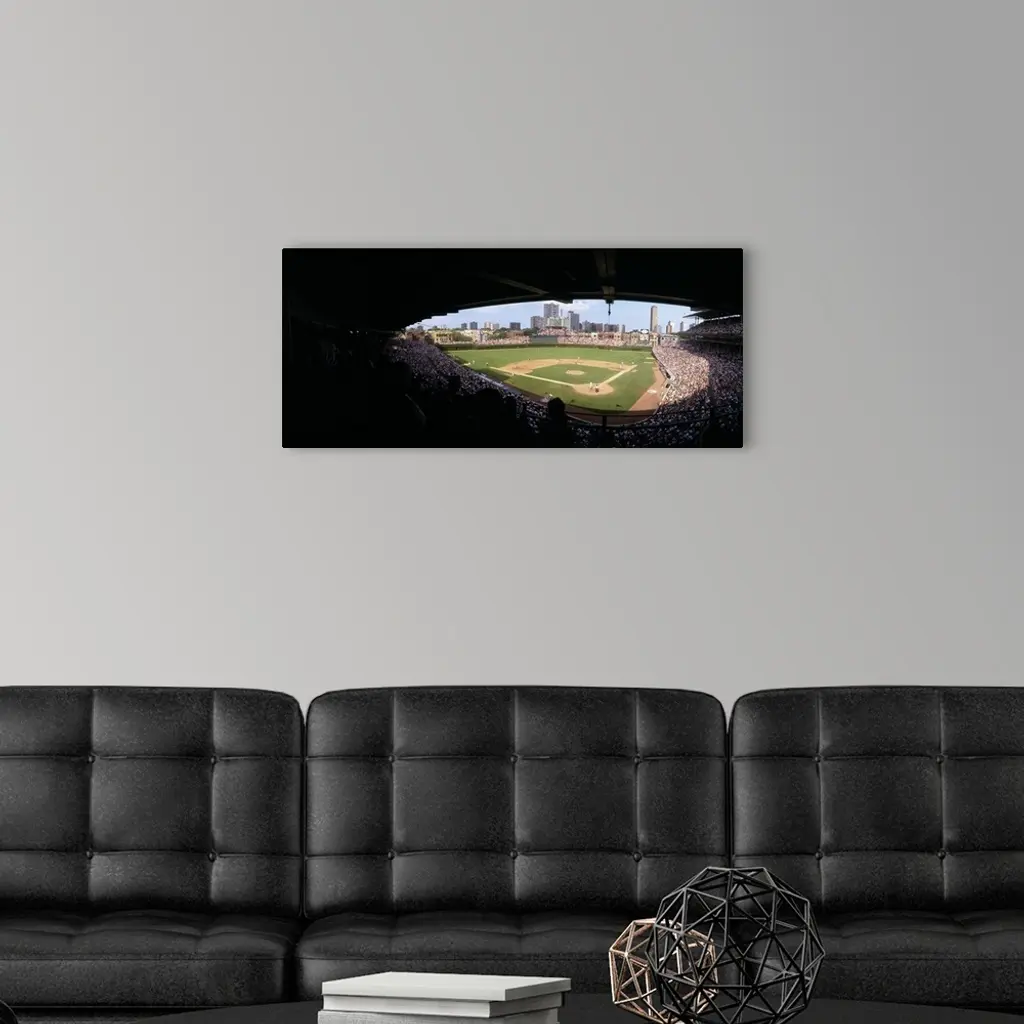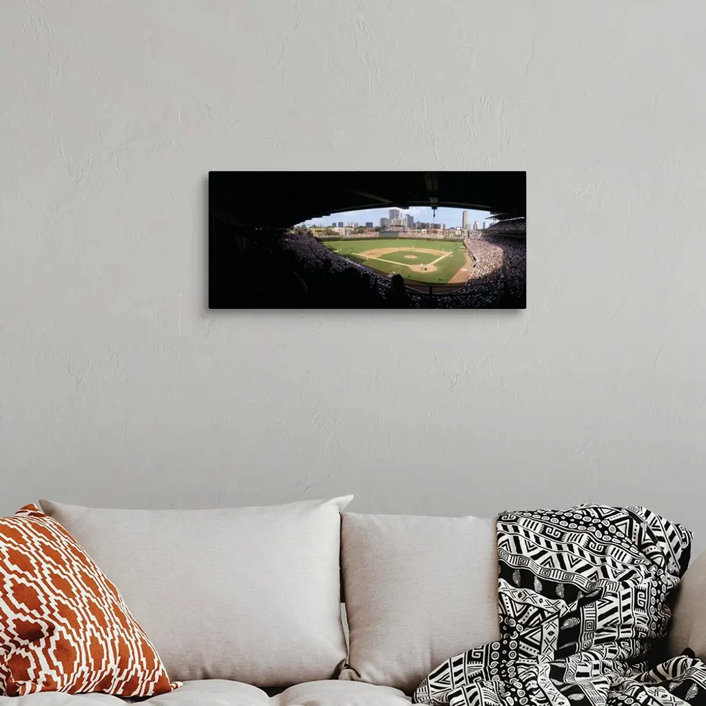 High angle view of a baseball stadium Wrigley Field Chicago Illinois wall art for home and office decor. Discover canvas art prints, photos, mural, big canvas art and framed wall art in GreatBigCanvas.com's varied collections.