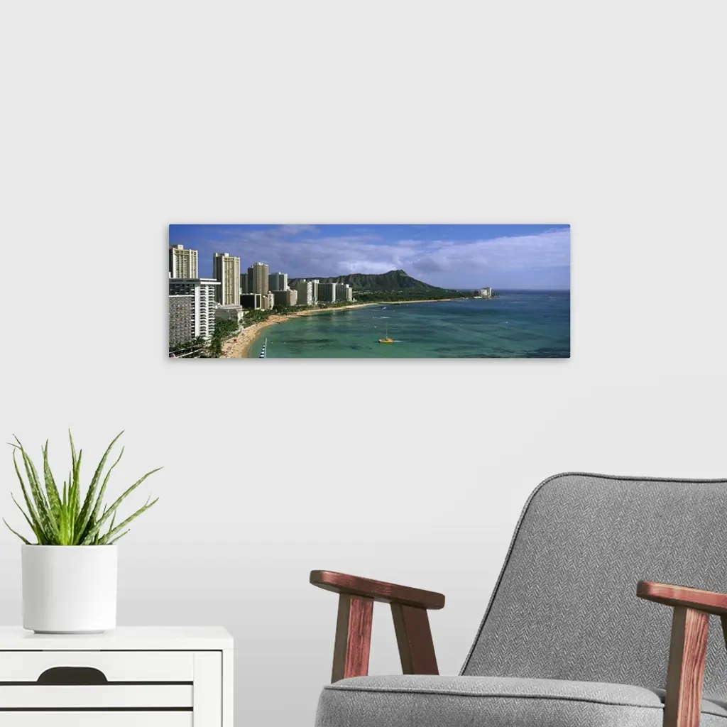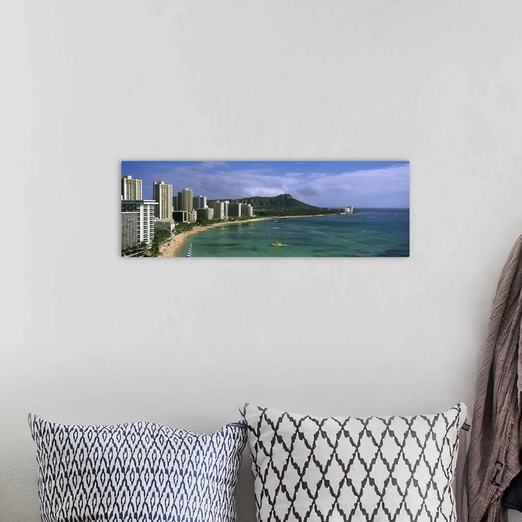 High angle view of a beach, Diamond Head, Waikiki Beach, Oahu, Hawaii wall art for home and office decor. Discover canvas art prints, photos, mural, big canvas art and framed wall art in GreatBigCanvas.com's varied collections.