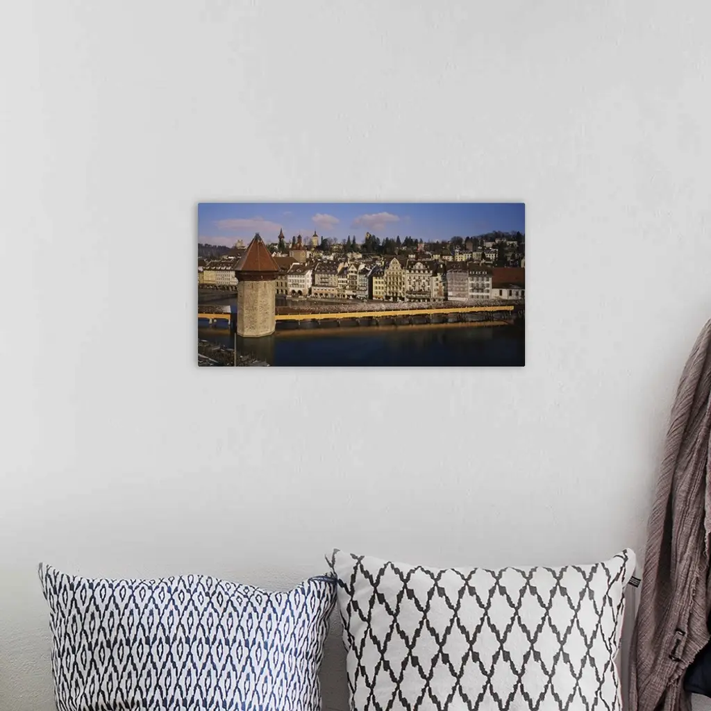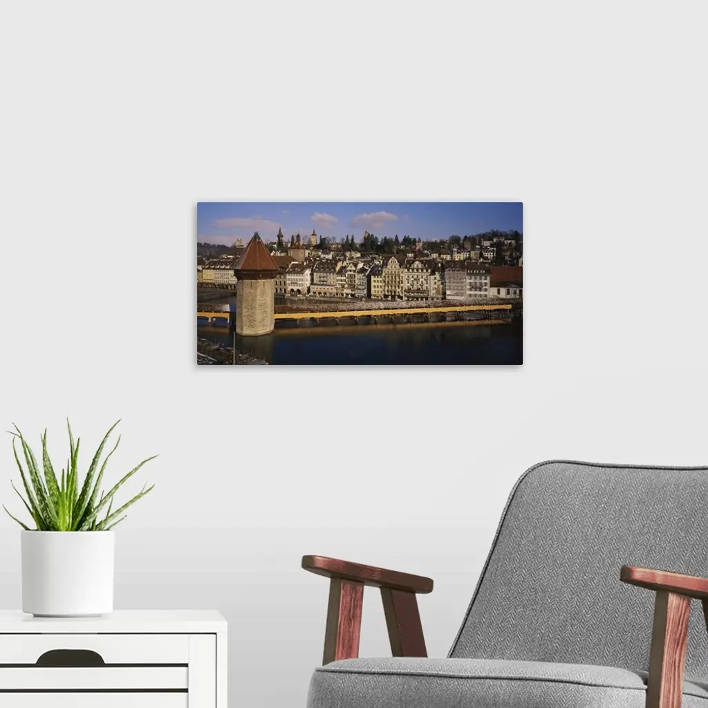 High angle view of a bridge across a river, Chapel Bridge, Reuss River, Lucerne, Switzerland wall art for home and office decor. Discover canvas art prints, photos, mural, big canvas art and framed wall art in GreatBigCanvas.com's varied collections.