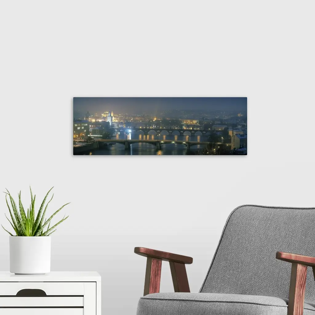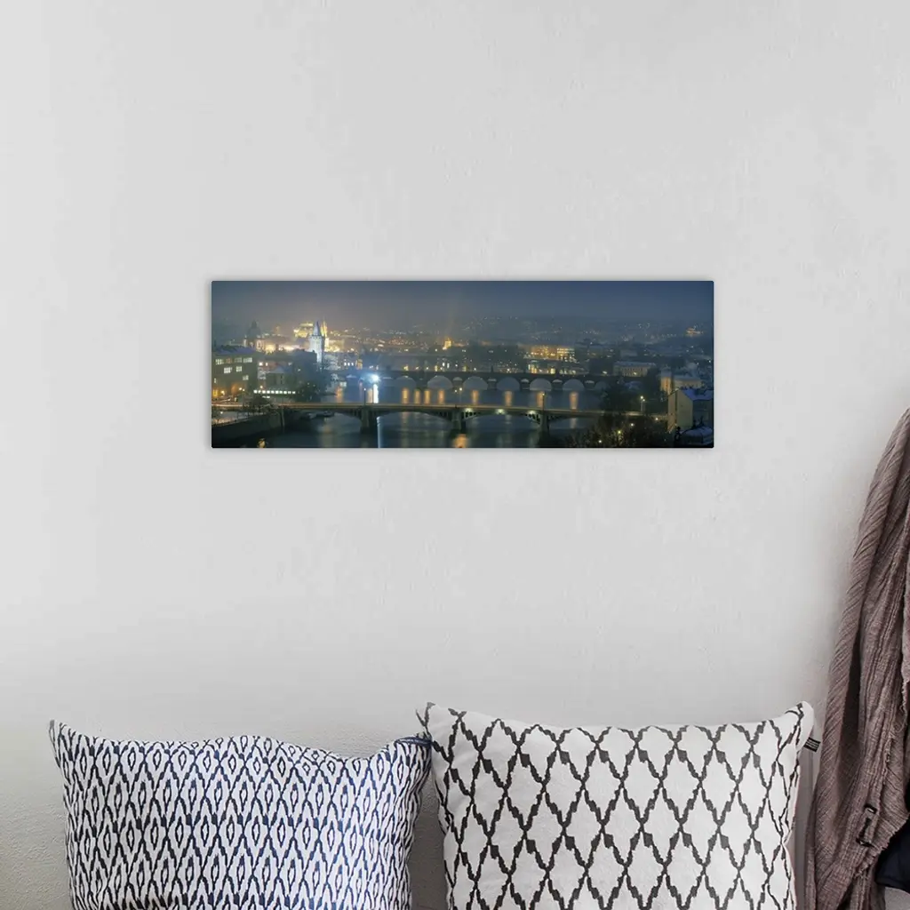 High angle view of a bridge at dusk, Charles Bridge, Prague, Czech Republic wall art for home and office decor. Discover canvas art prints, photos, mural, big canvas art and framed wall art in GreatBigCanvas.com's varied collections.