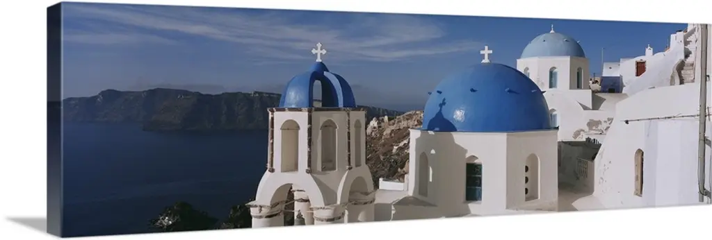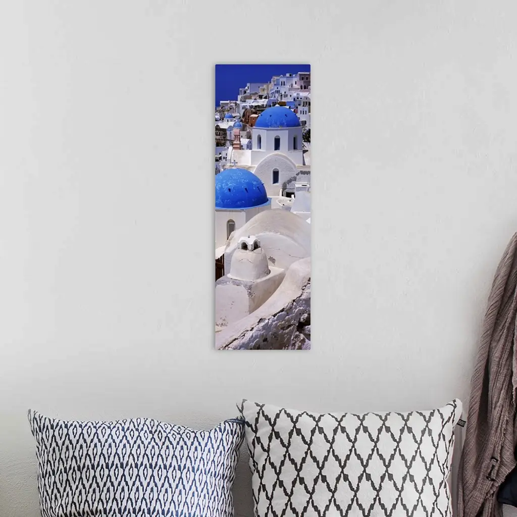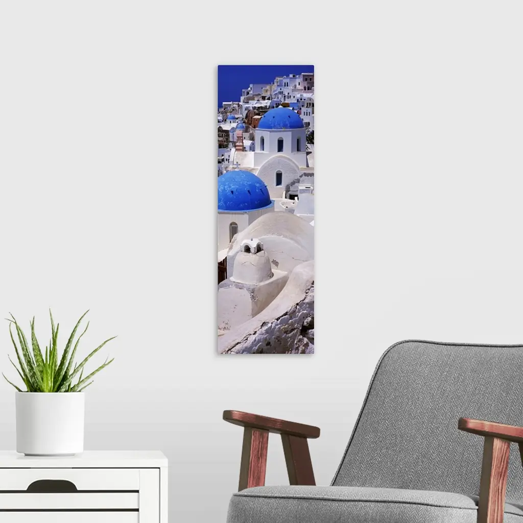High angle view of a church, Oia, Santorini, Greece wall art for home and office decor. Discover canvas art prints, photos, mural, big canvas art and framed wall art in GreatBigCanvas.com's varied collections.