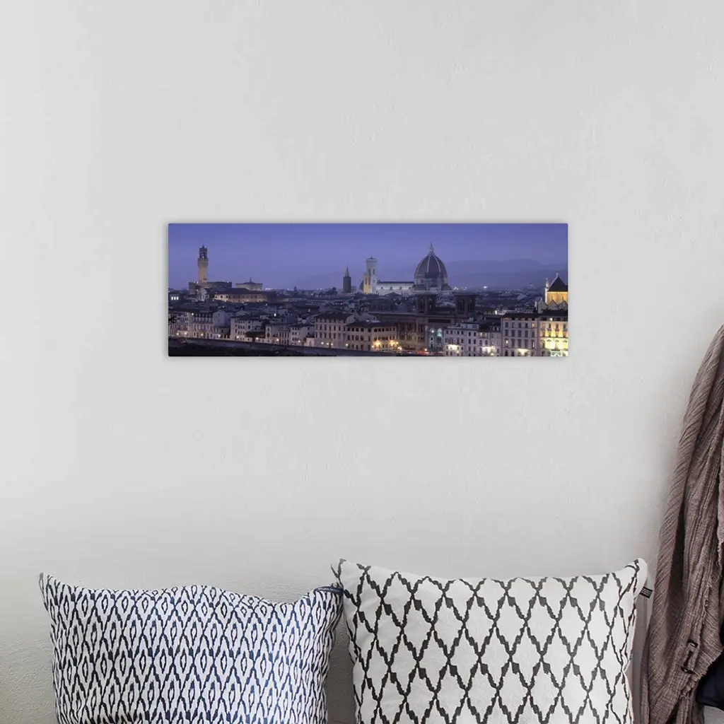 High angle view of a city at dusk, Florence, Tuscany, Italy wall art for home and office decor. Discover canvas art prints, photos, mural, big canvas art and framed wall art in GreatBigCanvas.com's varied collections.
