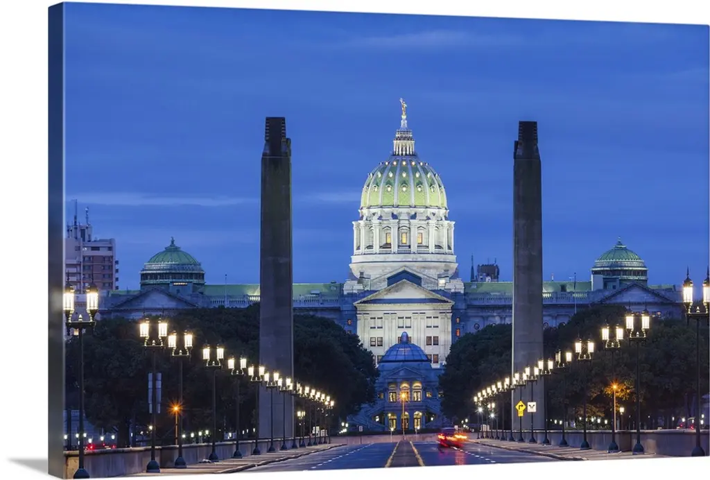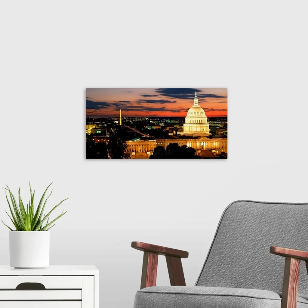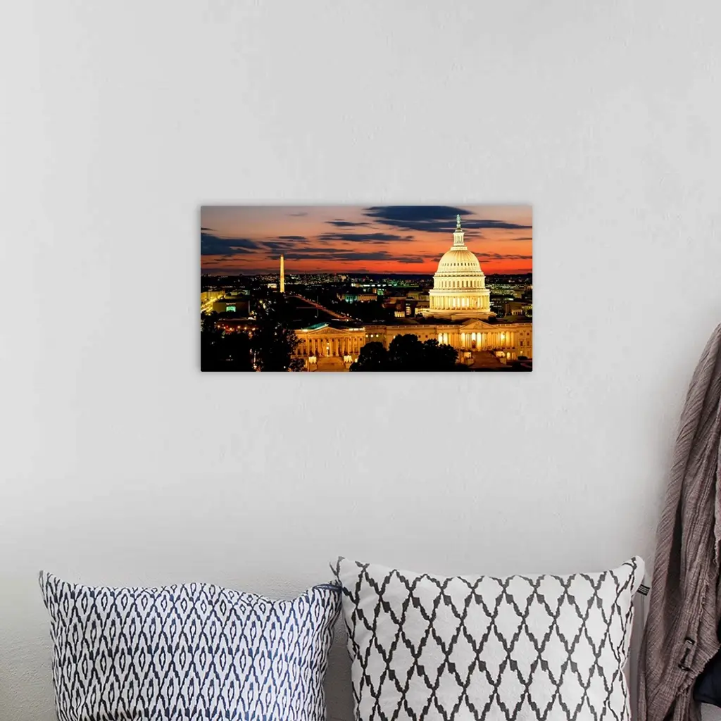 High angle view of a city lit up at dusk, Washington DC wall art for home and office decor. Discover canvas art prints, photos, mural, big canvas art and framed wall art in GreatBigCanvas.com's varied collections.