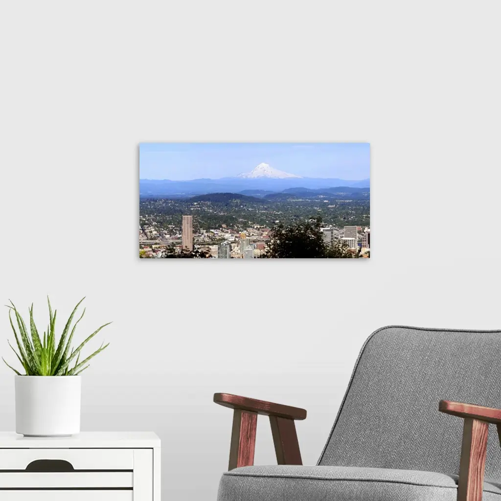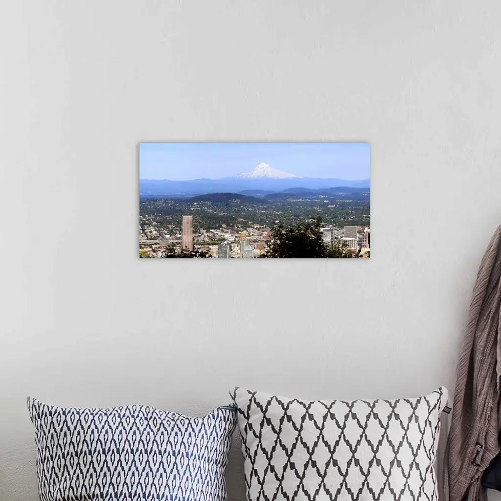 High angle view of a city, Mt Hood, Portland, Oregon wall art for home and office decor. Discover canvas art prints, photos, mural, big canvas art and framed wall art in GreatBigCanvas.com's varied collections.