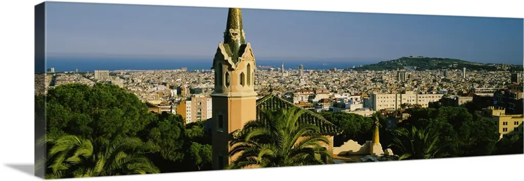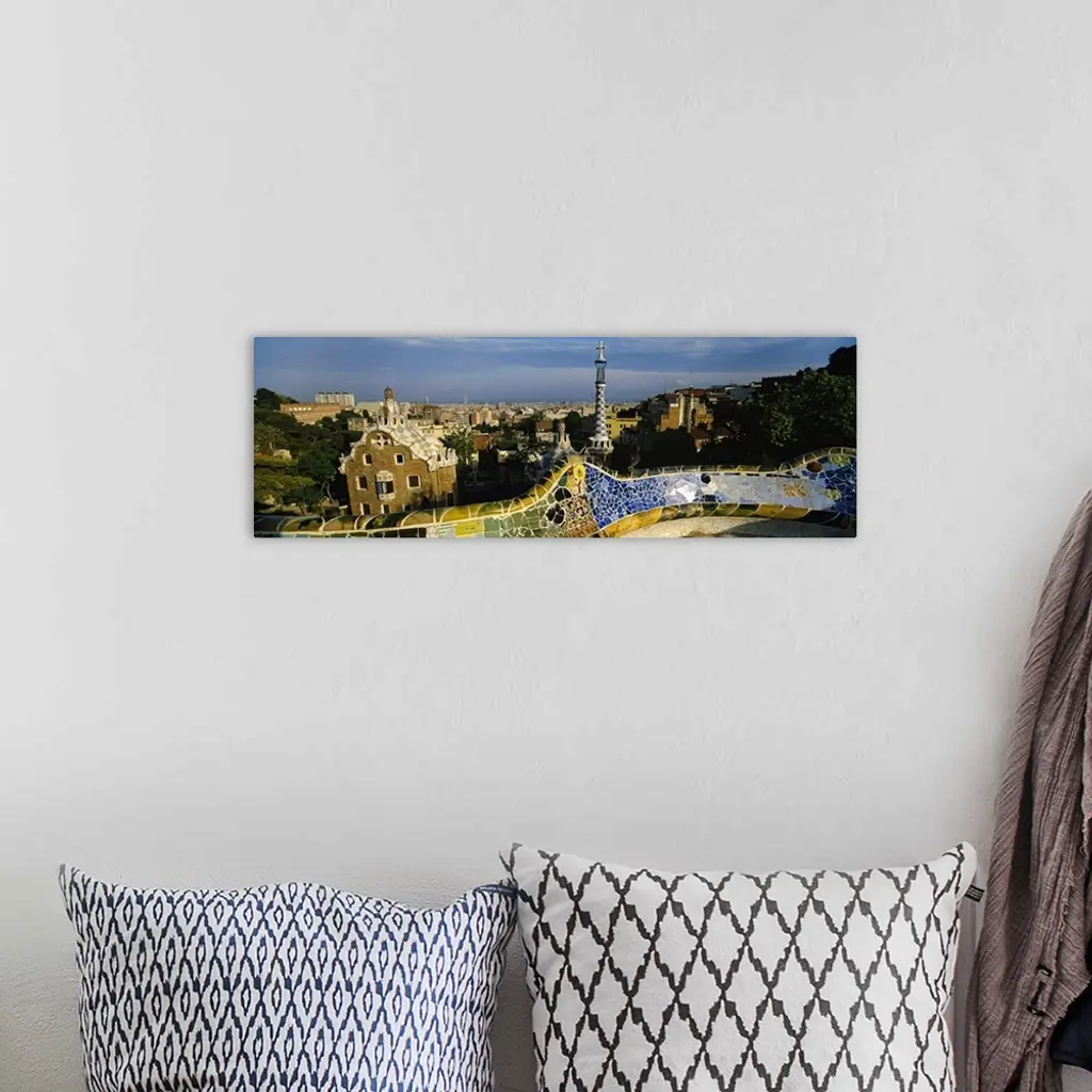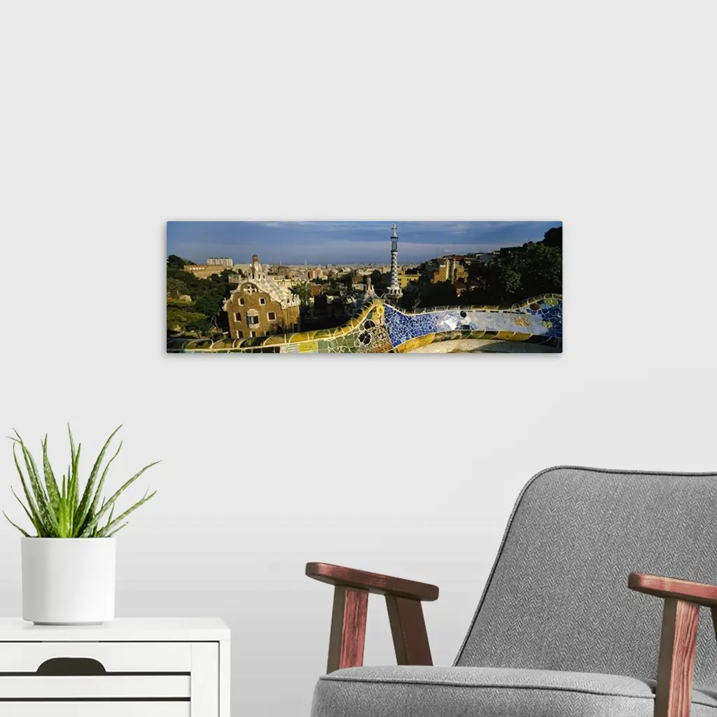High angle view of a city, Parc Guell, Barcelona, Catalonia, Spain wall art for home and office decor. Discover canvas art prints, photos, mural, big canvas art and framed wall art in GreatBigCanvas.com's varied collections.
