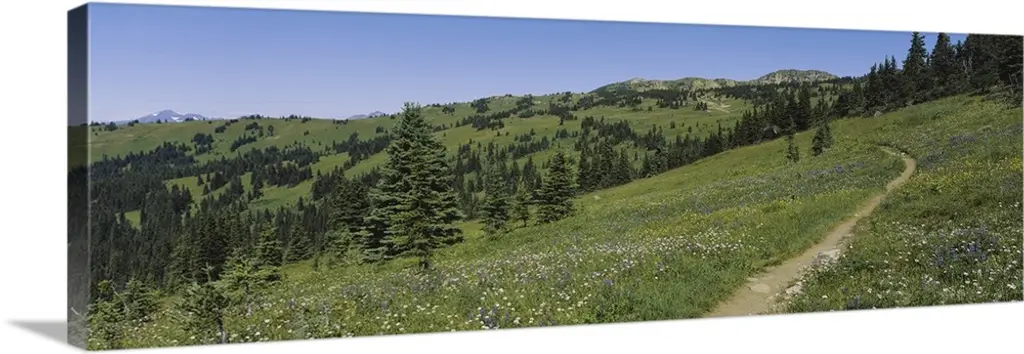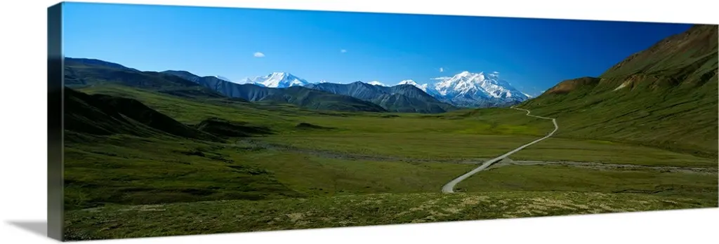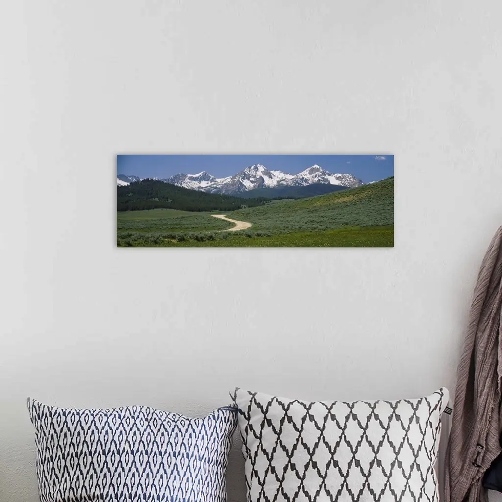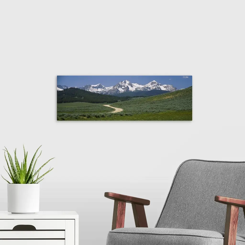 High angle view of a dirt road running through the field, Sawtooth National Recreation Area, Stanley, Idaho wall art for home and office decor. Discover canvas art prints, photos, mural, big canvas art and framed wall art in GreatBigCanvas.com's varied collections.