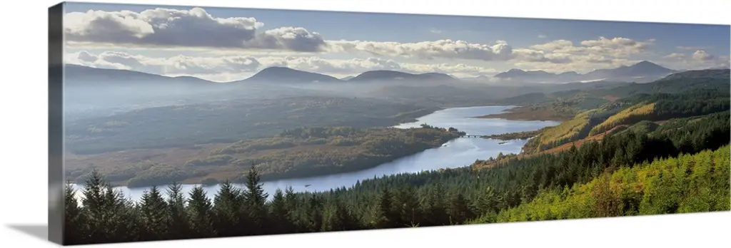 Panoramic photograph of huge rock with surrounded by forest with river in the background and mountain silhouettes in the distance under a cloudy sky.