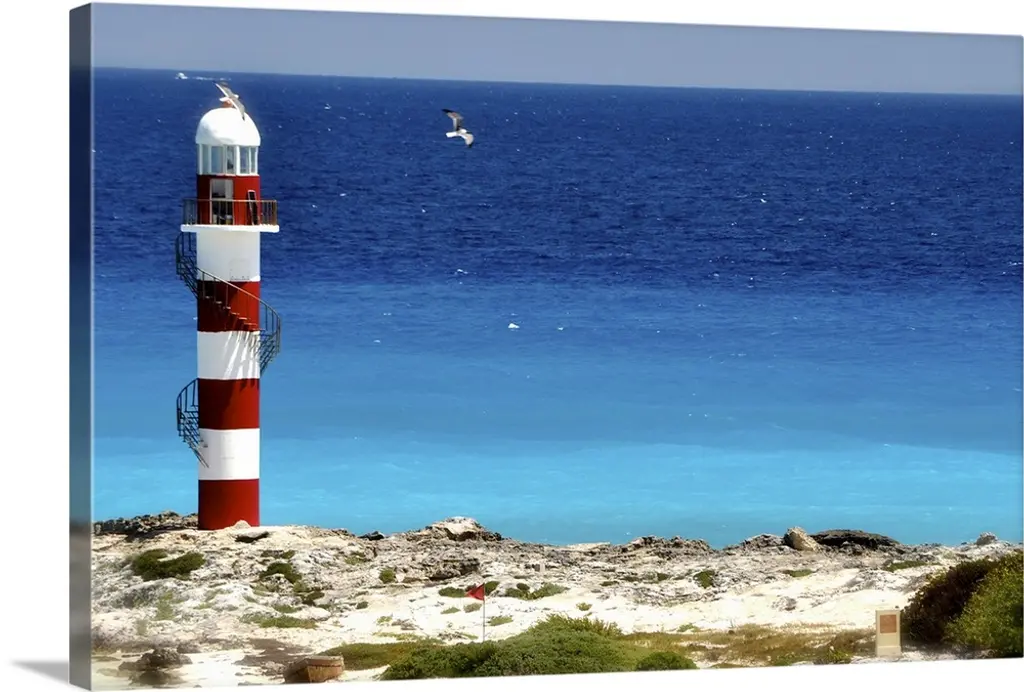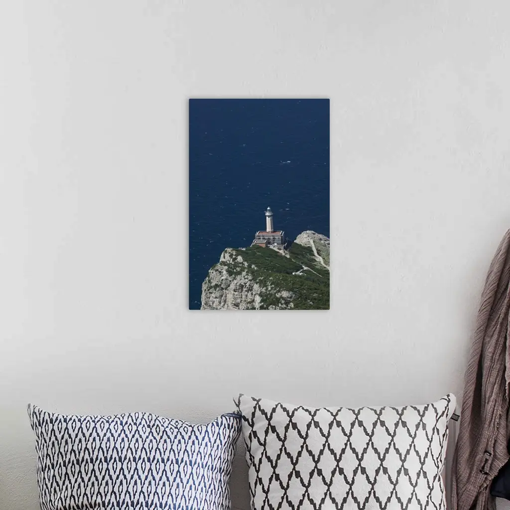 High angle view of a lighthouse on an island, Punta Carena Lighthouse, Capri, Naples, Campania, Italy wall art for home and office decor. Discover canvas art prints, photos, mural, big canvas art and framed wall art in GreatBigCanvas.com's varied collections.