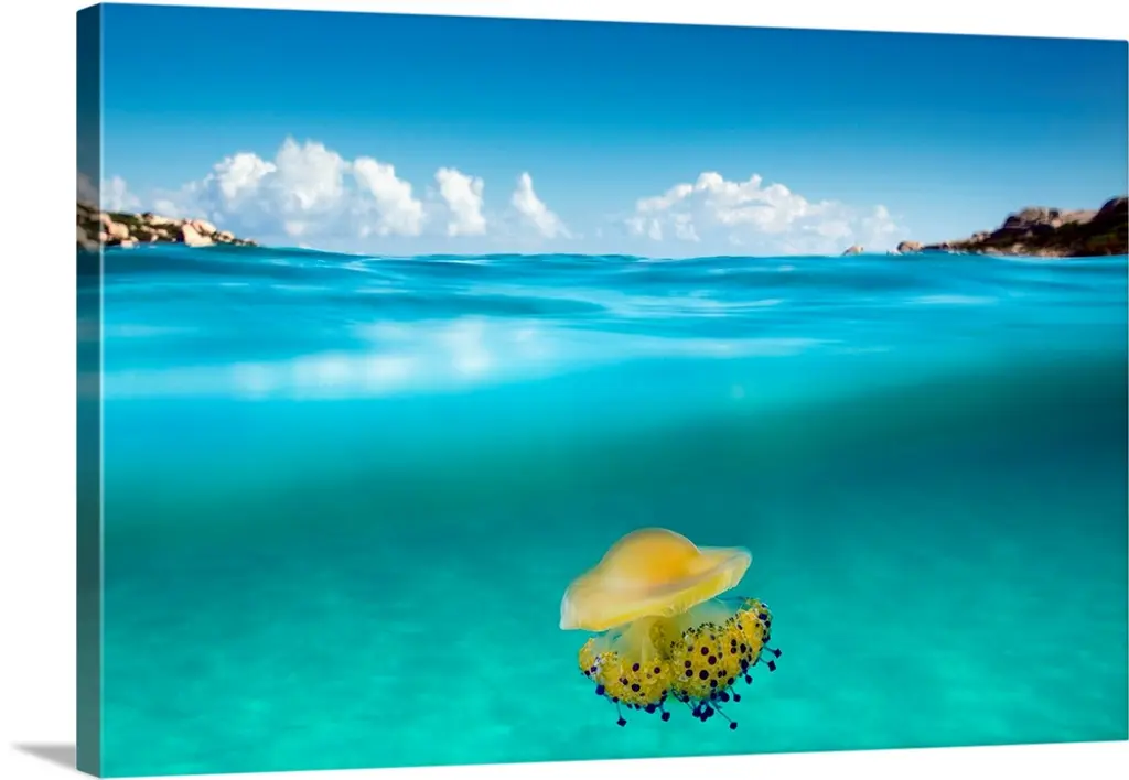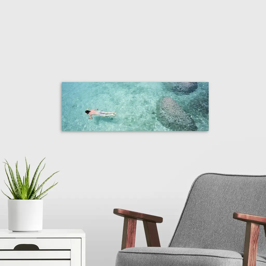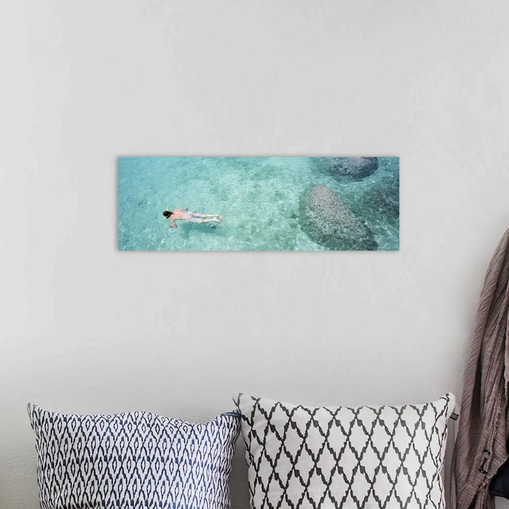 High angle view of a man snorkeling wall art for home and office decor. Discover canvas art prints, photos, mural, big canvas art and framed wall art in GreatBigCanvas.com's varied collections.