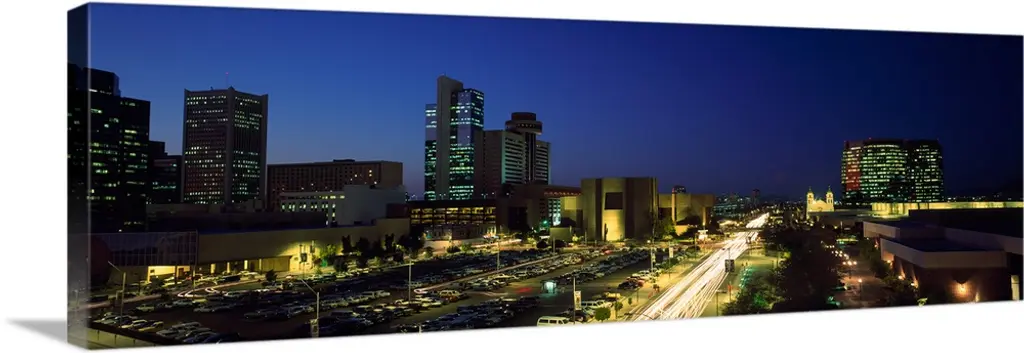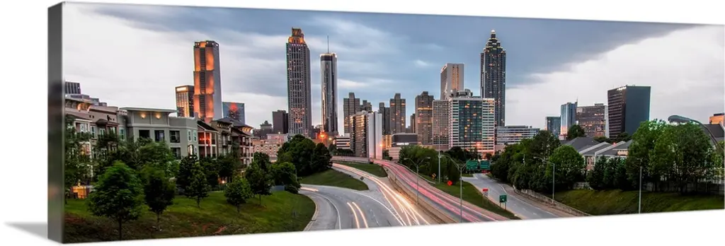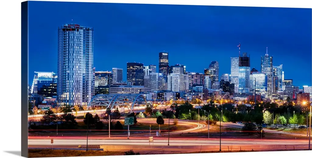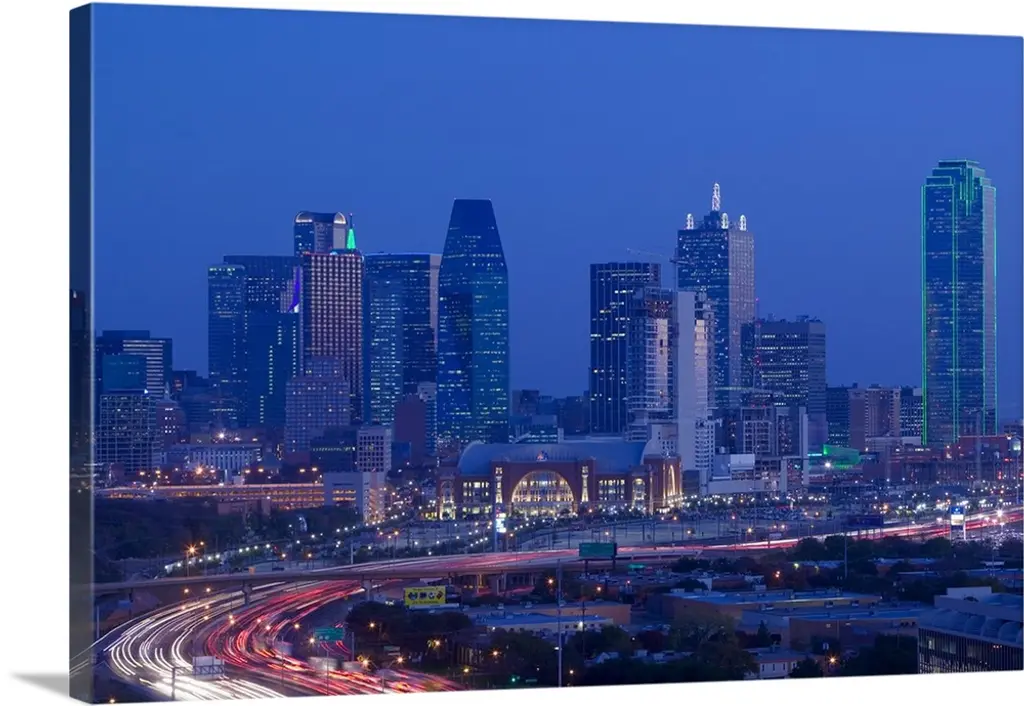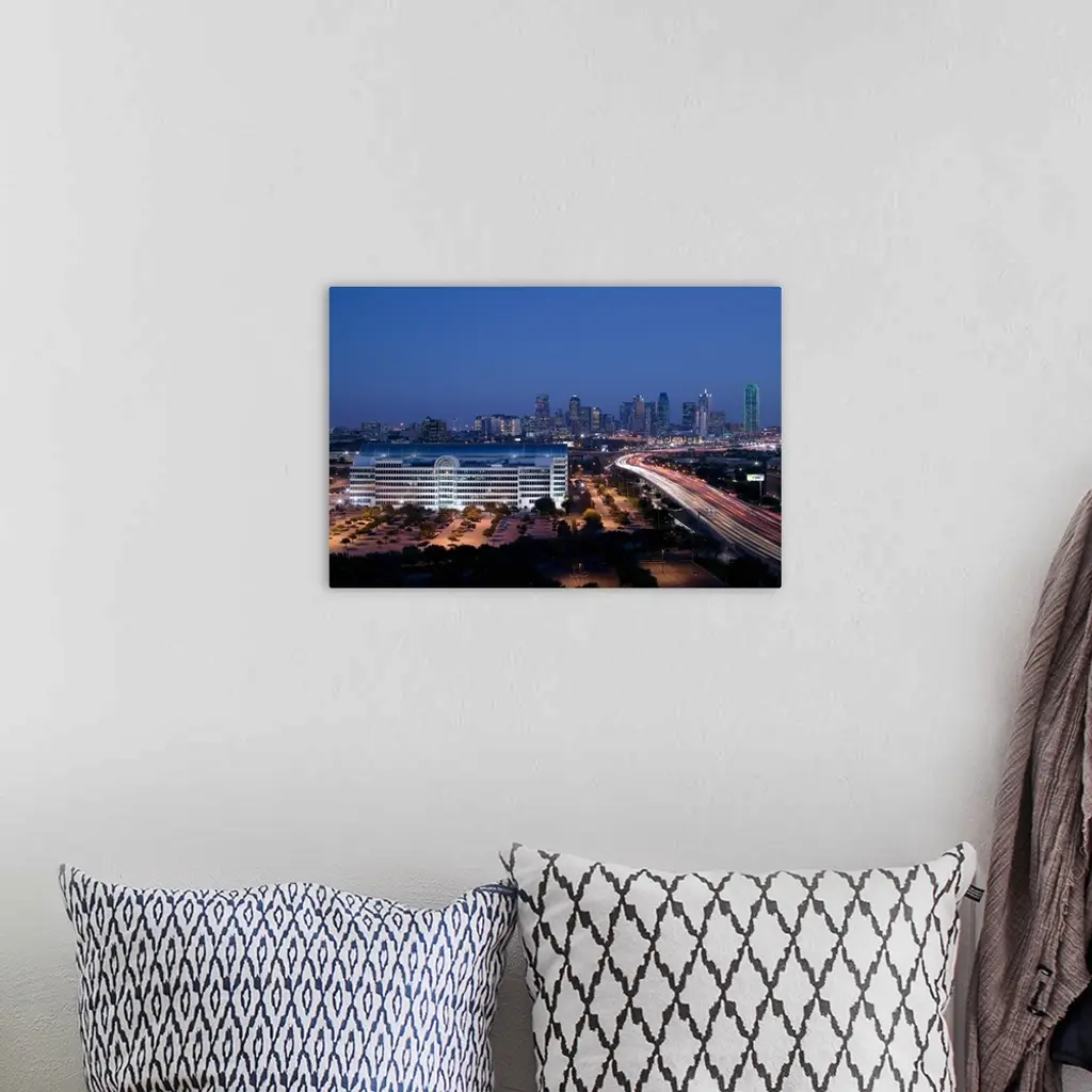 High angle view of a multiple lane highway in front of a city, Interstate-35E, Dallas, Texas wall art for home and office decor. Discover canvas art prints, photos, mural, big canvas art and framed wall art in GreatBigCanvas.com's varied collections.
