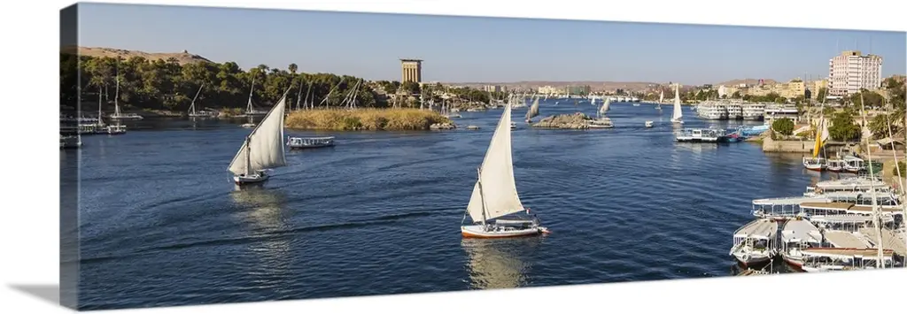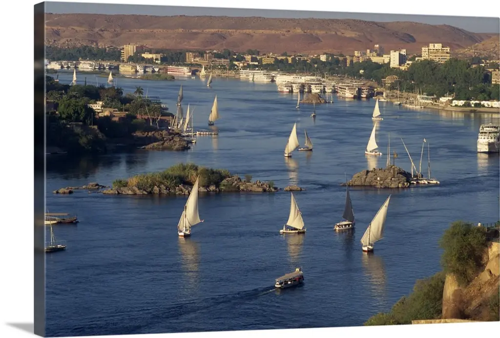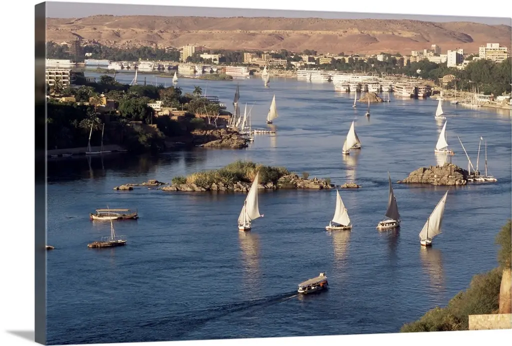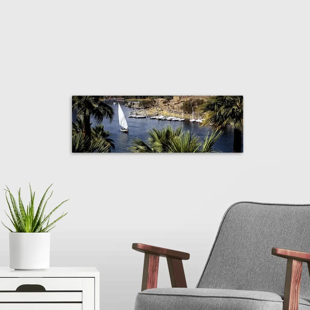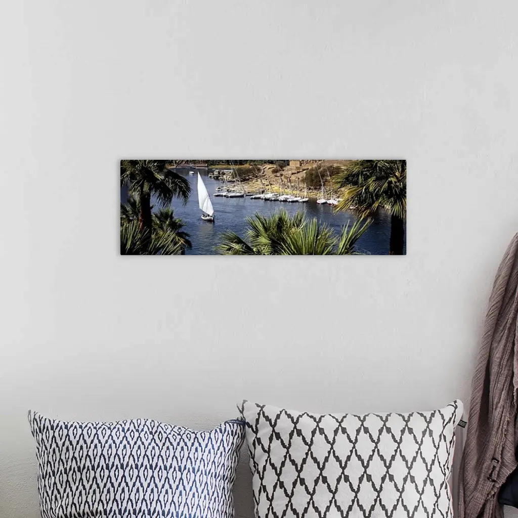 High angle view of a sailboat in a river, Nile River, Aswan, Egypt wall art for home and office decor. Discover canvas art prints, photos, mural, big canvas art and framed wall art in GreatBigCanvas.com's varied collections.