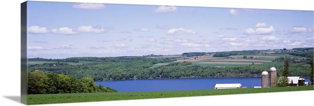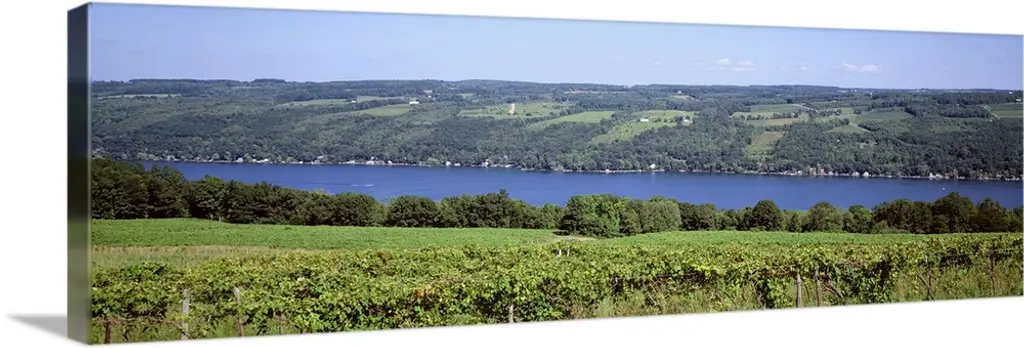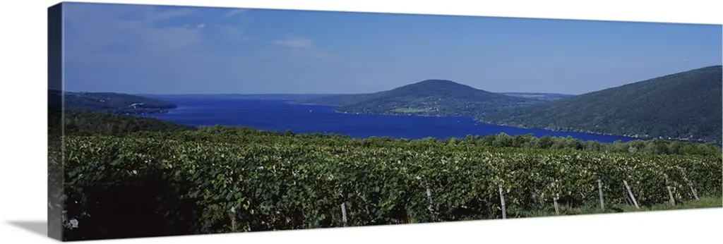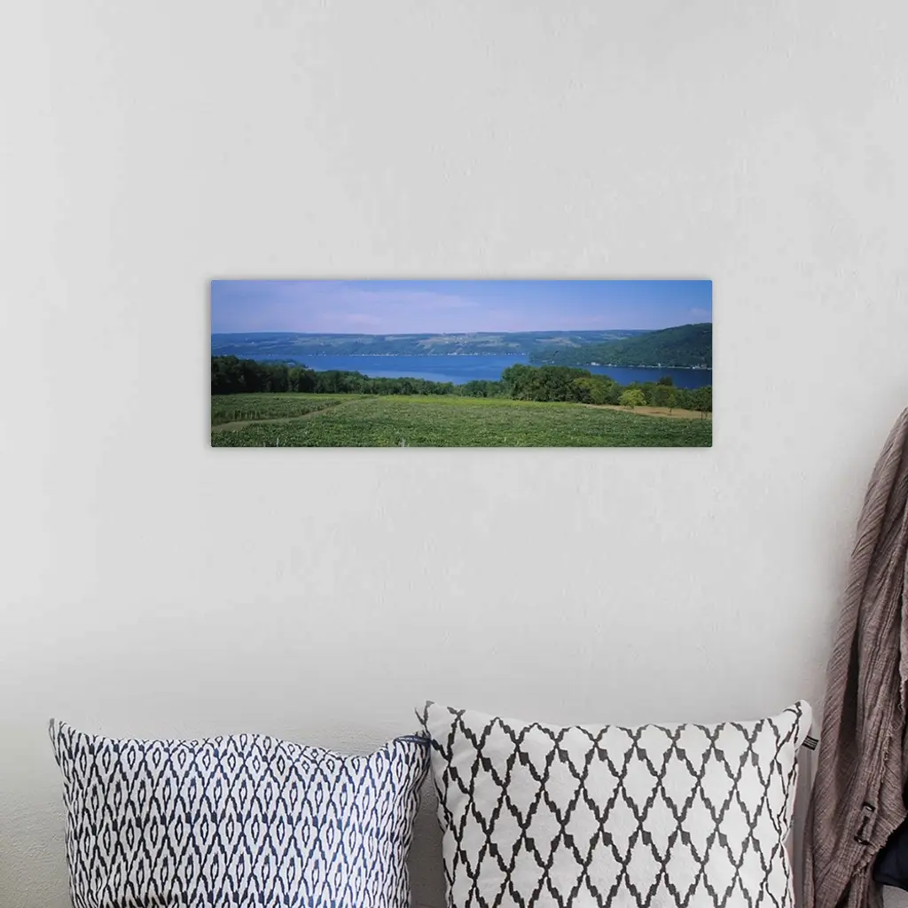High angle view of a vineyard near a lake, Keuka Lake, Finger Lakes, New York State wall art for home and office decor. Discover canvas art prints, photos, mural, big canvas art and framed wall art in GreatBigCanvas.com's varied collections.