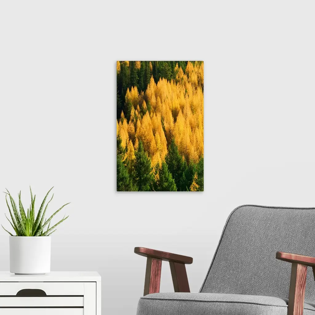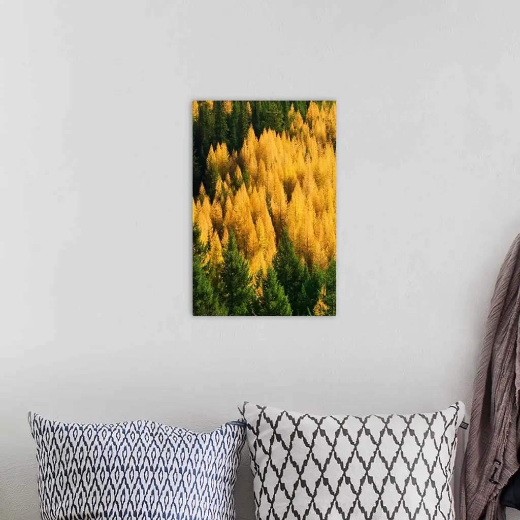 High angle view of autumn color larch trees in pine tree forest, Montana wall art for home and office decor. Discover canvas art prints, photos, mural, big canvas art and framed wall art in GreatBigCanvas.com's varied collections.