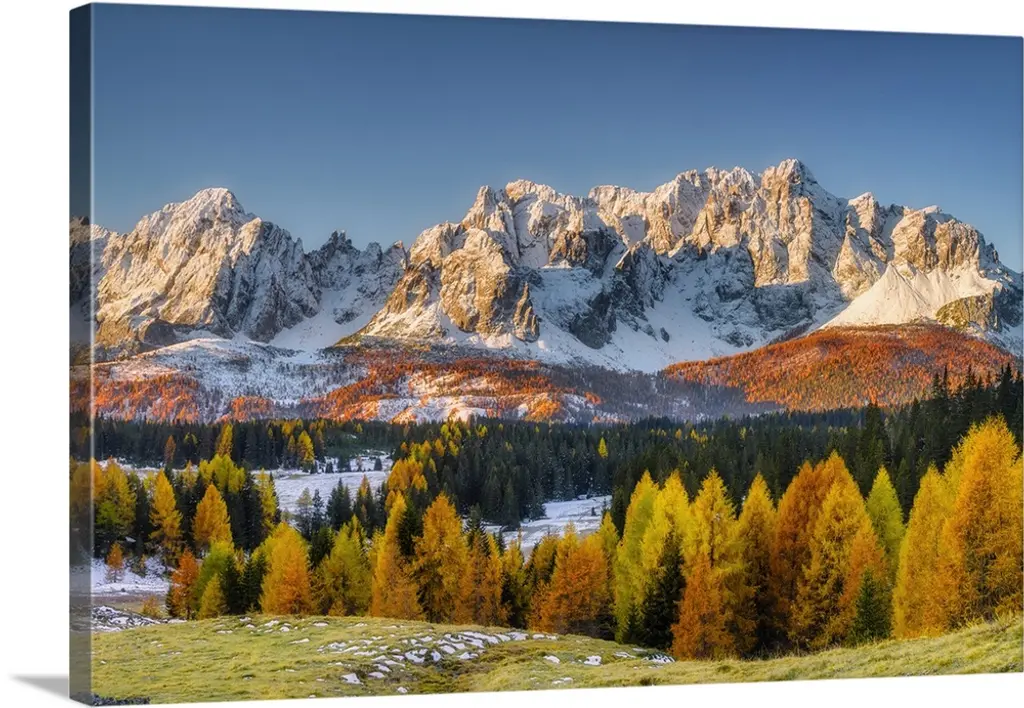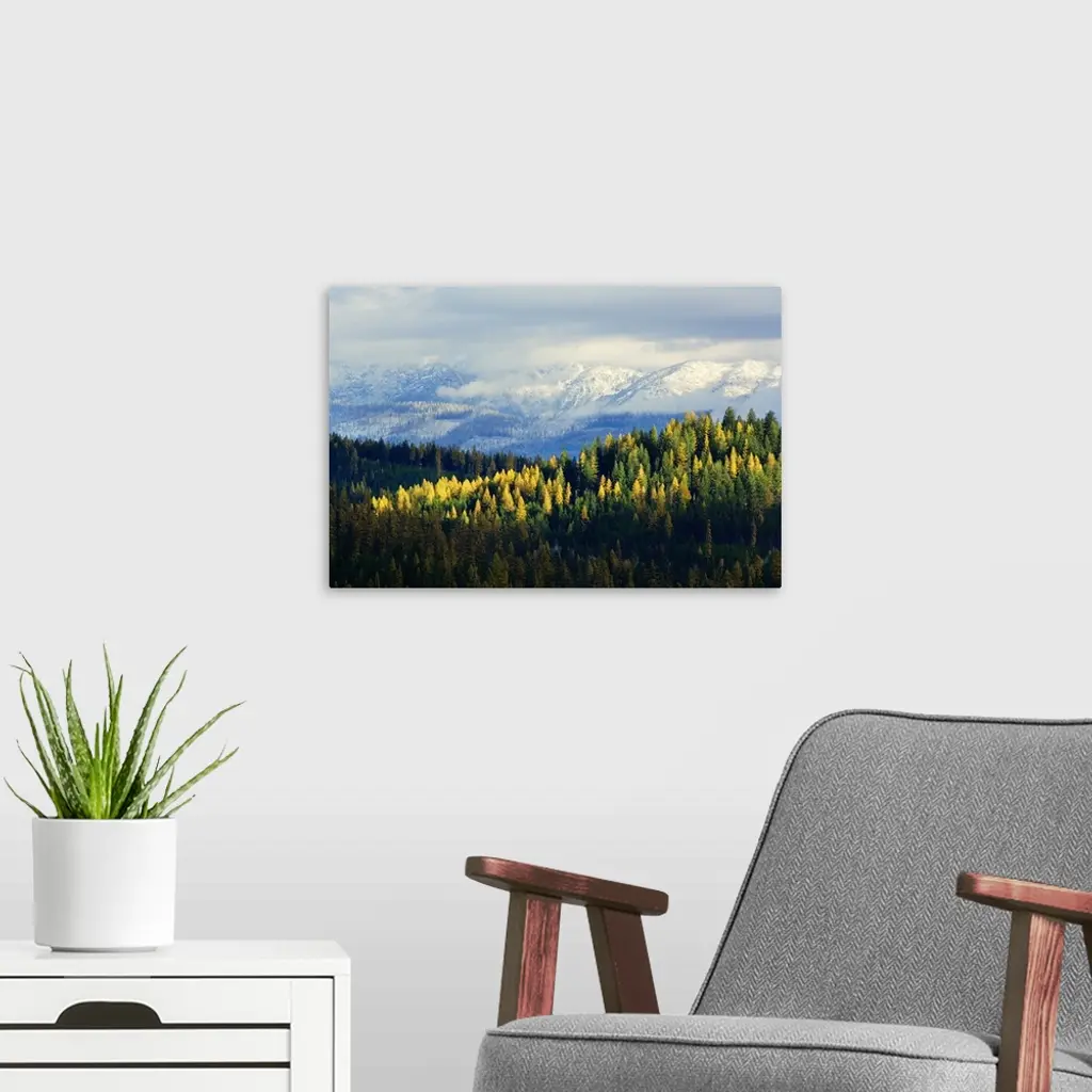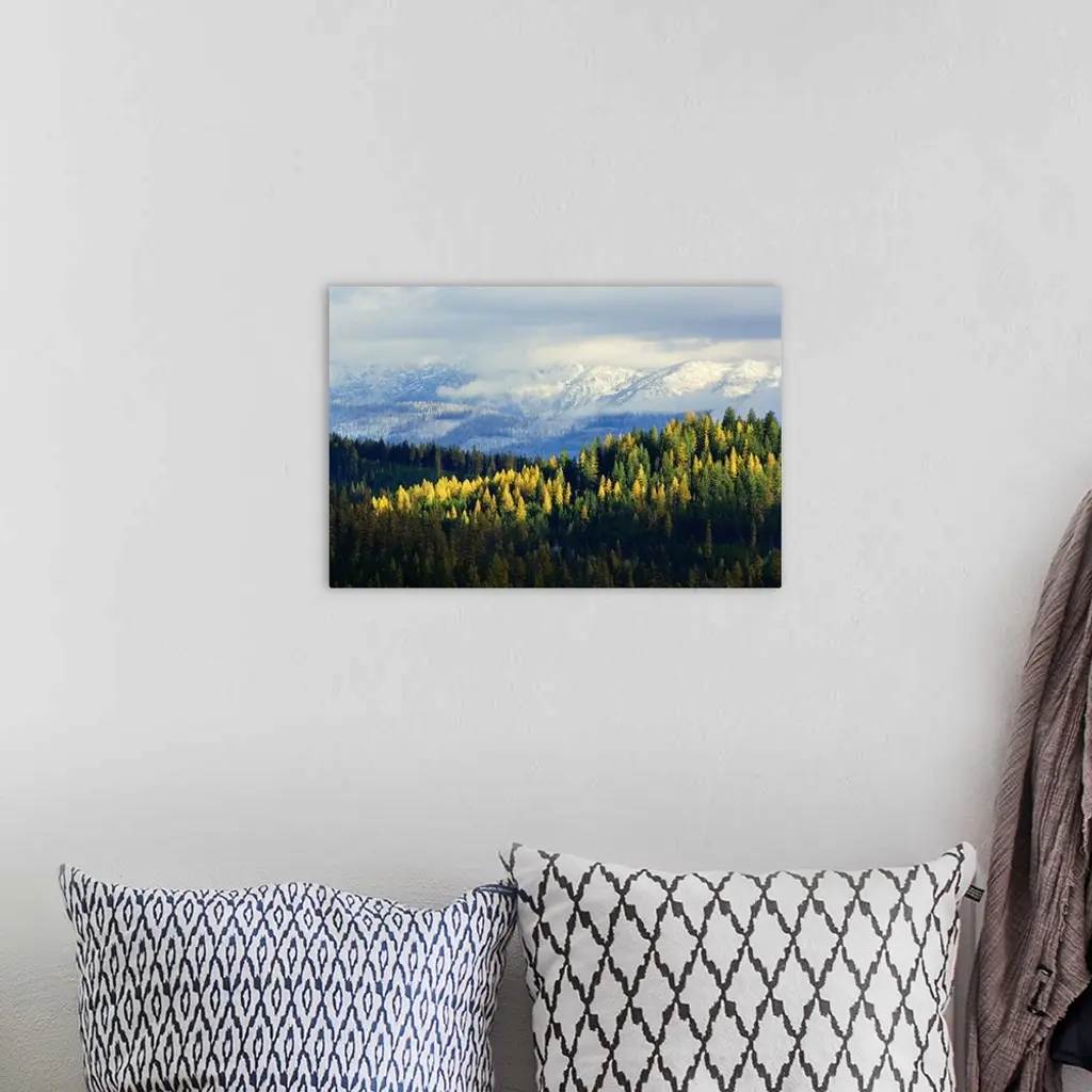 High angle view of autumn color larch trees in pine tree forest, snowcapped Whitefish Mountain Range, Montana wall art for home and office decor. Discover canvas art prints, photos, mural, big canvas art and framed wall art in GreatBigCanvas.com's varied collections.